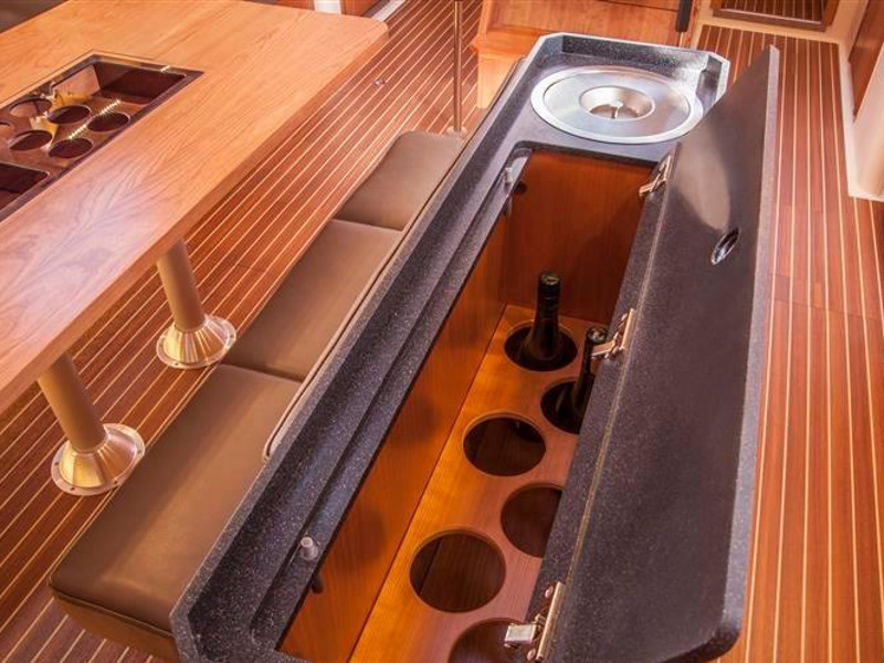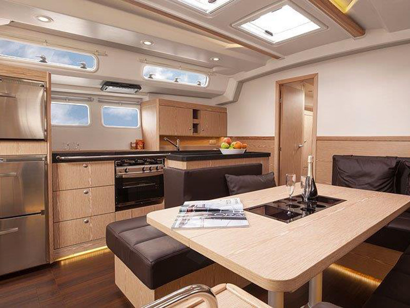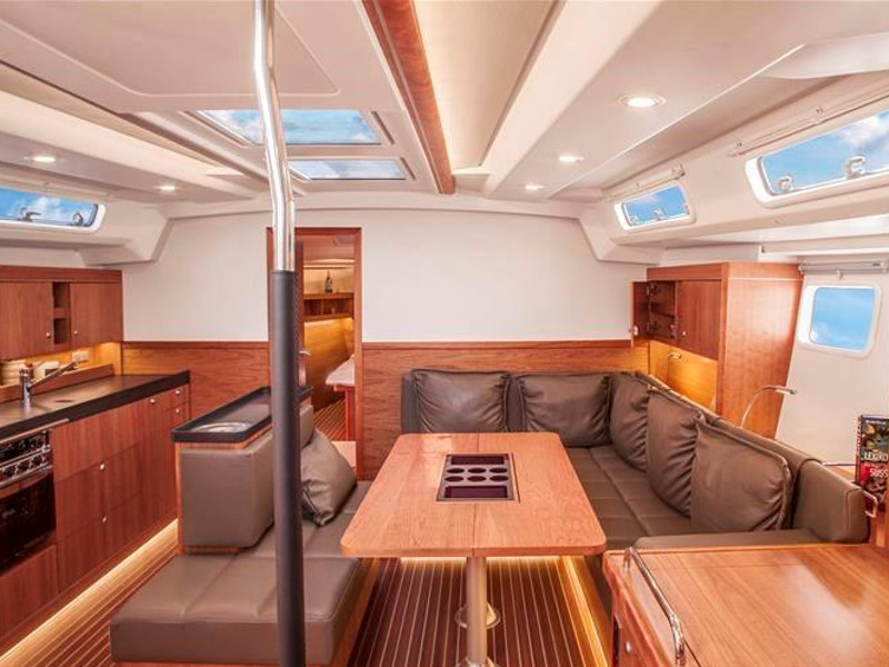 El. anchor windlass, Bathing platform, Bimini top, Cockpit shower, Cockpit speakers, Cockpit table, Dinghy, El. halyard winch, El. primary winch, Sprayhood, Steering wheel, Teak cockpit, Autopilot, Charts & pilot books, GPS plotter, Tridata, VHF radio, Battery charger, Bed linen, Electric refrigerator, Freezer, Galley equipment, Gas stove and oven, Hot water system, Inverter 12V to 220V, Radio/CD player, TV, Bow thruster, Genoa - roll, Full batten Main Sail