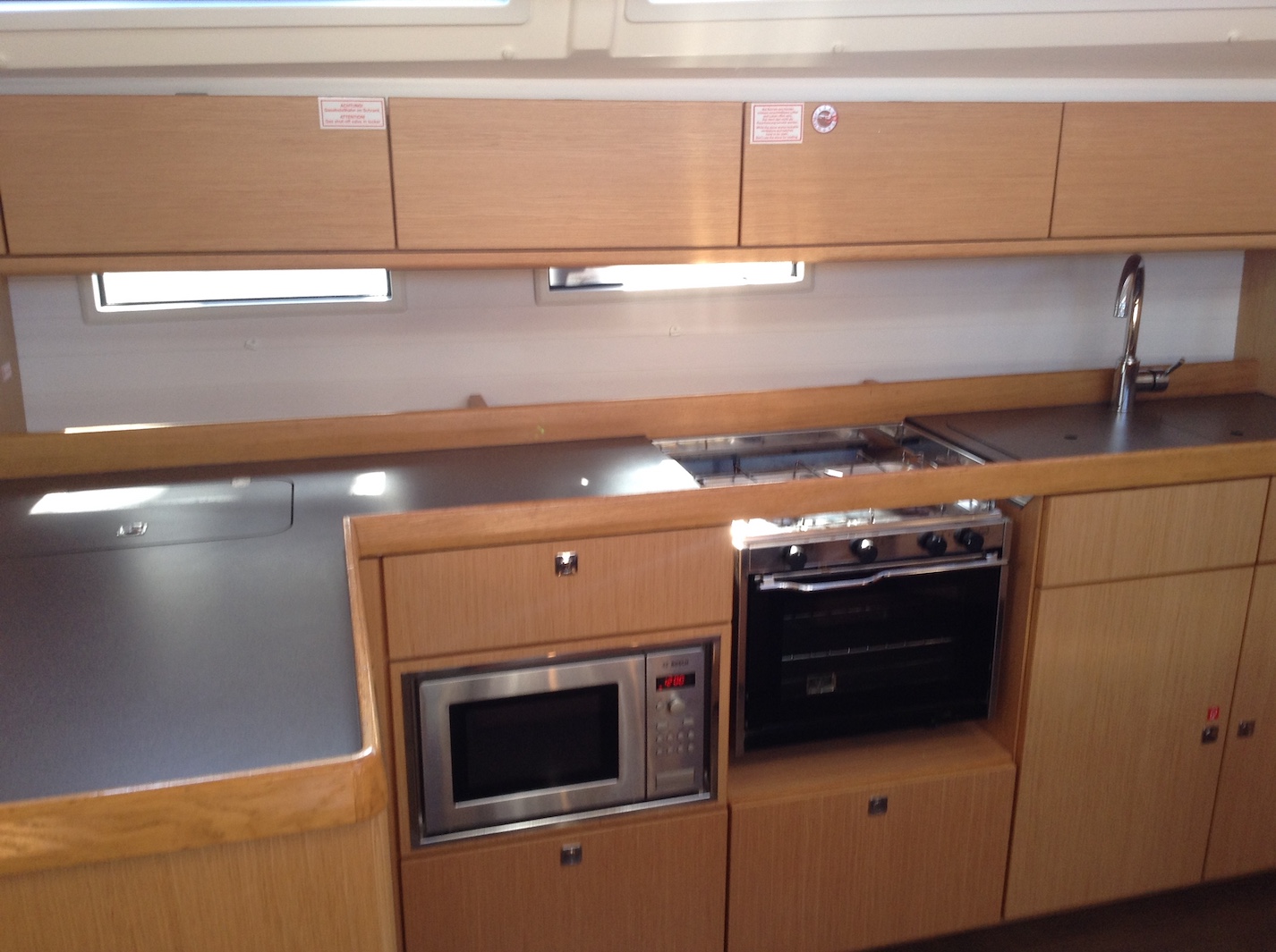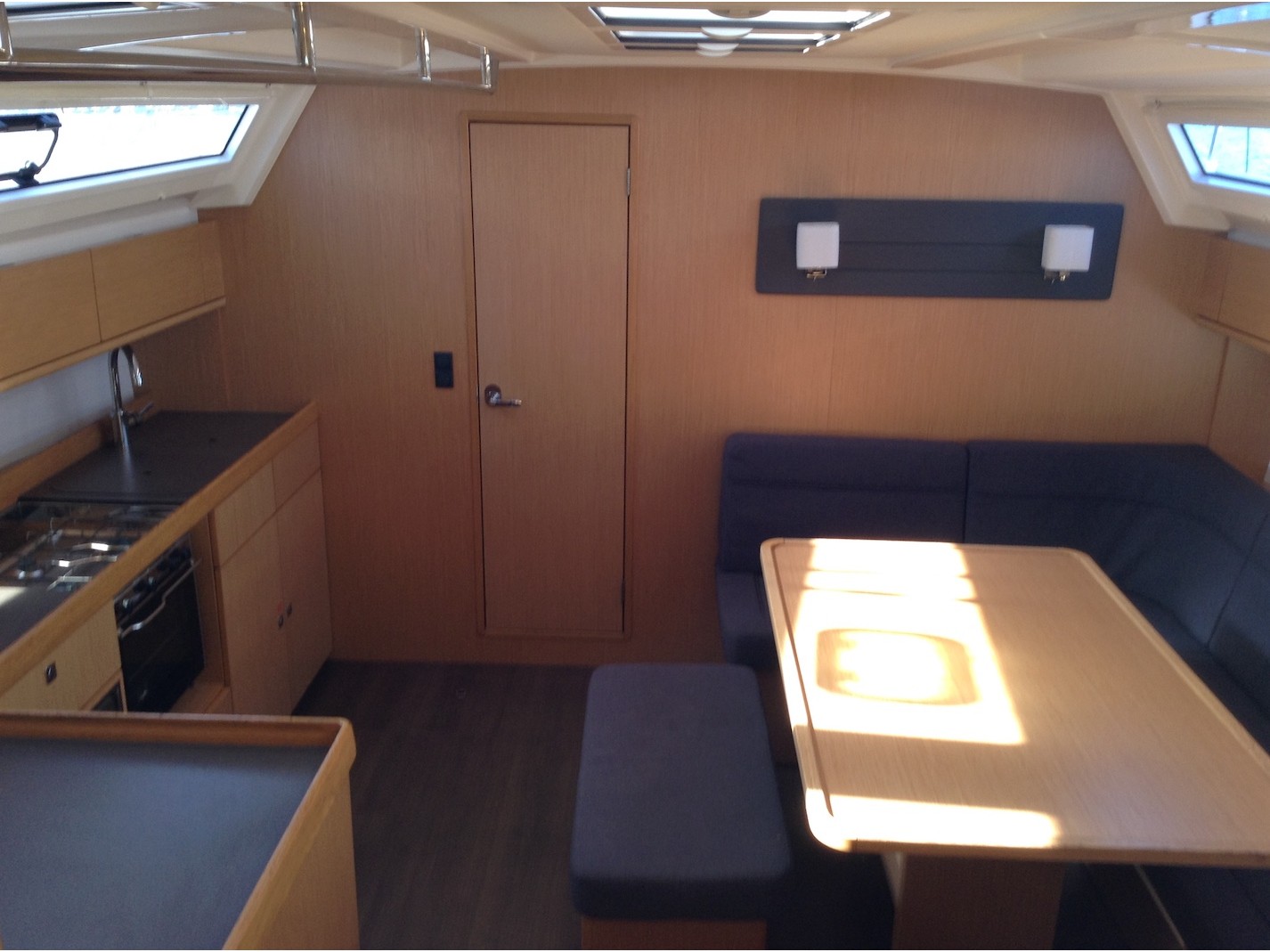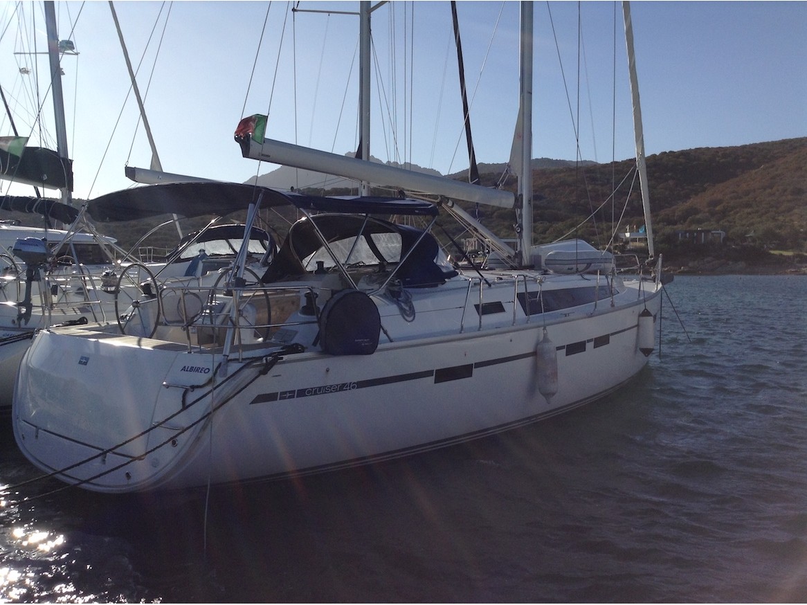 Biminitop, Furling mainsail, Autopilot, Auxiliary anchor, Auxiliary rudder, Bow thruster, CD reader, Cockpit cushions, Cutlery, Dinghy, Distress flaires, Electric bathing platform, Electric fridge, Electric windlass, First aid kit, GPS + chart plotter, Inflatable life jackets, Life jackets, Liferaft, Shore power connection, Sprayhood, VHF, Teak cockpit, Warm water, Wind instruments, Electric toilets, Cockpit Speakers