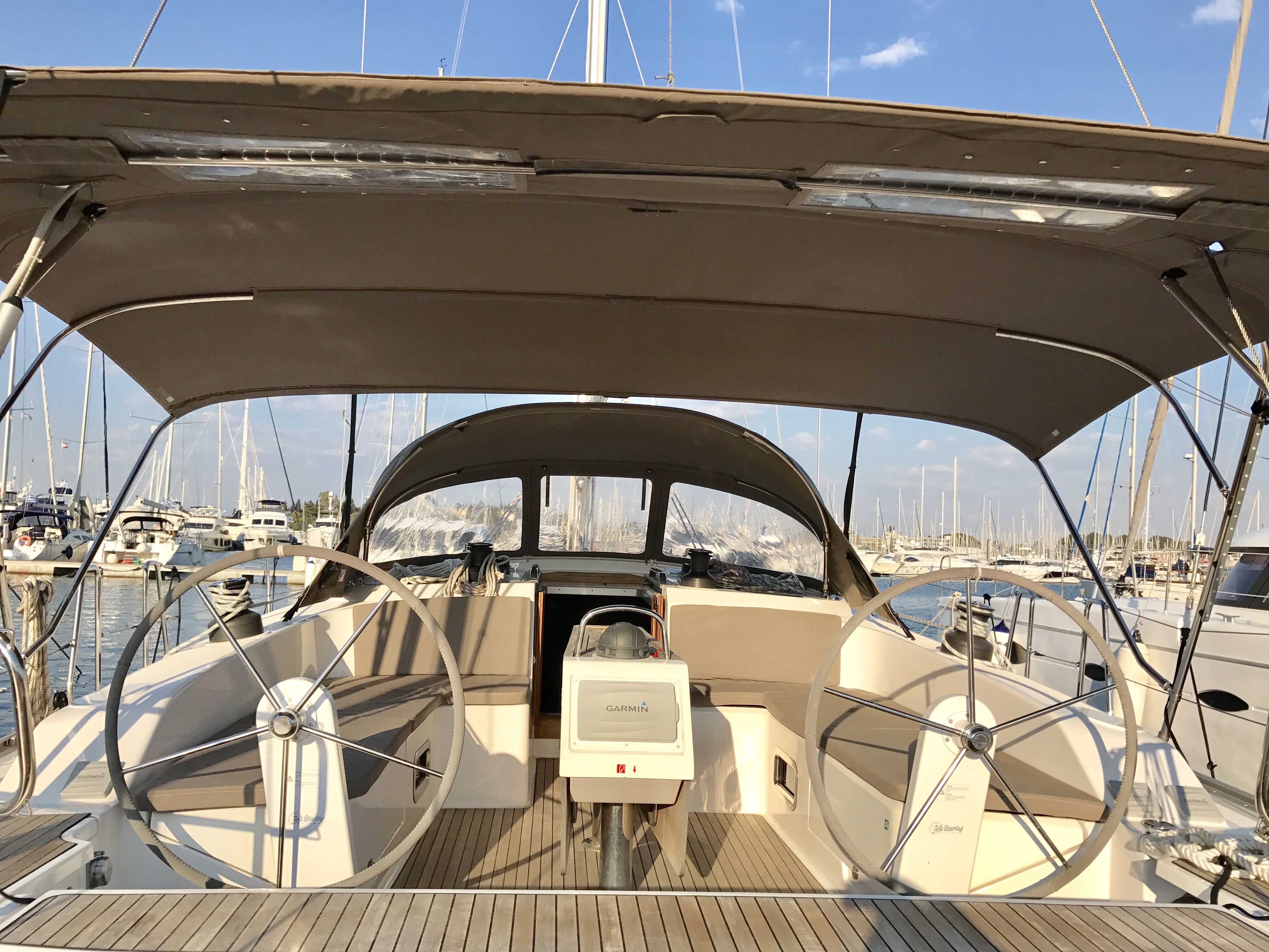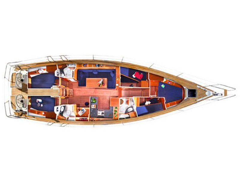 Dinghy, Bed linen, Showering towels, Bimini top, Bow thruster, Double steering wheel, Spray hood, Autopilot, Chart plotter, GPS, VHF Radio, Furling (Roll) main sail, 2 tablet devices, Inverter 12/220 V, Unlimited free WiFi, Automatic shower drains, Sunbeds at Bow, Gangway, Inverters 3000 VA - 300 VA, Solar panels, Teak in cockpit and bathing platform, Additional water tank 150 L
