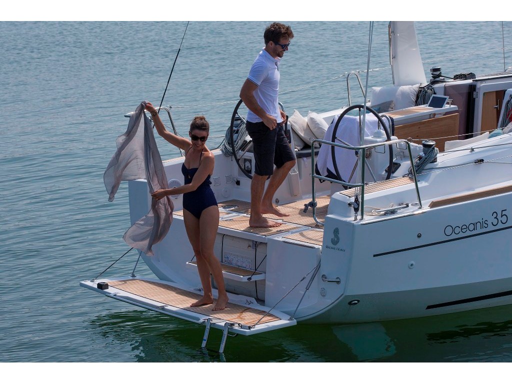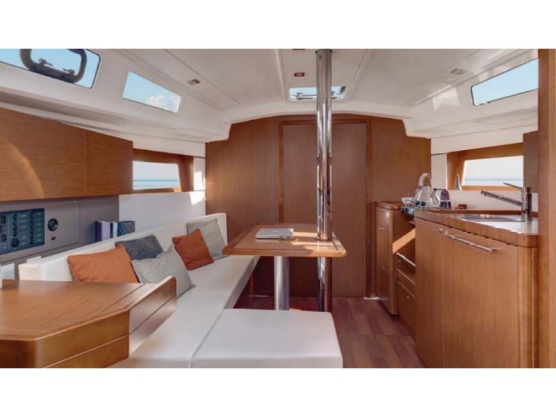 Autopilot, Battery charger, Bimini, Cockpit shower, Depth speed, LCD TV with DVD or USB, Electrical bilge pump, Electrical water pump, Electric windlass, GPS chartplotter in cockpit, Hot water, Motor battery, Outside speakers, Radio with CD or MP3 player, Refrigerator 12V, Roll main sail, Service battery, Sprayhood, VHF, Wind, Anchor + chain, Black ball, Black cone, Boat hook, Bucket, Deckbrush, Dinghy, Emergency helm, Funnel, Gangway, Gas bottles, Jerrycan for fuel, Jerrycan for water, Lifebuoy with light, Oars for dinghy, Outboard engine holder, Pump for dinghy, Radar reflector, Round fenders, Second anchor + chain, Shore power line, Skipper seat, Sponge, Water hose, Barometer, Binocular, Clock, Divider, Handbearing compass, Navigation charts set, Navigation ruler, Pen and pencil set, Pilot book, Triangle, Bosun chair, Distress flares box, Fire extinguishers, First aid kit, Flash lamp, Foghorn, Tool set, Windlass handle, Windlass remote control, Life jackets, Flat fenders, Self Tacking Jib, WiFi, Bathing platform