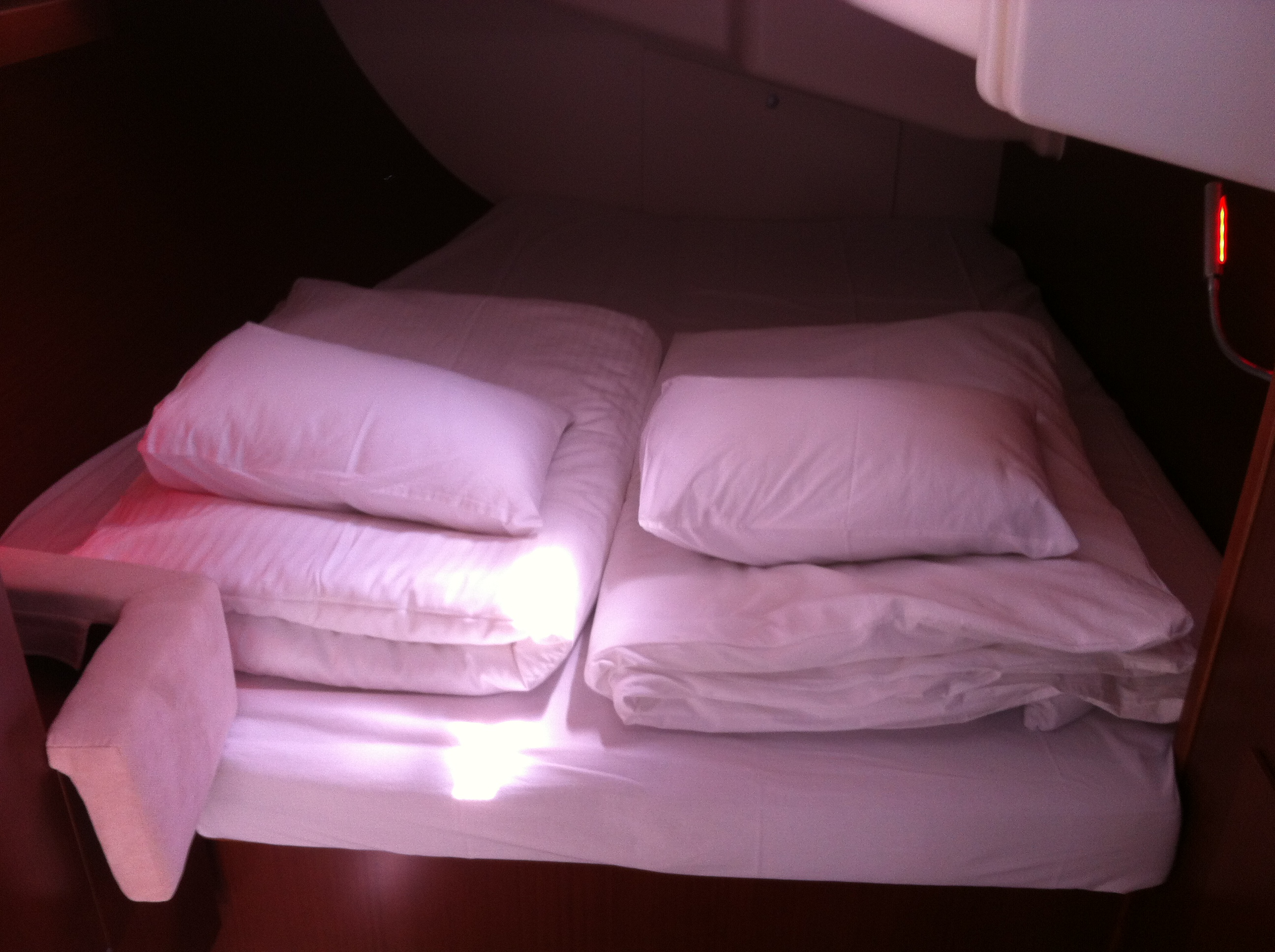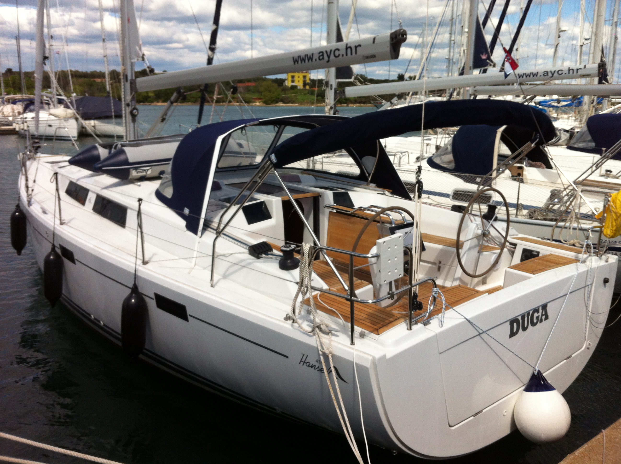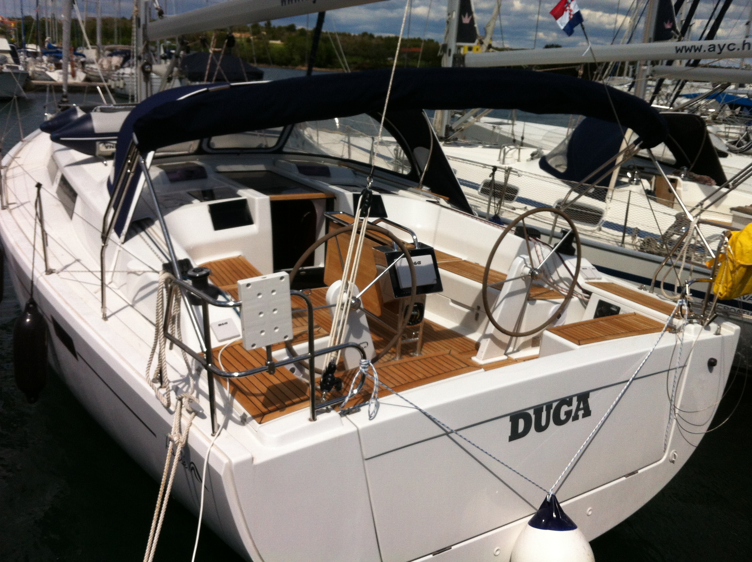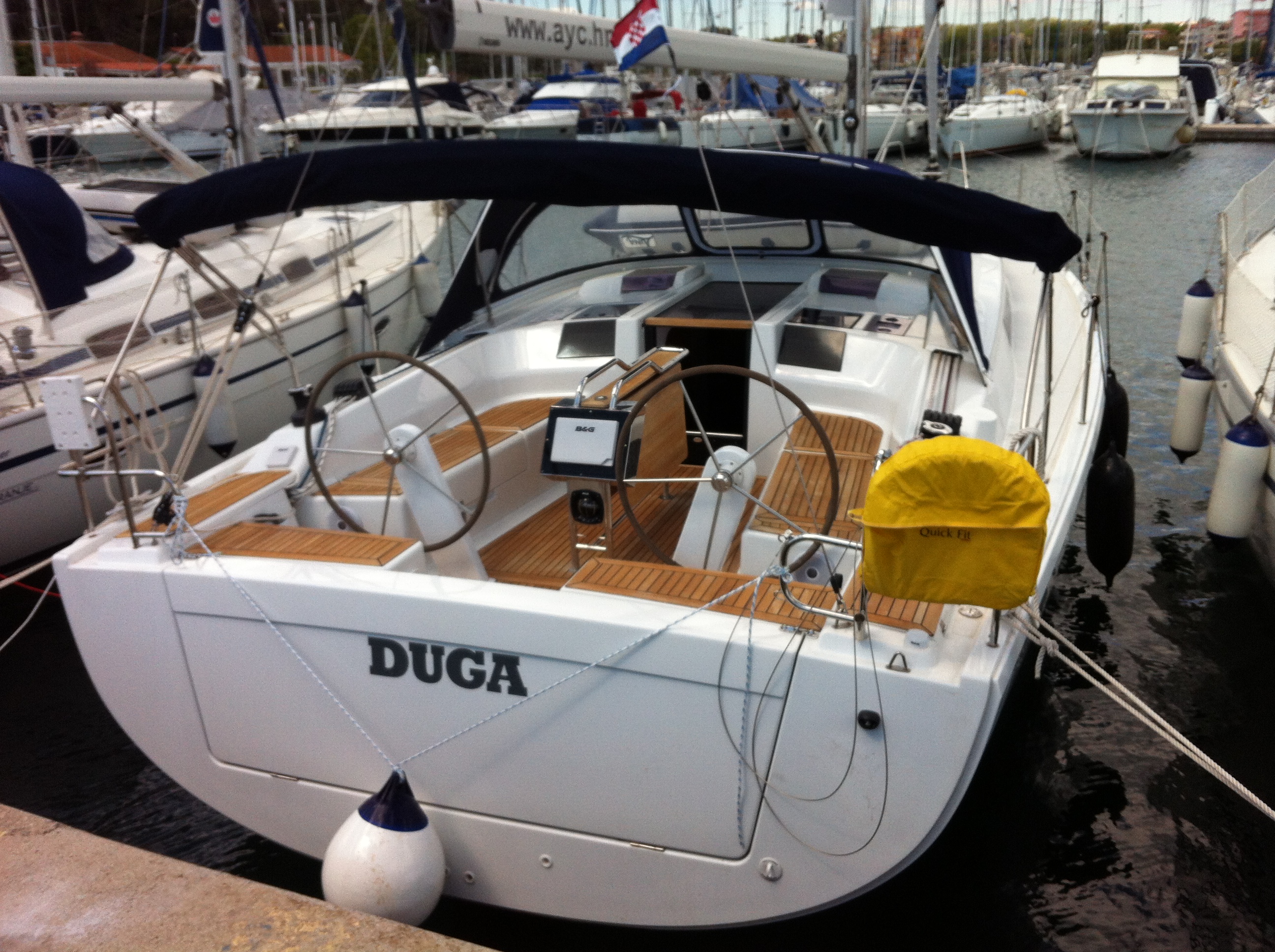 Autopilot, Battery charger, Bimini, Cockpit shower, Depth speed, Electrical bilge pump, Electrical water pump, Electric windlass, GPS chartplotter in cockpit, Hot water, Motor battery, Outside speakers, Radio with CD or MP3 player, Refrigerator 12V, Roll main sail, Service battery, Sprayhood, VHF, Wind, Anchor + chain, Black ball, Black cone, Boat hook, Bucket, Deckbrush, Dinghy, Emergency helm, Funnel, Gangway, Gas bottles, Jerrycan for fuel, Jerrycan for water, Lifebuoy with light, Oars for dinghy, Outboard engine holder, Pump for dinghy, Radar reflector, Round fenders, Second anchor + chain, Shore power line, Skipper seat, Sponge, Water hose, Barometer, Binocular, Clock, Divider, Handbearing compass, Navigation charts set, Navigation ruler, Pen and pencil set, Pilot book, Triangle, Bosun chair, Distress flares box, Fire extinguishers, First aid kit, Flash lamp, Foghorn, Tool set, Windlass handle, Windlass remote control, Life jackets, Flat fenders, LCD TV with DVD or USB, Self Tacking Jib, WiFi, Bathing platform