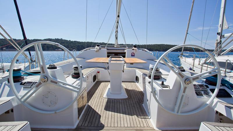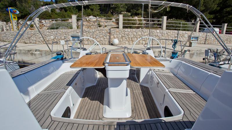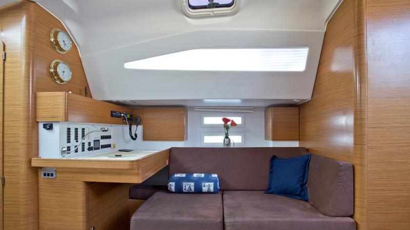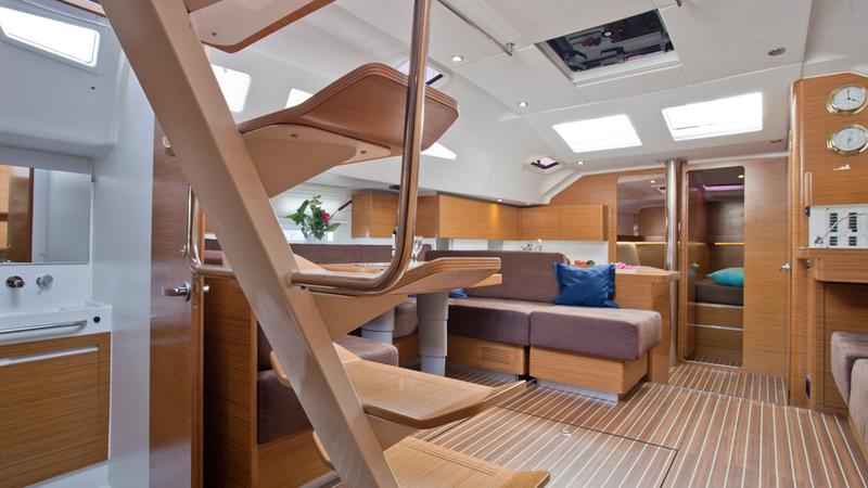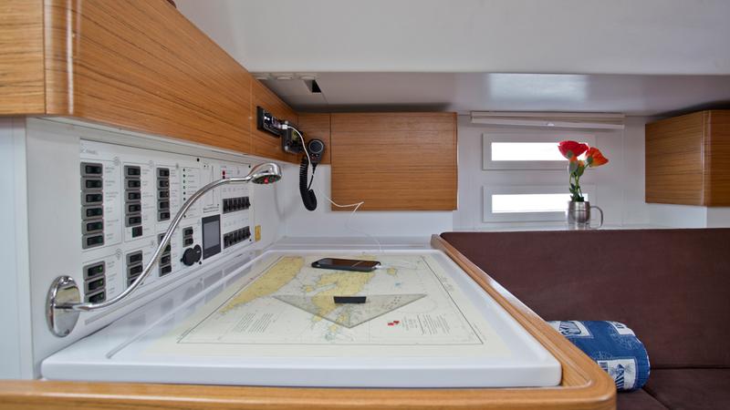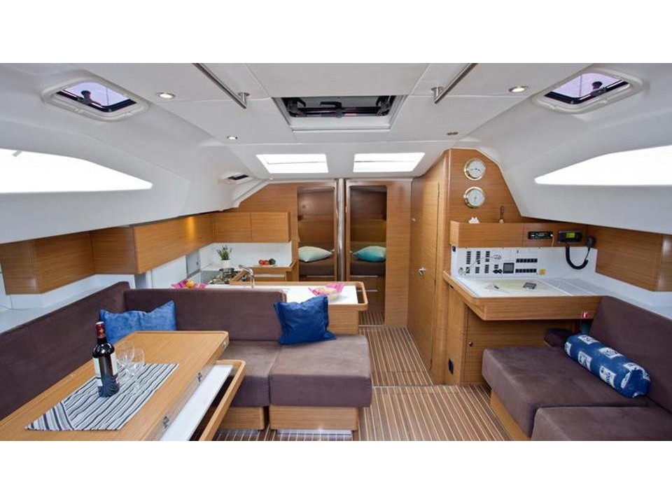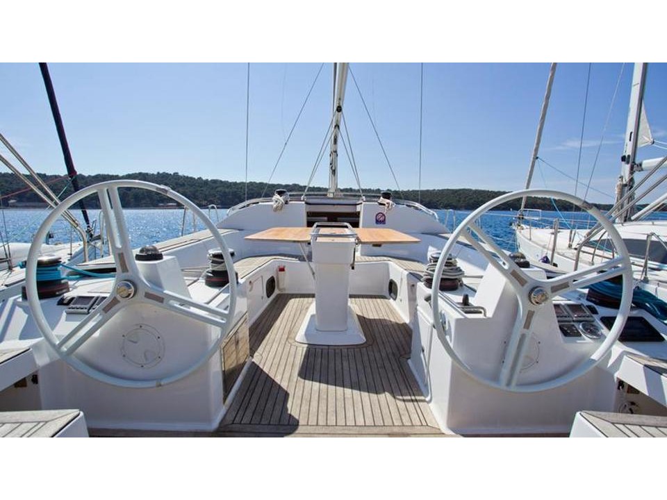 Teak on cockpit floor, cockpit seats and bathing platform, bathing platform electric lowerable , Bimini top, Boat hook, Cockpit cushins, Cockpit shower (cold/hot), Cockpit table, Dinghy, Electric anchor windlass remote controled, Emergency tiller, Fenders, Main anchor + chain, Main sail roll system, Mooring ropes, Roll genoa, Second anchor , Sprayhood, Steering wheel, storm anchor, Autopilot, Depth instrument, Divider, GPS + plotter in the cocpit, hand bearing compass, Harbour guides, Log/speed instrument, Main compass, Navigation charts, Radar reflector, VHF radio with DSC module with AIS receiver, Windex, Wind instrument, 2 gas bottles, Battery charger, Bow thruster, FM radio USB, Galley equipment, Gas stove, Hot water, Inverter 12V/220V, Set of tools, Shore connection 220 V, Speakers in cockpit, teak in cocpit, Waste water tank, Fire extinguisher, First aid kit, Fog horn, Life belts (quantity), Life jackets (quantity), Life raft, Signal flares and torches, Wire cutter, Webasto central heating system, Electric refrigerator, Wifi 1 GB