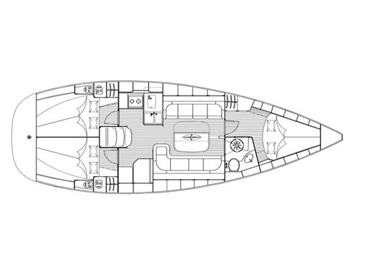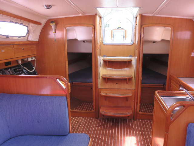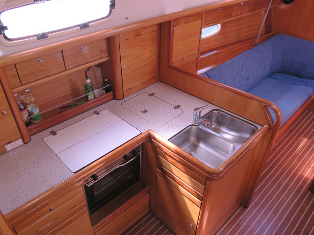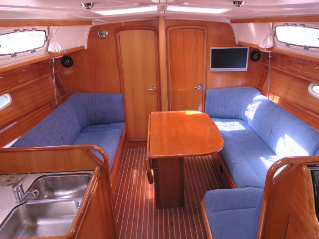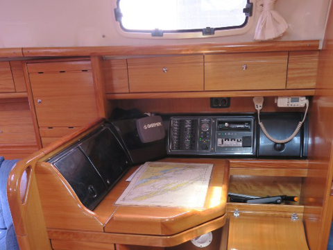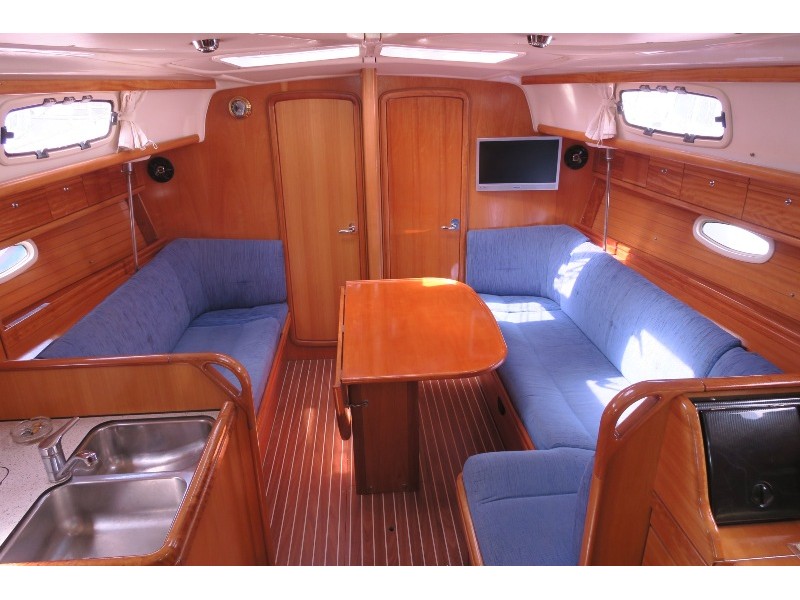 Genoa Furling, New Sails 2017, Wheel Steering, Autopilot, Depth Gauge, GPS Chartplotter, Log/Speedo, Main Deck Compass, VHF, Cockpit Speakers, Radio/CD, TV, Heating, Hot Water System, Bimini, Deck Shower, Electric Windlass, Cooker with oven, Cutlery, Refrigerator, Sinks, Engine Battery (in Ah.), Service Battery (in Ah.), Shore Power Connection, Dinghy LOA, Auxiliary anchor, Calibrated anchor chain, Dan Buoy, Distress flares, Fire extinguisher, First aid kit, Floating line, Main anchor, Safety harness, Echo Sounder, Furling mainsail, Life jacket, Linen, Nautical charts and nautical guide, Navigation kit, Pillows and blankets, Speedometer, Spray hood