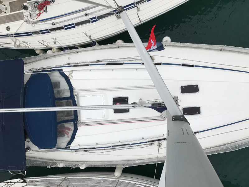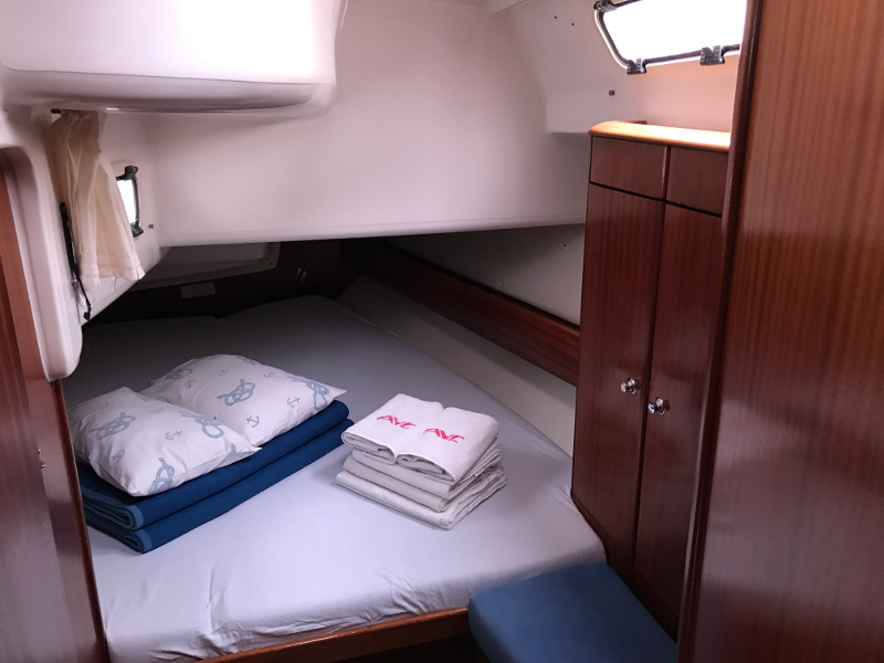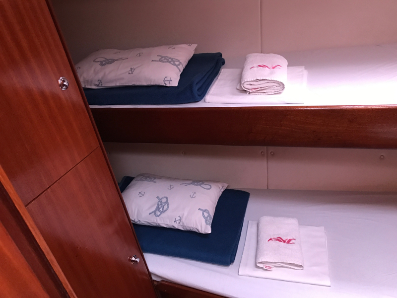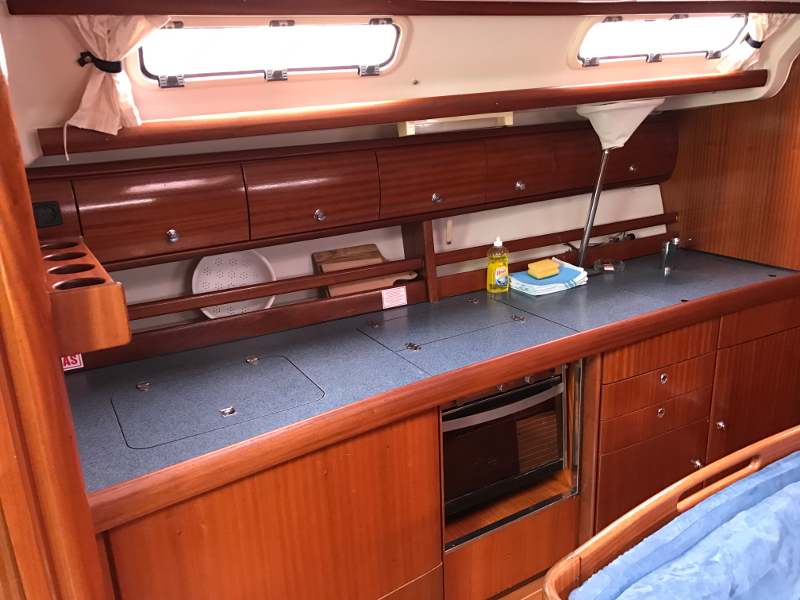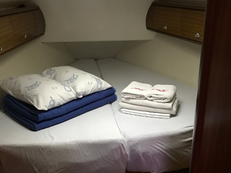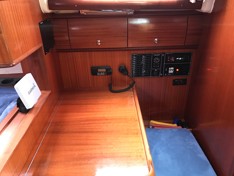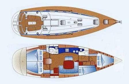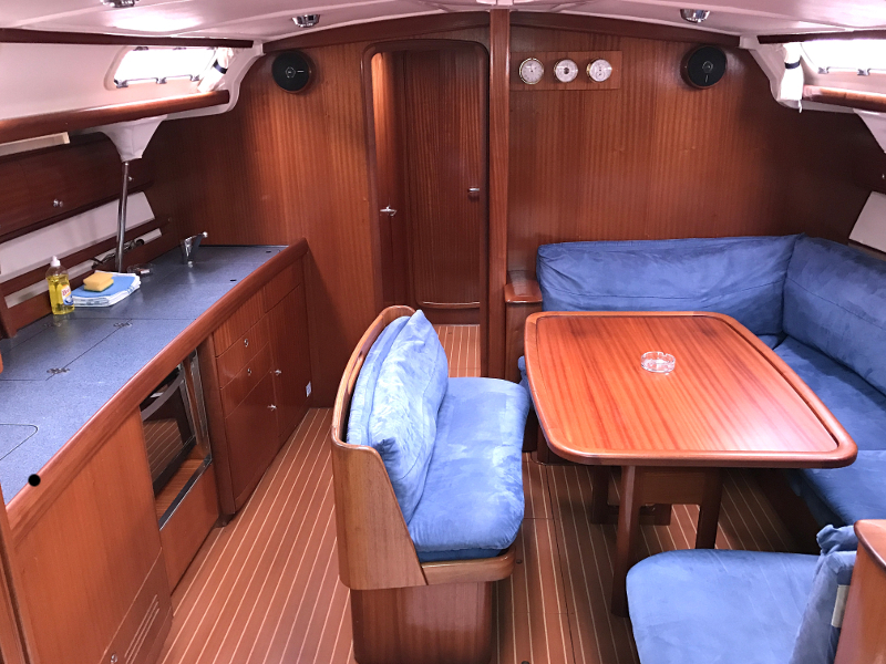 Bow thruster, Hot Water System, Cool Box, Rollgenoa, Spray hood, Dinghy Inflatable, Sinks, Cockpit Speakers, Deck Shower, VHF, First aid kit, Navtex, Autopilot, GPS, Refrigerator, Shore Power Connection, Navigation kit, Fire extinguisher, Bathing Platform, Electric Windlass, Service Battery (in Ah.), Main Deck Compass, In-Mast Furling, Radio/CD, Sinks (num.), Engine Battery (in Ah.), Steering, Life jacket
