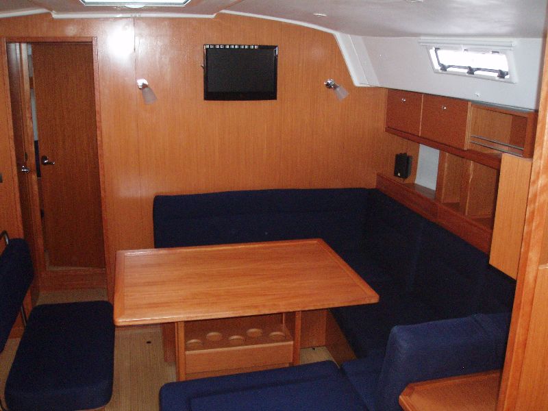Navigation kit, Refrigerator, Calibrated anchor chain, Furling mainsail, Cool Box, Genoa Furling, Steering Wheel (SW)/Tiller (T), VHF, Main anchor, Speedometer, Depth Gauge, Anchor, Shore Power Connection, Log/Speedo, Nautical charts and nautical guide, Cockpit Speakers, Lifebuoy, Bimini, Pillows and blankets, Sinks, Electric Windlass, Engine Battery (in Ah.), Distress flares, Life jacket, First aid kit, Wheel Steering, Cutlery, Dinghy Inflatable, Auxiliary anchor, Hot Water System, Echo Sounder, Cooker with oven, Safety harness, Spray hood, Bow Thruster, Main Deck Compass, Liferaft, Deck Shower, Radio Cass/Radio/CD Player with Speakers in Saloon & Cockpit, Autopilot, Service Battery (in Ah.), Fire extinguisher, GPS Chartplotter, Linen, Floating line, Bathing Platform, Anti rust spray, Barometer, Binoculars, Boat/Engine/Instruments Manuals, Boat hook, Clock, Dinghy oars, Divider & Parallel ruler, Electrical bilge pump, Engine & Gear oil, Engine spares, Flags C & N, Flippers and mask, Fog horn, Gas bottles, Heelmeter, Mooring lines 10/20/50 meters, Portable hand pump, Sail & Dinghy repair kit, Sea anchor, Spare batteries, Spare navigational bulb, Tool box, Torch, Wire cutter, Microwave, Electric toilet, inverter, TV, Solar Panel