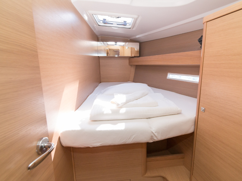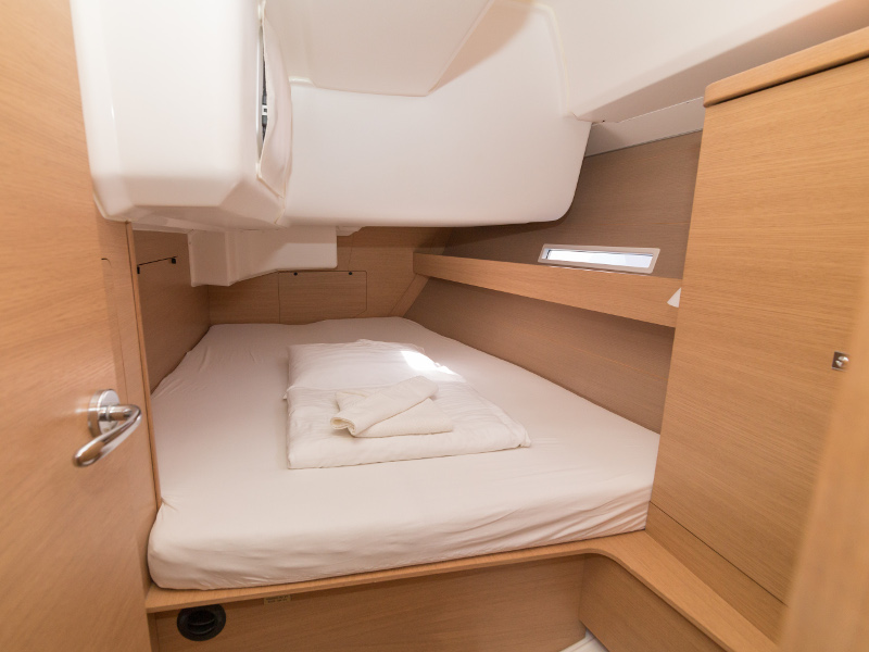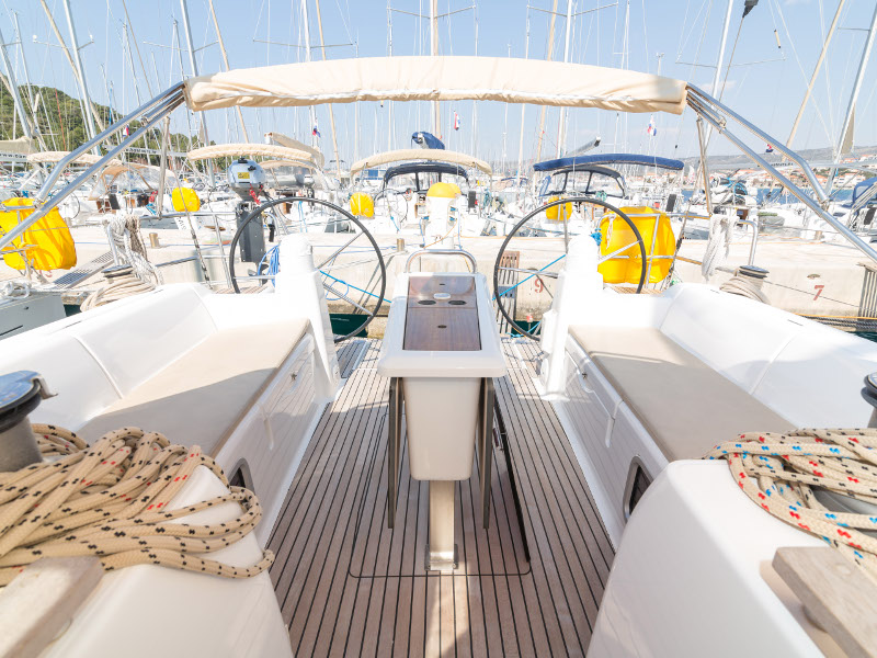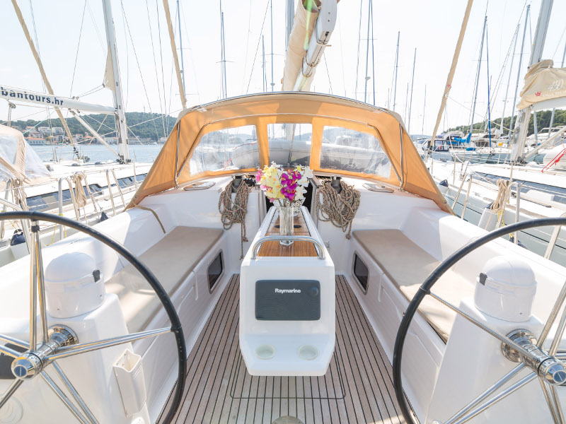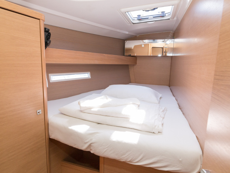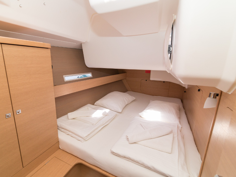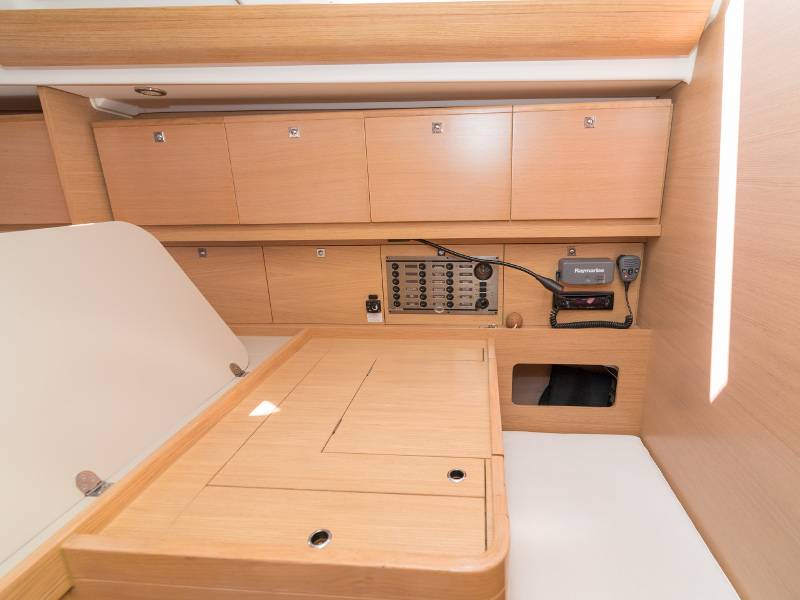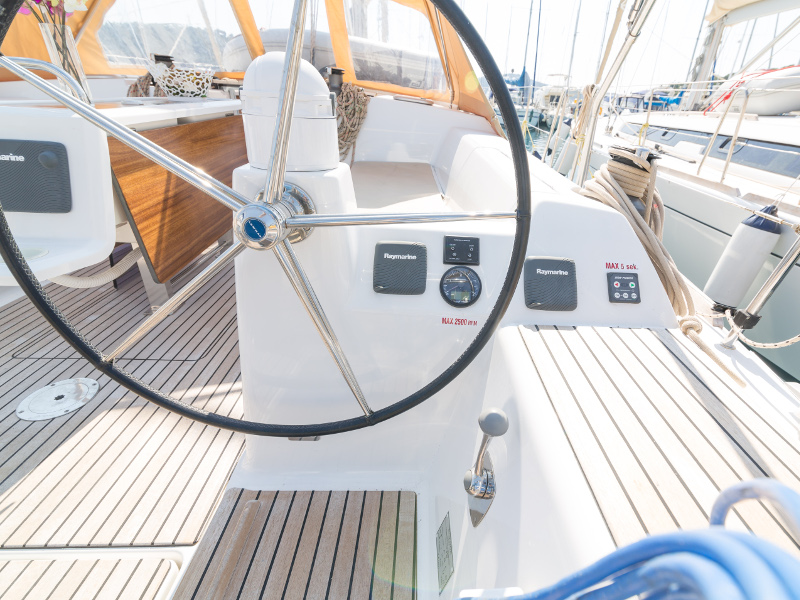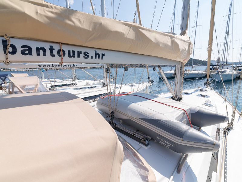 Full batten main sail, Roll Genoa, Spray hood, 2 steering wheels, Anchor with marked chain, Autopilot Raymarine, Bedlinen & towels (ready-made beds), Bimini top, Bow thruster, Cockpit cushions, Cockpit loudspeakers, Cockpit table, Echo sounder, Electric refrigerator, Emergency tiller, Freezer, GPS plotter in cockpit, Heating, Holding tank, Outboard engine Honda 2.3 hp, Saloon loudspeakers, Shore power connection, Spare anchor with chain & rope, Speed indicator Raymarine, Stern shower (hot&cold), Teak cockpit, TV, VHF, Wind indicator Raymarine, Batteries, Electric windlass, Hot water