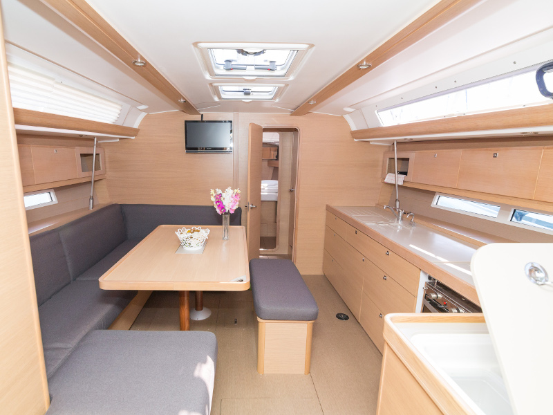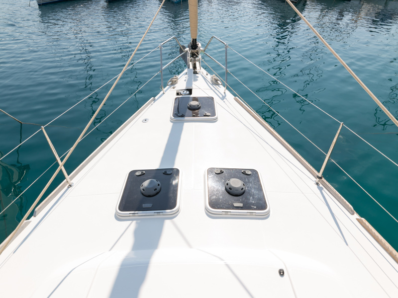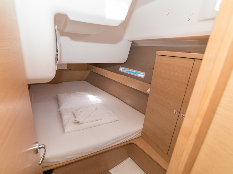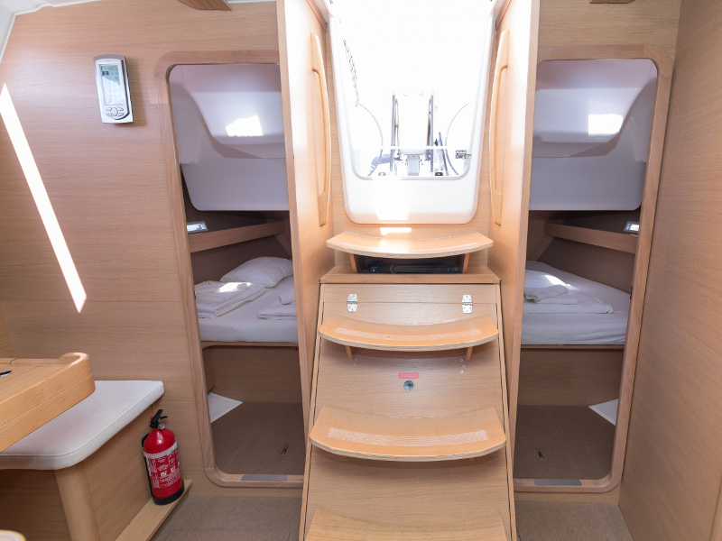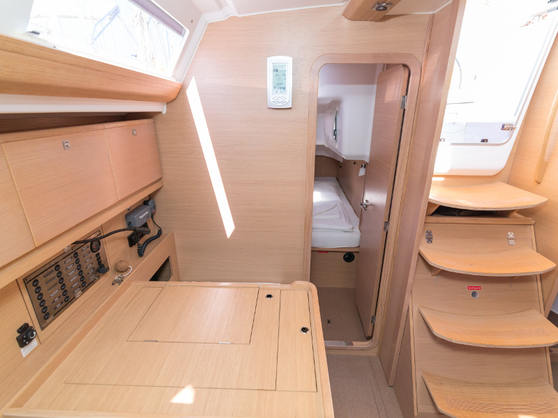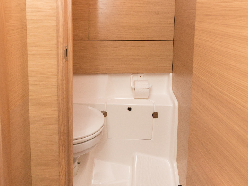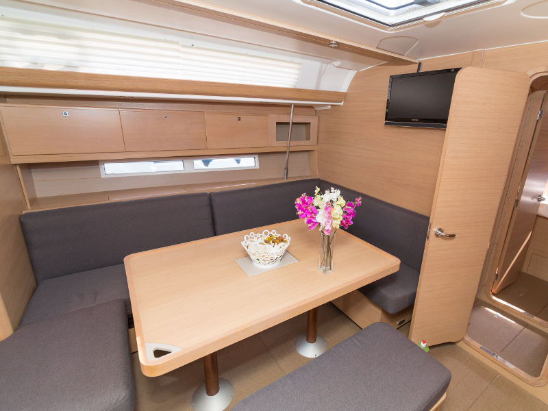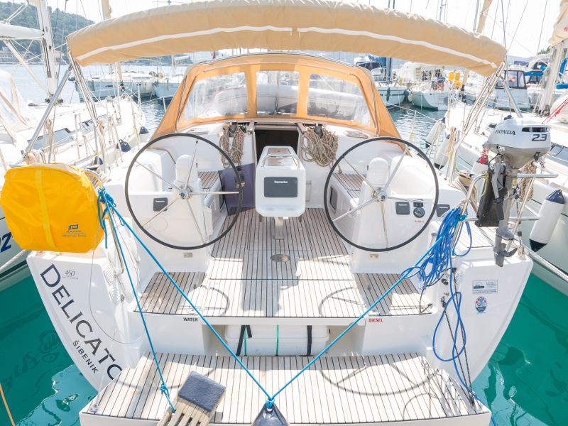 Full batten main sail, Roll Genoa, Spray hood, 2 steering wheels, Anchor with marked chain, Autopilot Raymarine, Bedlinen & towels (ready-made beds), Bimini top, Bow thruster, Cockpit cushions, Cockpit loudspeakers, Cockpit table, Echo sounder, Electric refrigerator, Emergency tiller, Freezer, GPS plotter in cockpit, Heating, Holding tank, Outboard engine Honda 2.3 hp, Saloon loudspeakers, Shore power connection, Spare anchor with chain & rope, Speed indicator Raymarine, Stern shower (hot&cold), Teak cockpit, TV, VHF, Wind indicator Raymarine, Batteries, Electric windlass, Hot water