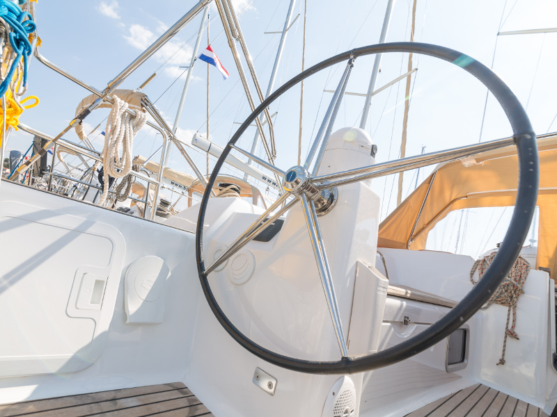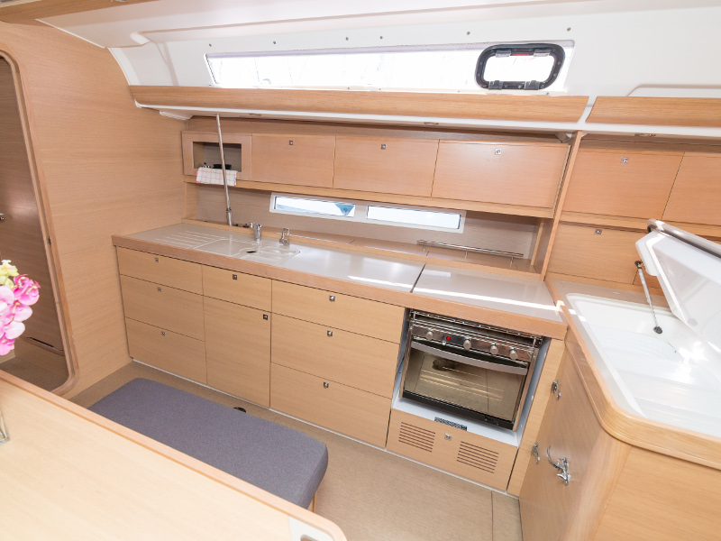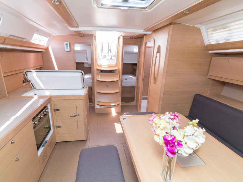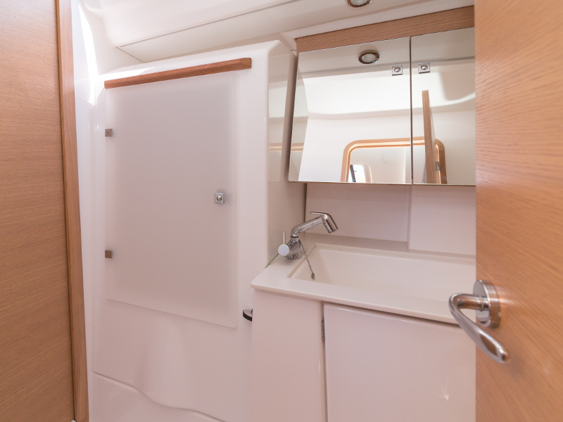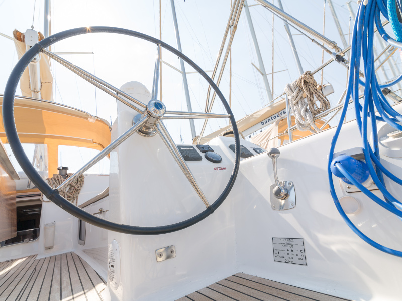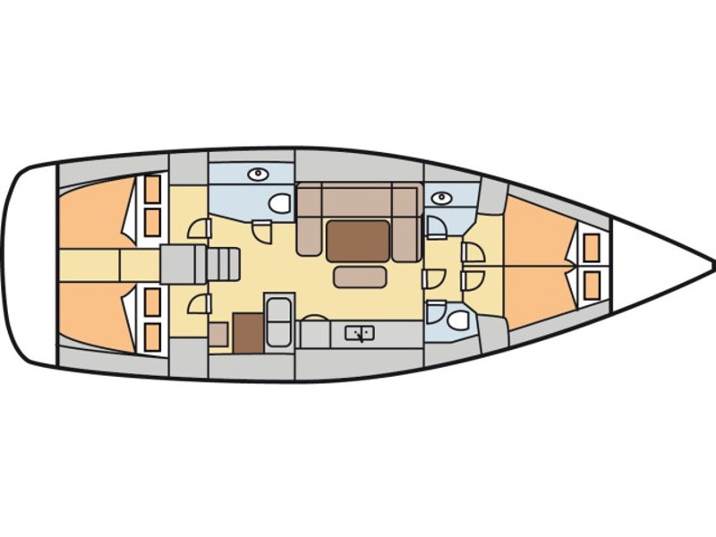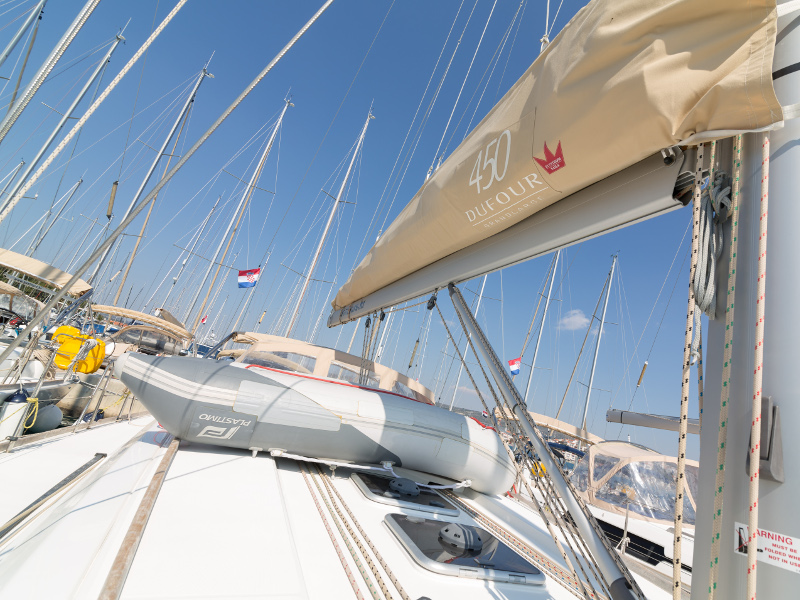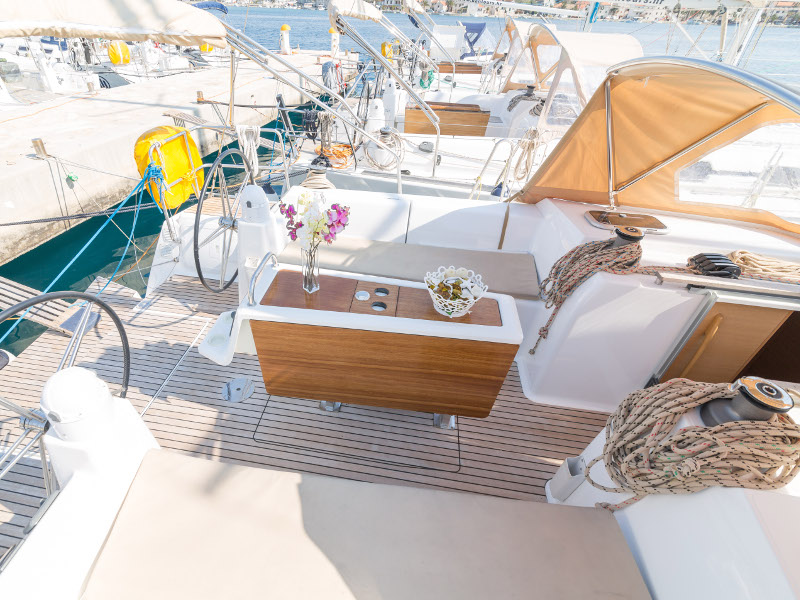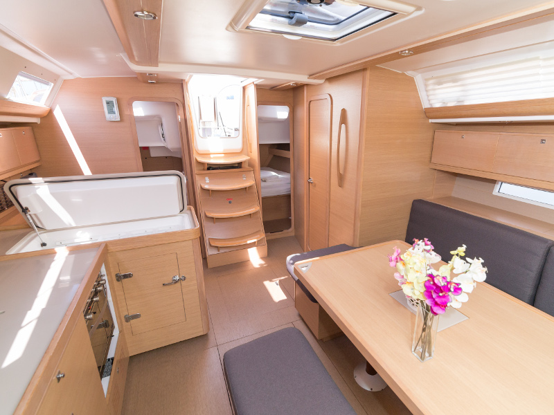 Full batten main sail, Roll Genoa, Spray hood, 2 steering wheels, Anchor with marked chain, Autopilot Raymarine, Bedlinen & towels (ready-made beds), Bimini top, Bow thruster, Cockpit cushions, Cockpit loudspeakers, Cockpit table, Echo sounder, Electric refrigerator, Emergency tiller, Freezer, GPS plotter in cockpit, Heating, Holding tank, Outboard engine Honda 2.3 hp, Saloon loudspeakers, Shore power connection, Spare anchor with chain & rope, Speed indicator Raymarine, Stern shower (hot&cold), Teak cockpit, TV, VHF, Wind indicator Raymarine, Batteries, Electric windlass, Hot water