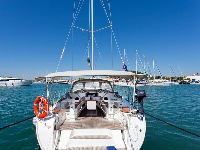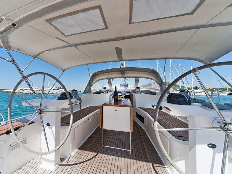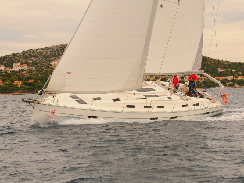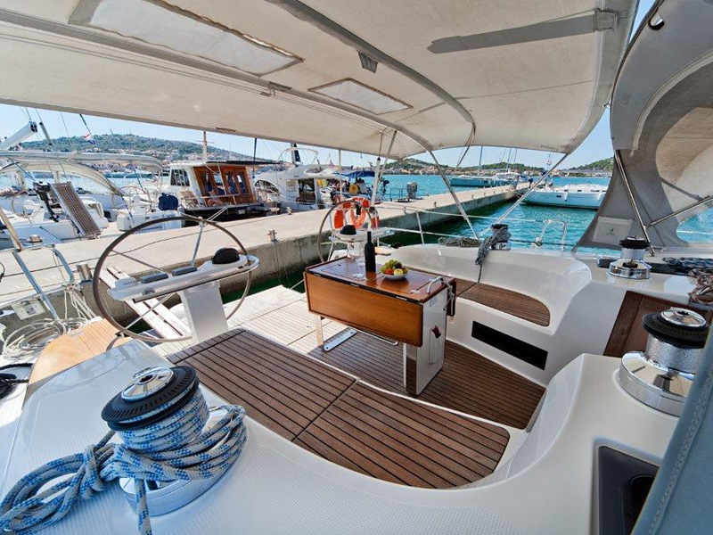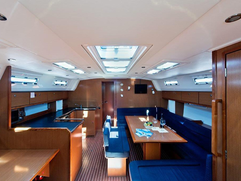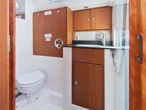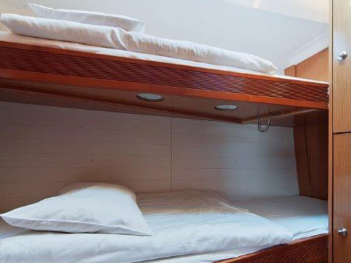 Fuel funnel, Spare engine belt, Spare engine oil, Spare impeller, Start battery, Battery charter 220 V, Consumption battery, E - switch / fuses, Main switch, Shore power cable 220 V, Sockets 12/220 V , Spare fuses, Boat hook, Bow anchor + 50m chain, Bowthruster, El. anchor windlass, Gangway, Mooring rope, Stern anchor, Fenders, El. bilge pump, Emergency signals, Fire extinguisher, First aid kit, Flashing buoy, Fog horn, Hand bilge pump, Life belts, Life jackets, Life raft, Life ring, Mast chair, Spare tiller, Tools and spare parts, Torch, Autopilot, Baro/Hygro/Thermometer, Binoculars, Echo sounder, GPS plotter, Hand bearing compass, Navigation charts, NAV - set, Pilot book, Search light, Speed/log, Steering compass, Steering wheel, UKW, Wind instrument, Wind-vane, Bimini, Blankets, pillows, Boarding ladder, Bucket, bowl and brush, CD/DVD radio, Cleaning and washing set, Cockpit shower, Cockpit table, Diesel can - empty, Dinghy, paddles, pump, Dishes, Fresh water pump, Gas bottle, Gas stove with oven, Heating, LCD TV 19", Linen, Litter bag, toilet paper, Mobile phone (netted), Outboard engine, Refrigerator box 12V, Rerfrigerator 12V, Sink, Sprayhood, Teak deck in cockpit, Water heater, Water hose, Bathing platform, folding