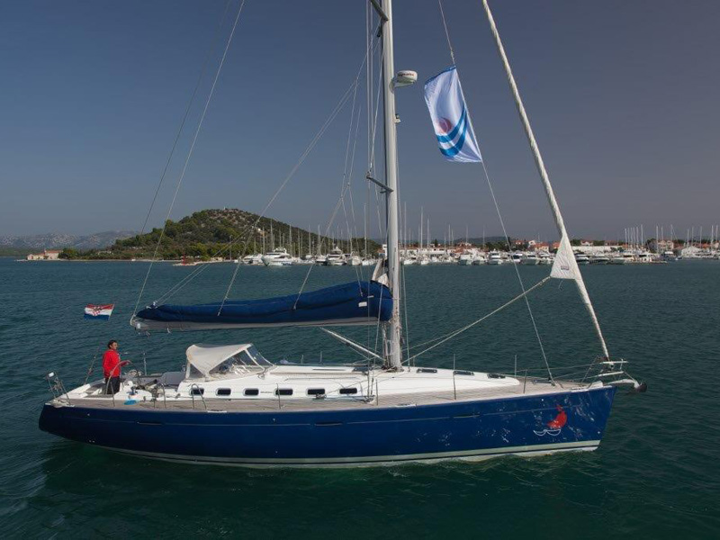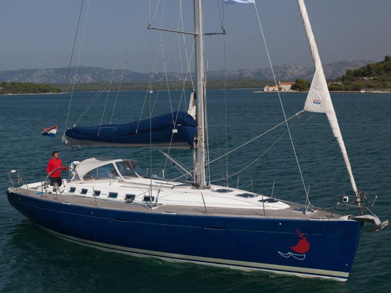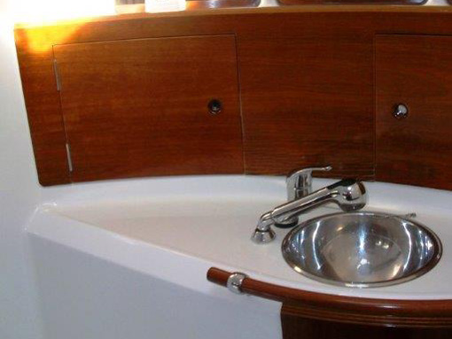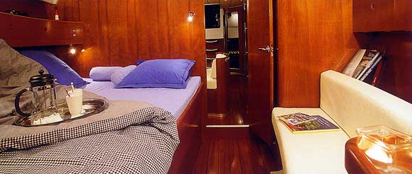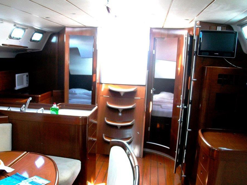 Fuel funnel, Spare engine belt, Spare engine oil, Spare impeller, Start battery, Battery charter 220 V, Consumption battery, E - switch / fuses, Main switch, Shore power cable 220 V, Sockets 12/220 V , Spare fuses, Boat hook, Bow anchor + 50m chain, El. anchor windlass, Gangway, Mooring rope, Stern anchor, Fenders, El. bilge pump, Emergency signals, Fire extinguisher, First aid kit, Flashing buoy, Fog horn, Hand bilge pump, Life belts, Life jackets, Life raft, Life ring, Mast chair, Spare tiller, Tools and spare parts, Torch, Autopilot, Baro/Hygro/Thermometer, Binoculars, Echo sounder, GPS plotter, Hand bearing compass, Navigation charts, NAV - set, Pilot book, Search light, Speed/log, Steering compass, Steering wheel, UKW, Wind instrument, Wind-vane, Blankets, pillows, Boarding ladder, Bucket, bowl and brush, CD/DVD radio, Cleaning and washing set, Cockpit shower, Cockpit table, Diesel can - empty, Dinghy, paddles, pump, Dishes, Fresh water pump, Gas bottle, Gas stove with oven, Heating, LCD TV 19", Linen, Litter bag, toilet paper, Mobile phone (netted), Outboard engine, Refrigerator box 12V, Rerfrigerator 12V, Sink, Sprayhood, Teak deck in cockpit, Water heater, Water hose, Sun tend, Bathing platform, folding