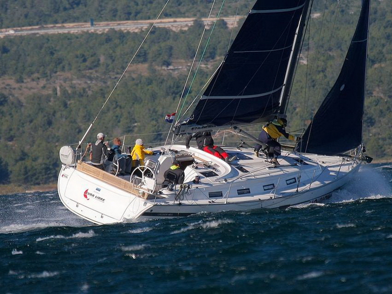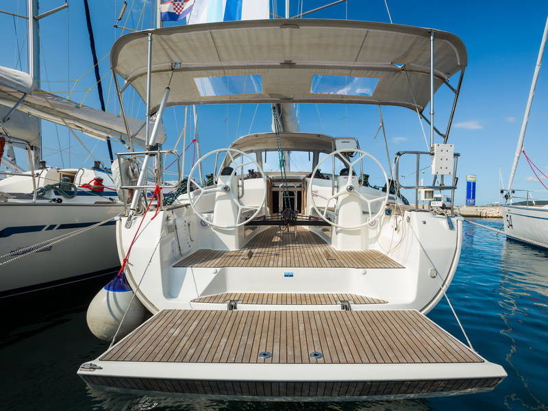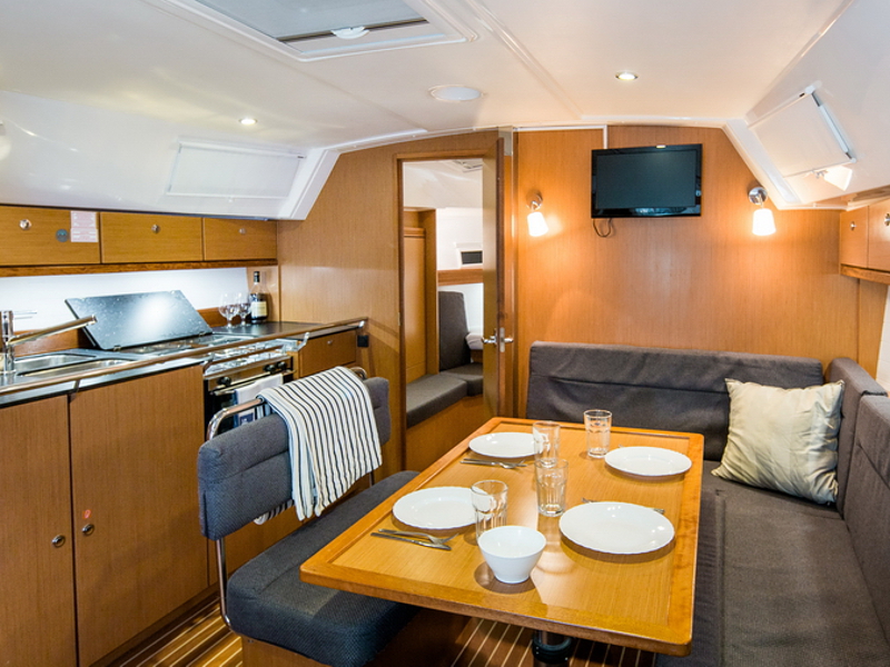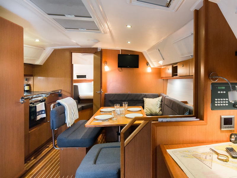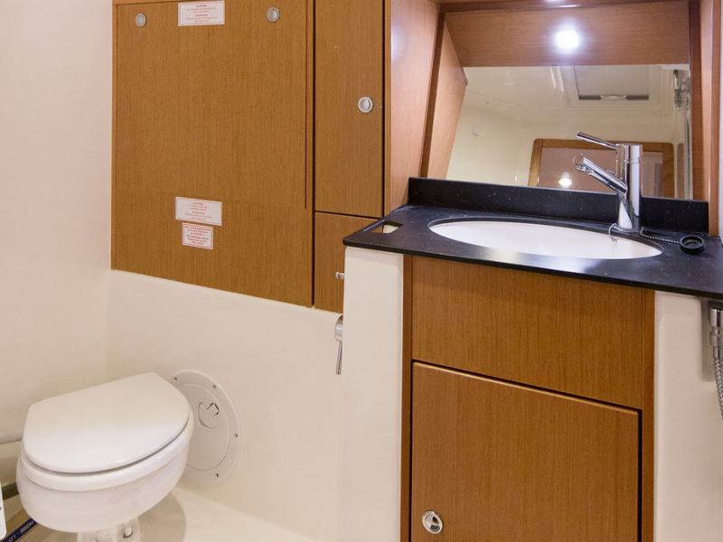 Box of flares, Emergency tiller, First aid kit, Floating light, GMDSS, Horse shoe buoy, Life jackets, Safety harnesses, Smoke box, Torch, Autopilot, Chart plotter in cockpit, Compass, Eletronic sea charts, GPS, VHF radio, Wind speed meter, Furling genoa, Lazy jack, Mail sail full batten, Spinnaker pole, Winches GENOA SHEET X2, Winches HALYARDS X2, Winches MAIN SHEET X2, Anchor electric windlass, Battery charger + shore cable, Bed linen, Bimini top, Cockpit speakers, Cockpit table, Deck shower (hot water), Dinghy, Electric bilge pump, Electric fridge, Free unlimited internet, Gangway, Gas bottle, Gas stove with oven, Heating, Hot water, Radio / CD player / MP3 /USB, Sprayhood, Steering wheel, TV / DVD
