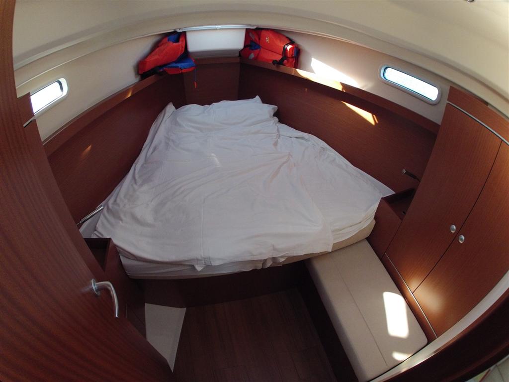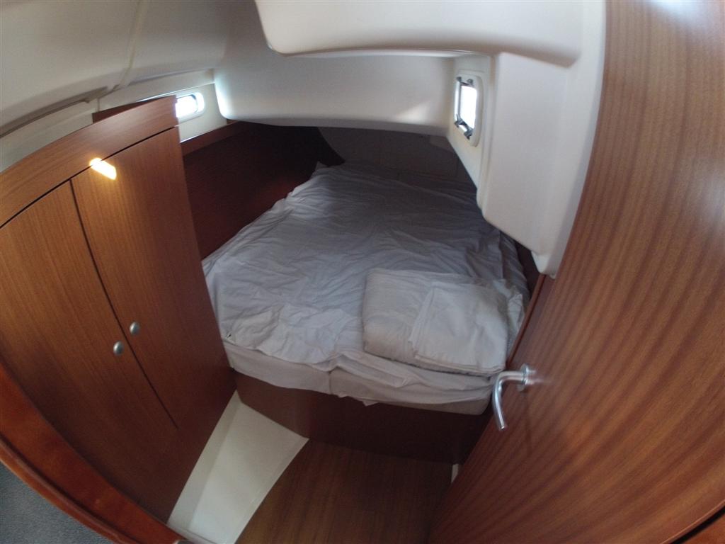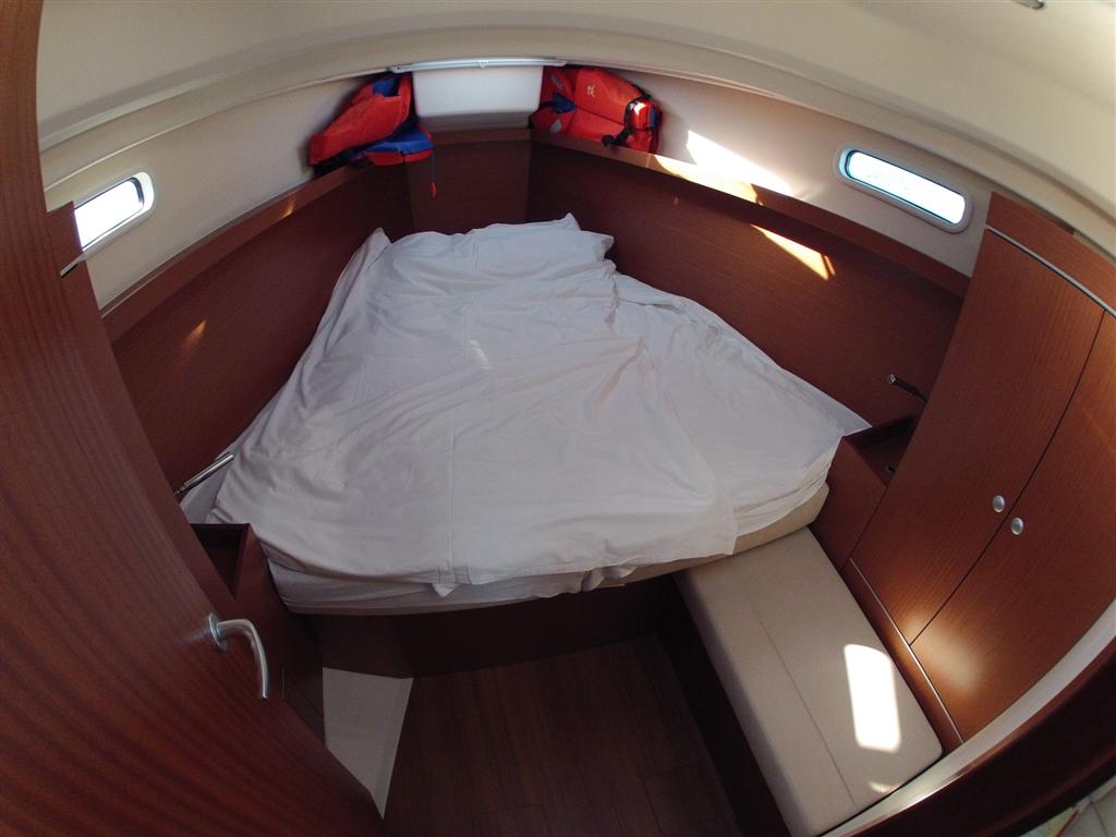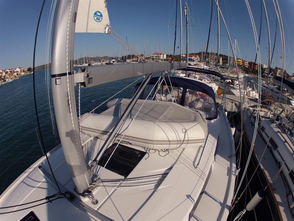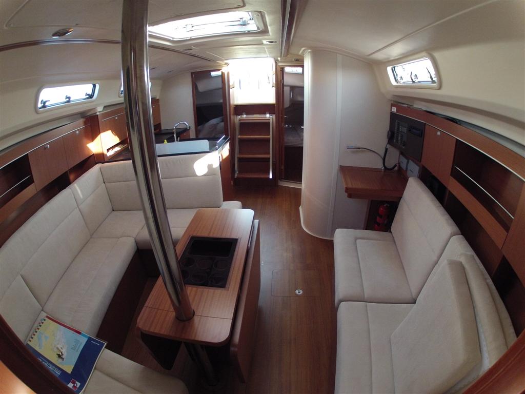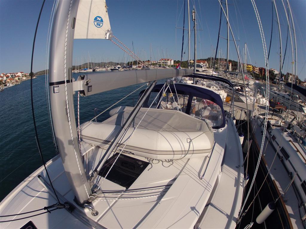 Self Tacking Jib, WiFi, Bathing platform, Autopilot, Battery charger, Bimini, Cockpit shower, Depth speed, LCD TV with DVD or USB, Electrical bilge pump, Electrical water pump, Electric windlass, GPS chartplotter in cockpit, Hot water, Motor battery, Outside speakers, Radio with CD or MP3 player, Refrigerator 12V, Roll main sail, Service battery, Sprayhood, VHF, Wind, Anchor + chain, Black ball, Black cone, Boat hook, Bucket, Deckbrush, Dinghy, Emergency helm, Funnel, Gangway, Gas bottles, Jerrycan for fuel, Jerrycan for water, Lifebuoy with light, Oars for dinghy, Outboard engine holder, Pump for dinghy, Radar reflector, Round fenders, Second anchor + chain, Shore power line, Skipper seat, Sponge, Water hose, Barometer, Binocular, Clock, Divider, Handbearing compass, Navigation charts set, Navigation ruler, Pen and pencil set, Pilot book, Triangle, Bosun chair, Distress flares box, Fire extinguishers, First aid kit, Flash lamp, Foghorn, Tool set, Windlass handle, Windlass remote control, Life jackets, Flat fenders
