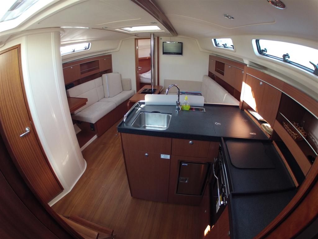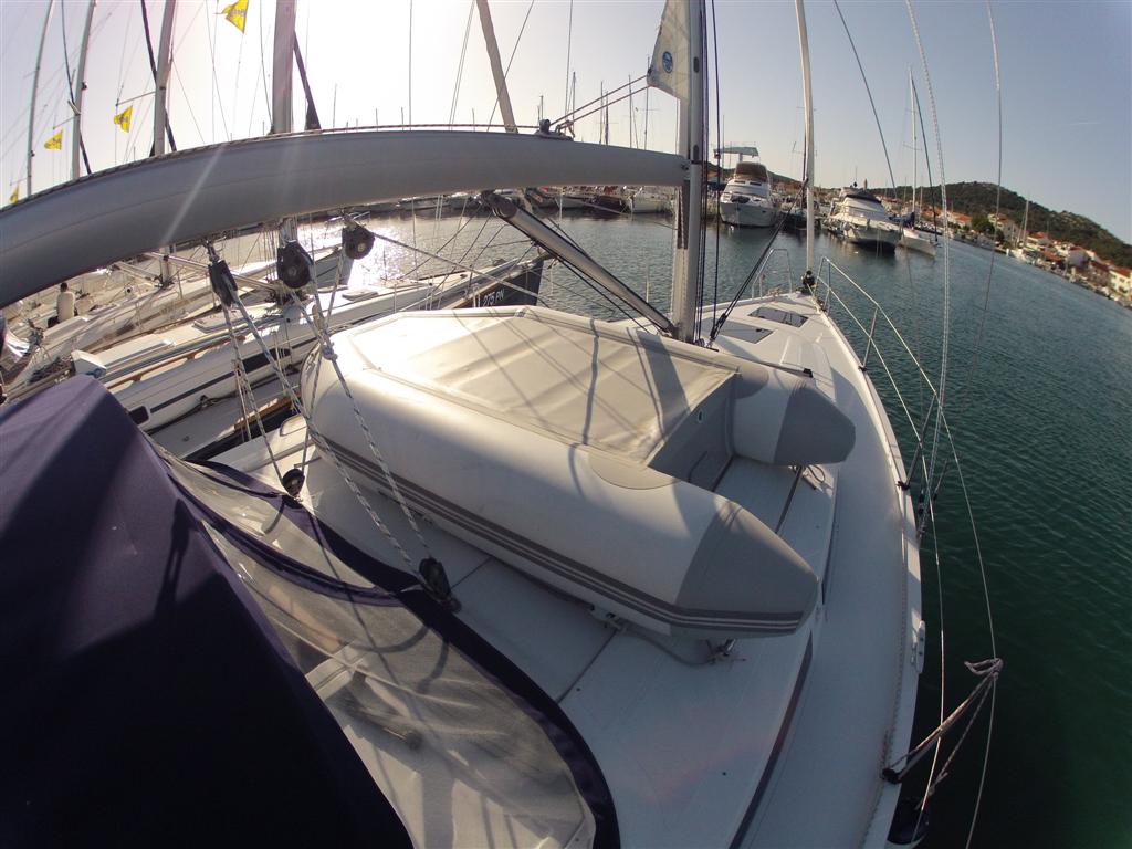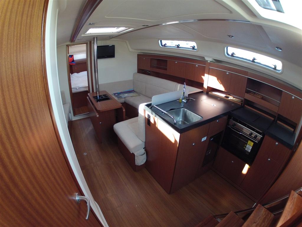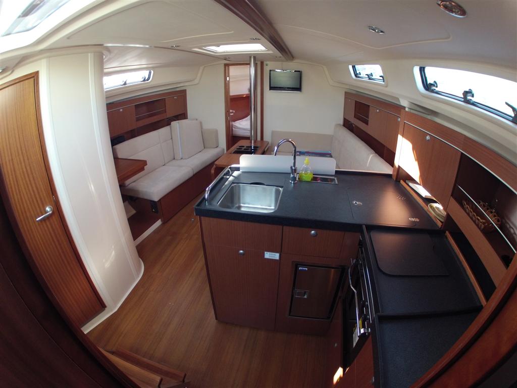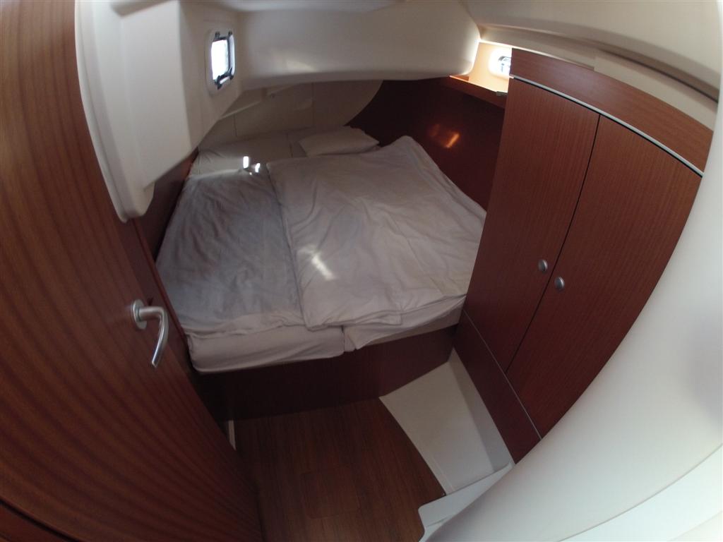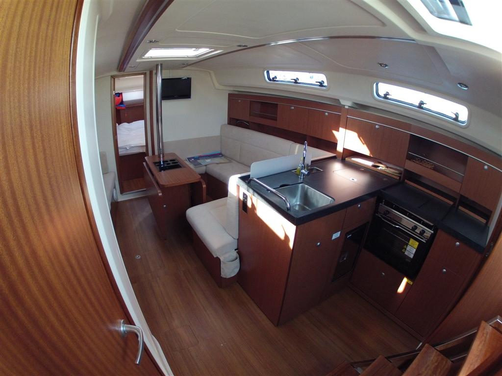 Self Tacking Jib, WiFi, Bathing platform, Autopilot, Battery charger, Bimini, Cockpit shower, Depth speed, LCD TV with DVD or USB, Electrical bilge pump, Electrical water pump, Electric windlass, GPS chartplotter in cockpit, Hot water, Motor battery, Outside speakers, Radio with CD or MP3 player, Refrigerator 12V, Roll main sail, Service battery, Sprayhood, VHF, Wind, Anchor + chain, Black ball, Black cone, Boat hook, Bucket, Deckbrush, Dinghy, Emergency helm, Funnel, Gangway, Gas bottles, Jerrycan for fuel, Jerrycan for water, Lifebuoy with light, Oars for dinghy, Outboard engine holder, Pump for dinghy, Radar reflector, Round fenders, Second anchor + chain, Shore power line, Skipper seat, Sponge, Water hose, Barometer, Binocular, Clock, Divider, Handbearing compass, Navigation charts set, Navigation ruler, Pen and pencil set, Pilot book, Triangle, Bosun chair, Distress flares box, Fire extinguishers, First aid kit, Flash lamp, Foghorn, Tool set, Windlass handle, Windlass remote control, Life jackets, Flat fenders