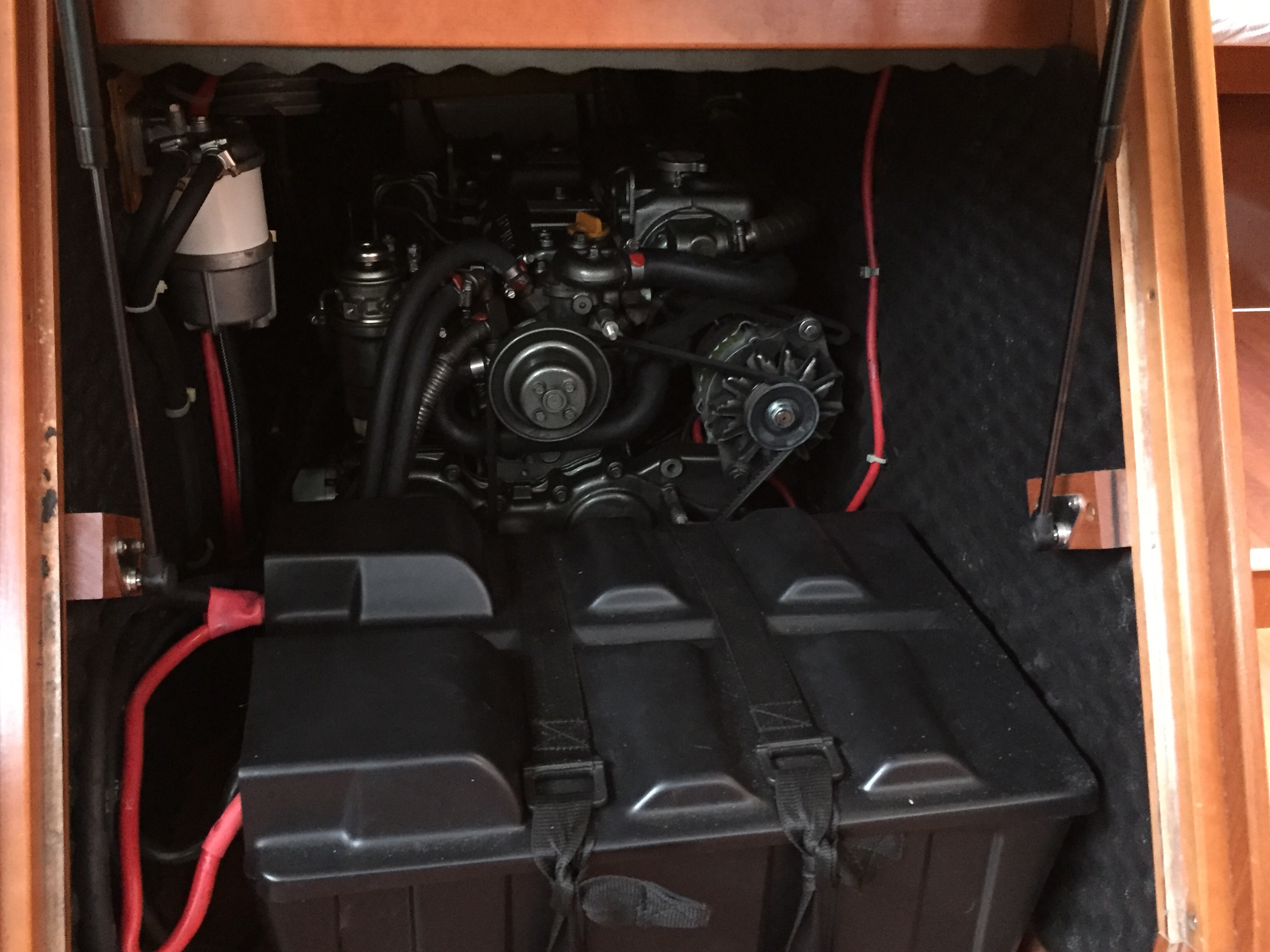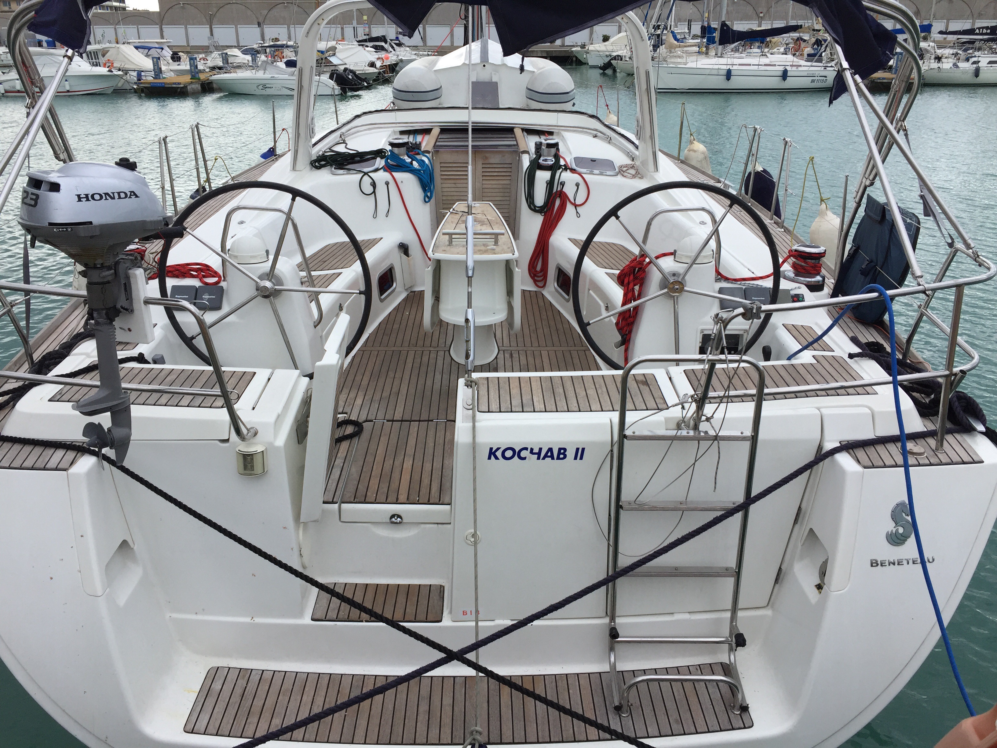 Bow thruster, Furling mainsail, Autopilot, Auxiliary anchor, Auxiliary rudder, Biminitop, CD reader, Cockpit cushions, Cutlery, Dinghy, Distress flaires, Electric fridge, Electric windlass, Fire extinguishers, First aid kit, GPS + chart plotter, Inflatable life jackets, Life jackets, Liferaft, Shore power connection, Sprayhood, Teak cockpit, VHF, Warm water, Wind instruments, Electric toilets, Teak deck, Cockpit Speakers