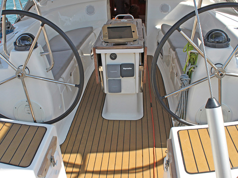 220V Battery charger, Apple iPAD, Auto helm autopilot, Auto helm depth system, Auto helm speed system, Auto helm wind speed/direction, Automatic life vests, Bed linen, Bimini, CD player with USB, MP3 and Bluetooth, Cockpit cushions, Cockpit LED lights, Cockpit speakers, Cockpit table, Deck shower, Dinghy, Electric anchor windlass, Full kitchen inventory, Furling Genoa, Furling mainsail, GPS plotter, Hot water, Inverter 12V-220V, Refrigerator, Self tail winches, Solar panels, Sprayhood, Steering wheel, Transom swimming ladder, VHF Radio, Windex
