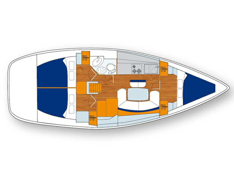 Box of flares, Emergency tiller, EPIRB, First aid kit, Floating light, Horse shoe buoy, Inflatable life raft, Life jackets, Navigation lights, Safety harnesses, Sea Anchor, Torch, VHF Station, 12 volt socket, 220 volt socket, Additional hatches, Battery charger + wire, Bed-linen, Bimini, Cockpit table, Compressor fridge, Deck shower, Dinghy, Diving mask, Electric bilge pump, Electric windlass, Flippers, Gangway, Gas bottle, Gas stove with oven, Holding Tank, Hot water, Icebox, Inverter, Radio-CD player, Sail repair kit, Secure parking, Ships licence, Sprayhood, Swimming ladder, Tools, Towels