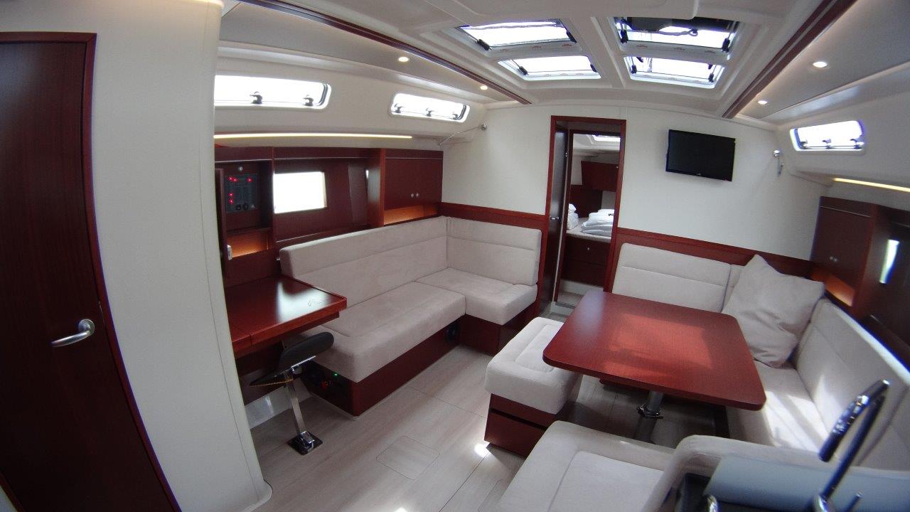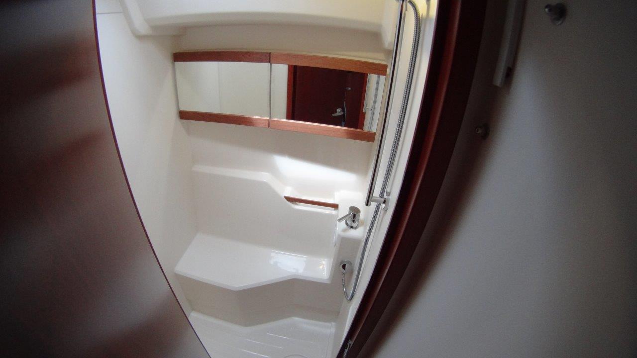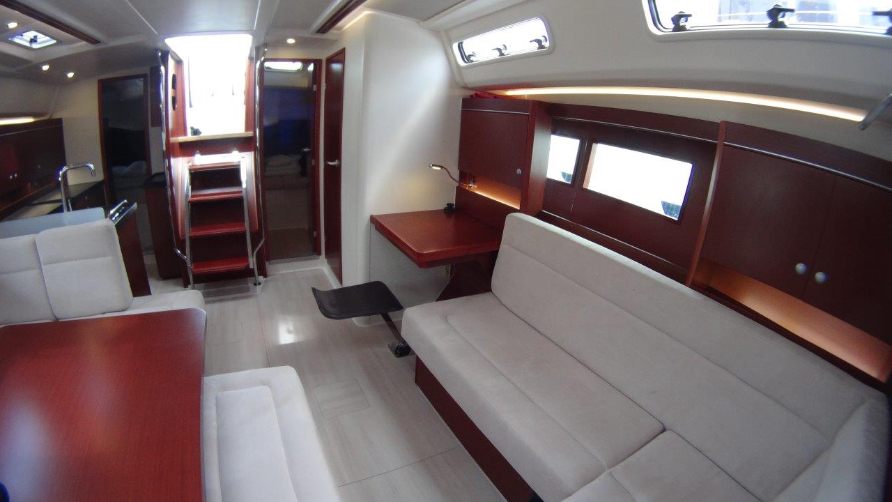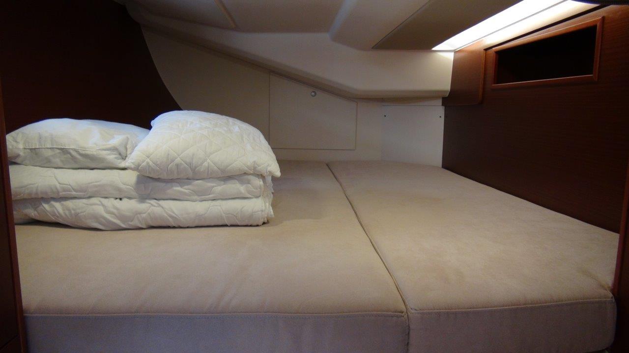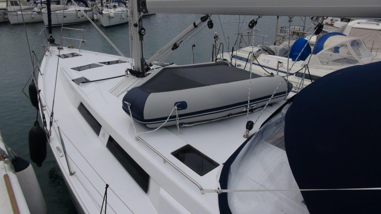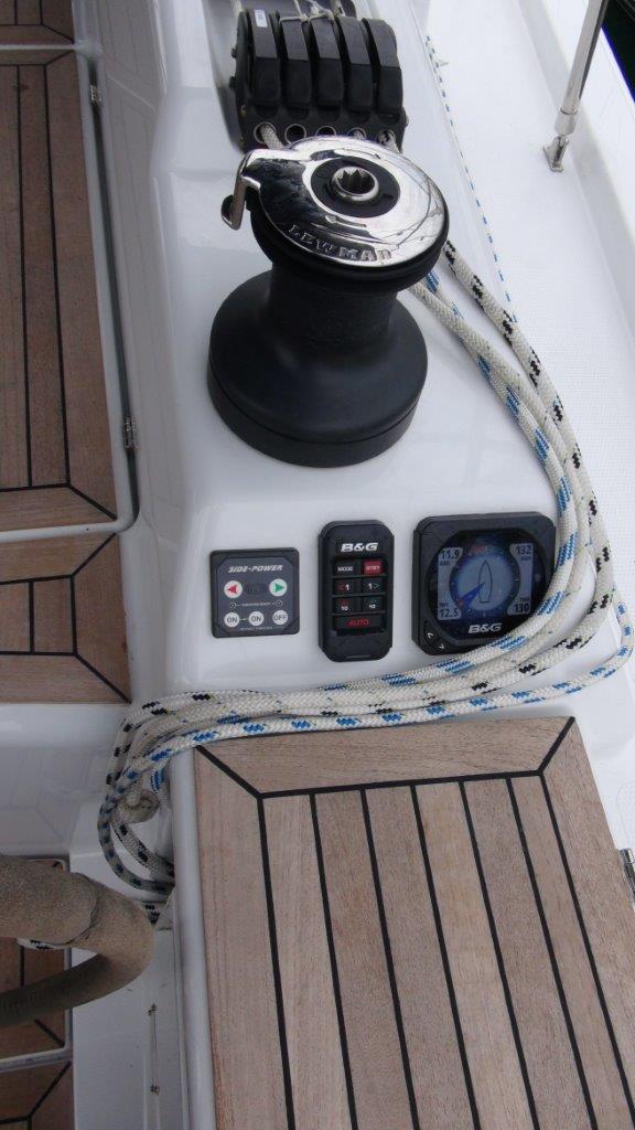 Self Tacking Jib, Autopilot, Battery charger, Bimini, Cockpit shower, Depth speed, LCD TV with DVD or USB, Electrical bilge pump, Electrical water pump, Electric windlass, GPS chartplotter in cockpit, Hot water, Motor battery, Outside speakers, Radio with CD or MP3 player, Refrigerator 12V, Roll main sail, Service battery, Sprayhood, VHF, Wind, Anchor + chain, Black ball, Black cone, Boat hook, Bucket, Deckbrush, Dinghy, Emergency helm, Funnel, Gangway, Gas bottles, Jerrycan for fuel, Jerrycan for water, Lifebuoy with light, Oars for dinghy, Outboard engine holder, Pump for dinghy, Radar reflector, Round fenders, Second anchor + chain, Shore power line, Skipper seat, Sponge, Water hose, Barometer, Binocular, Clock, Divider, Handbearing compass, Navigation charts set, Navigation ruler, Pen and pencil set, Pilot book, Triangle, Bosun chair, Distress flares box, Fire extinguishers, First aid kit, Flash lamp, Foghorn, Tool set, Windlass handle, Windlass remote control, Life jackets, Flat fenders, Life raft, Aircondition, Bowtruster, Heating, WiFi, Bathing platform