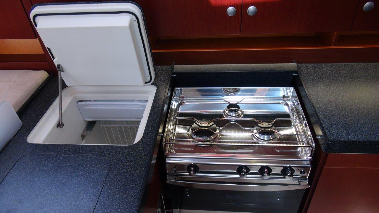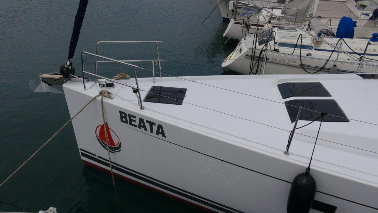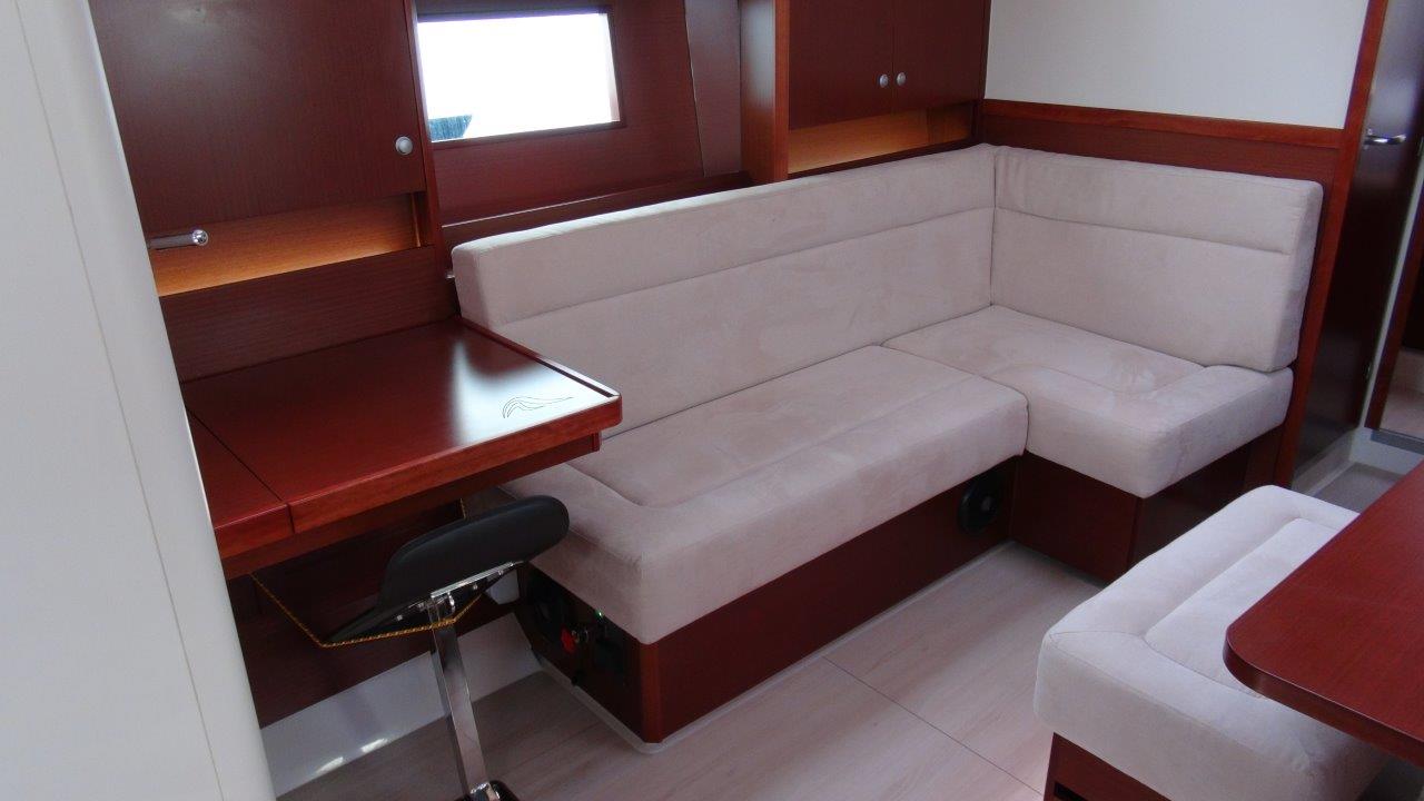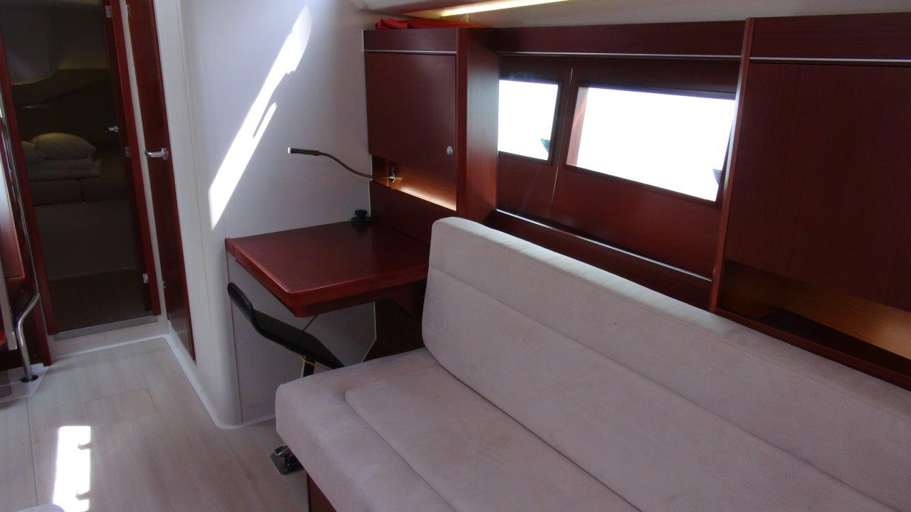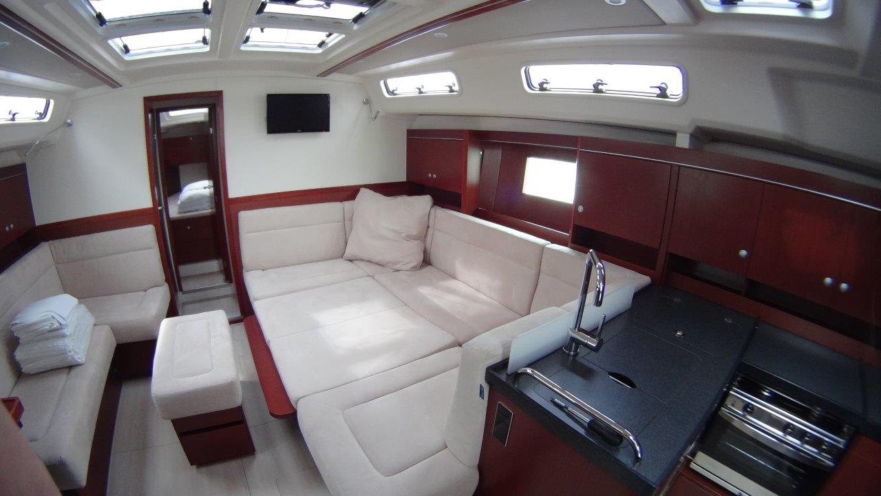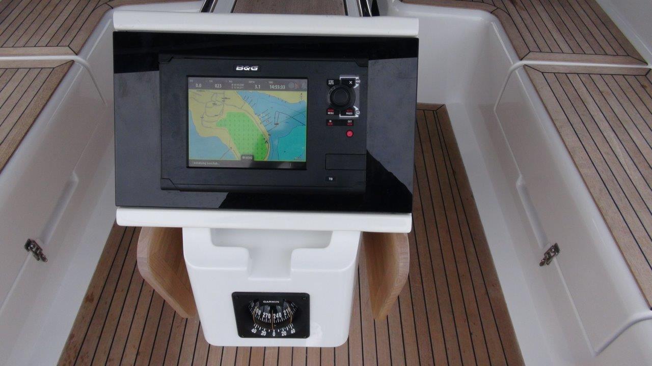 Self Tacking Jib, Autopilot, Battery charger, Bimini, Cockpit shower, Depth speed, LCD TV with DVD or USB, Electrical bilge pump, Electrical water pump, Electric windlass, GPS chartplotter in cockpit, Hot water, Motor battery, Outside speakers, Radio with CD or MP3 player, Refrigerator 12V, Roll main sail, Service battery, Sprayhood, VHF, Wind, Anchor + chain, Black ball, Black cone, Boat hook, Bucket, Deckbrush, Dinghy, Emergency helm, Funnel, Gangway, Gas bottles, Jerrycan for fuel, Jerrycan for water, Lifebuoy with light, Oars for dinghy, Outboard engine holder, Pump for dinghy, Radar reflector, Round fenders, Second anchor + chain, Shore power line, Skipper seat, Sponge, Water hose, Barometer, Binocular, Clock, Divider, Handbearing compass, Navigation charts set, Navigation ruler, Pen and pencil set, Pilot book, Triangle, Bosun chair, Distress flares box, Fire extinguishers, First aid kit, Flash lamp, Foghorn, Tool set, Windlass handle, Windlass remote control, Life jackets, Flat fenders, Life raft, Aircondition, Bowtruster, Heating, WiFi, Bathing platform