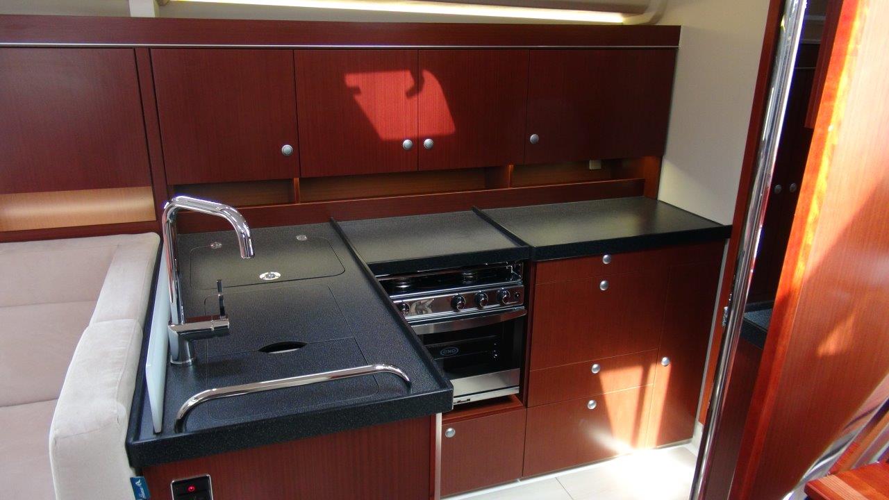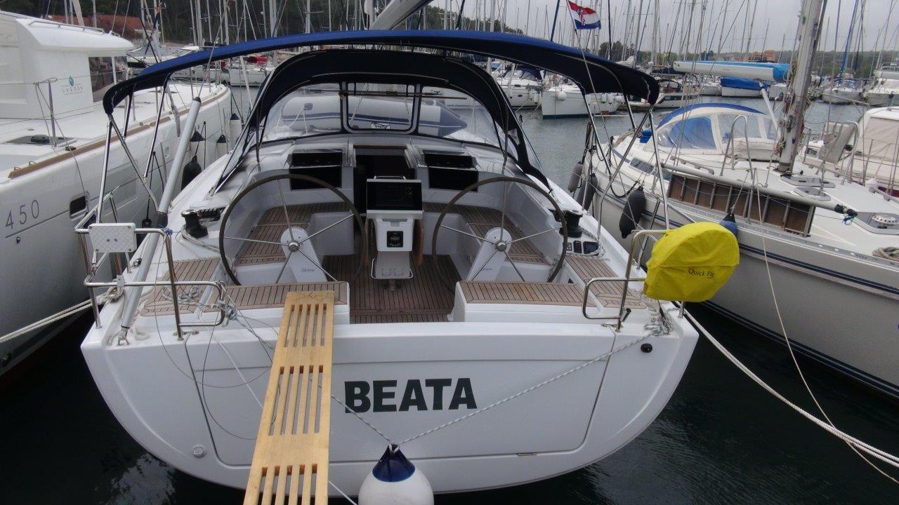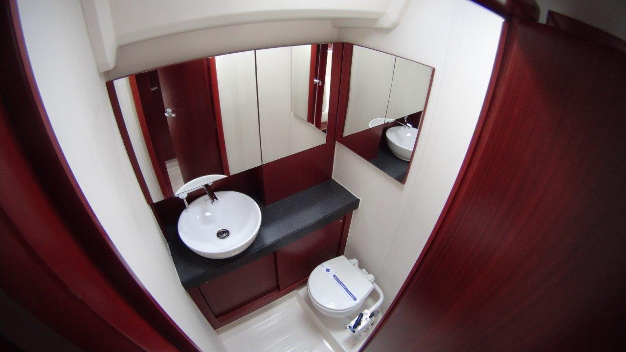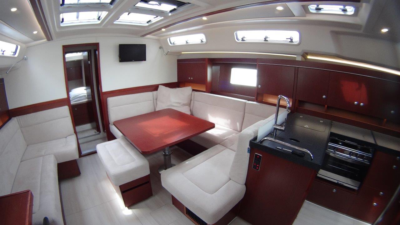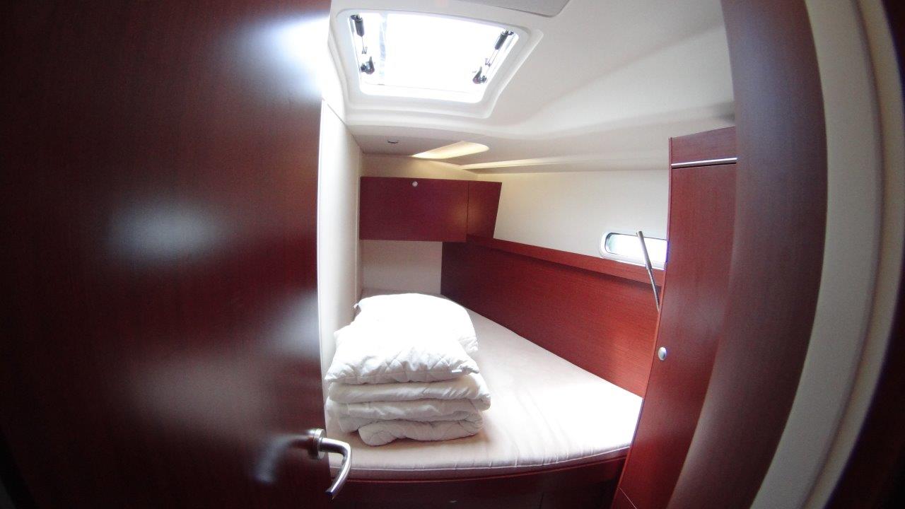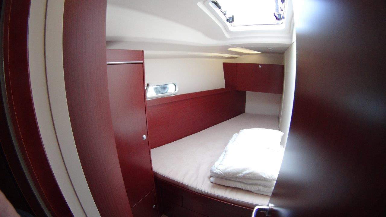 Self Tacking Jib, Autopilot, Battery charger, Bimini, Cockpit shower, Depth speed, LCD TV with DVD or USB, Electrical bilge pump, Electrical water pump, Electric windlass, GPS chartplotter in cockpit, Hot water, Motor battery, Outside speakers, Radio with CD or MP3 player, Refrigerator 12V, Roll main sail, Service battery, Sprayhood, VHF, Wind, Anchor + chain, Black ball, Black cone, Boat hook, Bucket, Deckbrush, Dinghy, Emergency helm, Funnel, Gangway, Gas bottles, Jerrycan for fuel, Jerrycan for water, Lifebuoy with light, Oars for dinghy, Outboard engine holder, Pump for dinghy, Radar reflector, Round fenders, Second anchor + chain, Shore power line, Skipper seat, Sponge, Water hose, Barometer, Binocular, Clock, Divider, Handbearing compass, Navigation charts set, Navigation ruler, Pen and pencil set, Pilot book, Triangle, Bosun chair, Distress flares box, Fire extinguishers, First aid kit, Flash lamp, Foghorn, Tool set, Windlass handle, Windlass remote control, Life jackets, Flat fenders, Life raft, Aircondition, Bowtruster, Heating, WiFi, Bathing platform