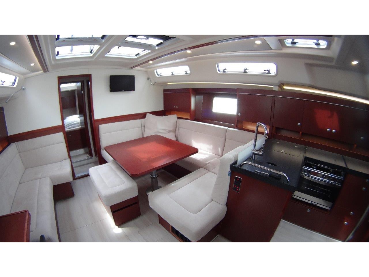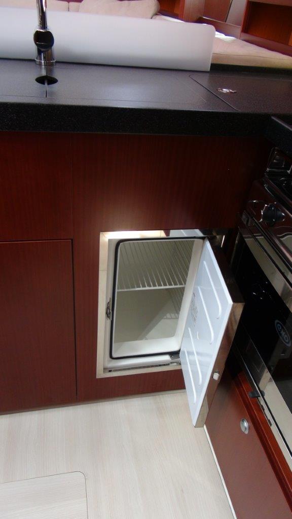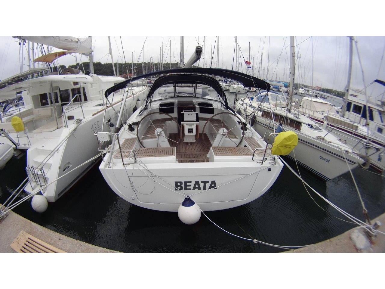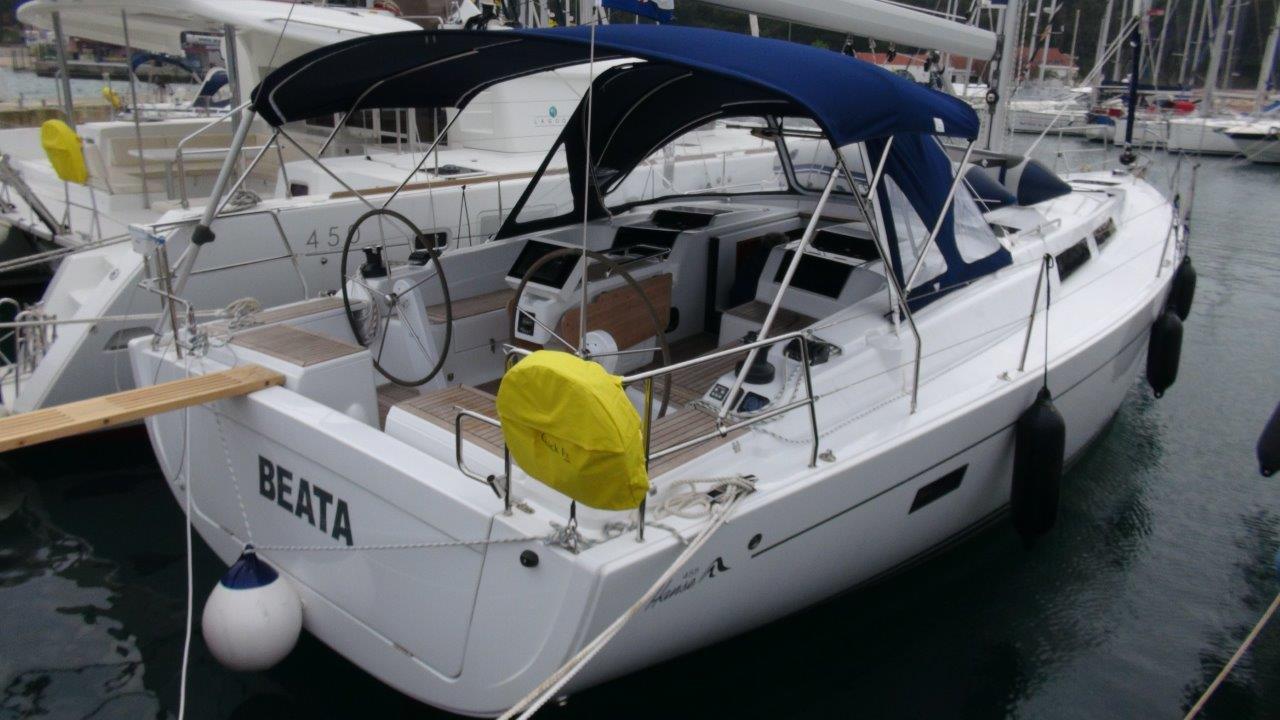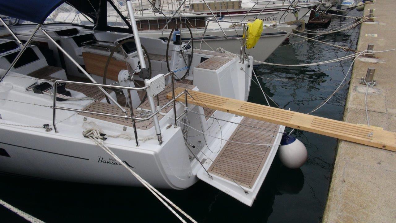 Self Tacking Jib, Autopilot, Battery charger, Bimini, Cockpit shower, Depth speed, LCD TV with DVD or USB, Electrical bilge pump, Electrical water pump, Electric windlass, GPS chartplotter in cockpit, Hot water, Motor battery, Outside speakers, Radio with CD or MP3 player, Refrigerator 12V, Roll main sail, Service battery, Sprayhood, VHF, Wind, Anchor + chain, Black ball, Black cone, Boat hook, Bucket, Deckbrush, Dinghy, Emergency helm, Funnel, Gangway, Gas bottles, Jerrycan for fuel, Jerrycan for water, Lifebuoy with light, Oars for dinghy, Outboard engine holder, Pump for dinghy, Radar reflector, Round fenders, Second anchor + chain, Shore power line, Skipper seat, Sponge, Water hose, Barometer, Binocular, Clock, Divider, Handbearing compass, Navigation charts set, Navigation ruler, Pen and pencil set, Pilot book, Triangle, Bosun chair, Distress flares box, Fire extinguishers, First aid kit, Flash lamp, Foghorn, Tool set, Windlass handle, Windlass remote control, Life jackets, Flat fenders, Life raft, Aircondition, Bowtruster, Heating, WiFi, Bathing platform