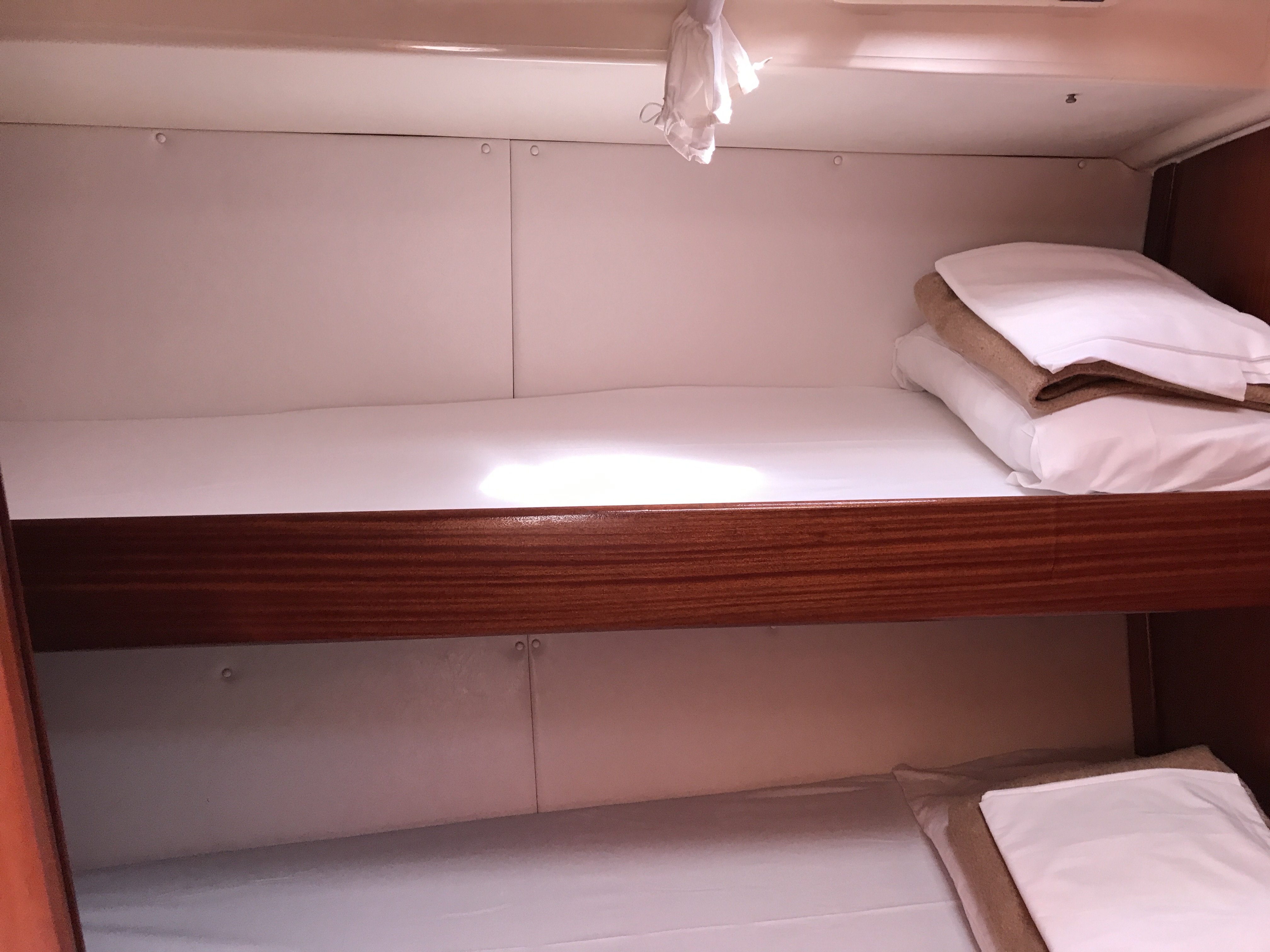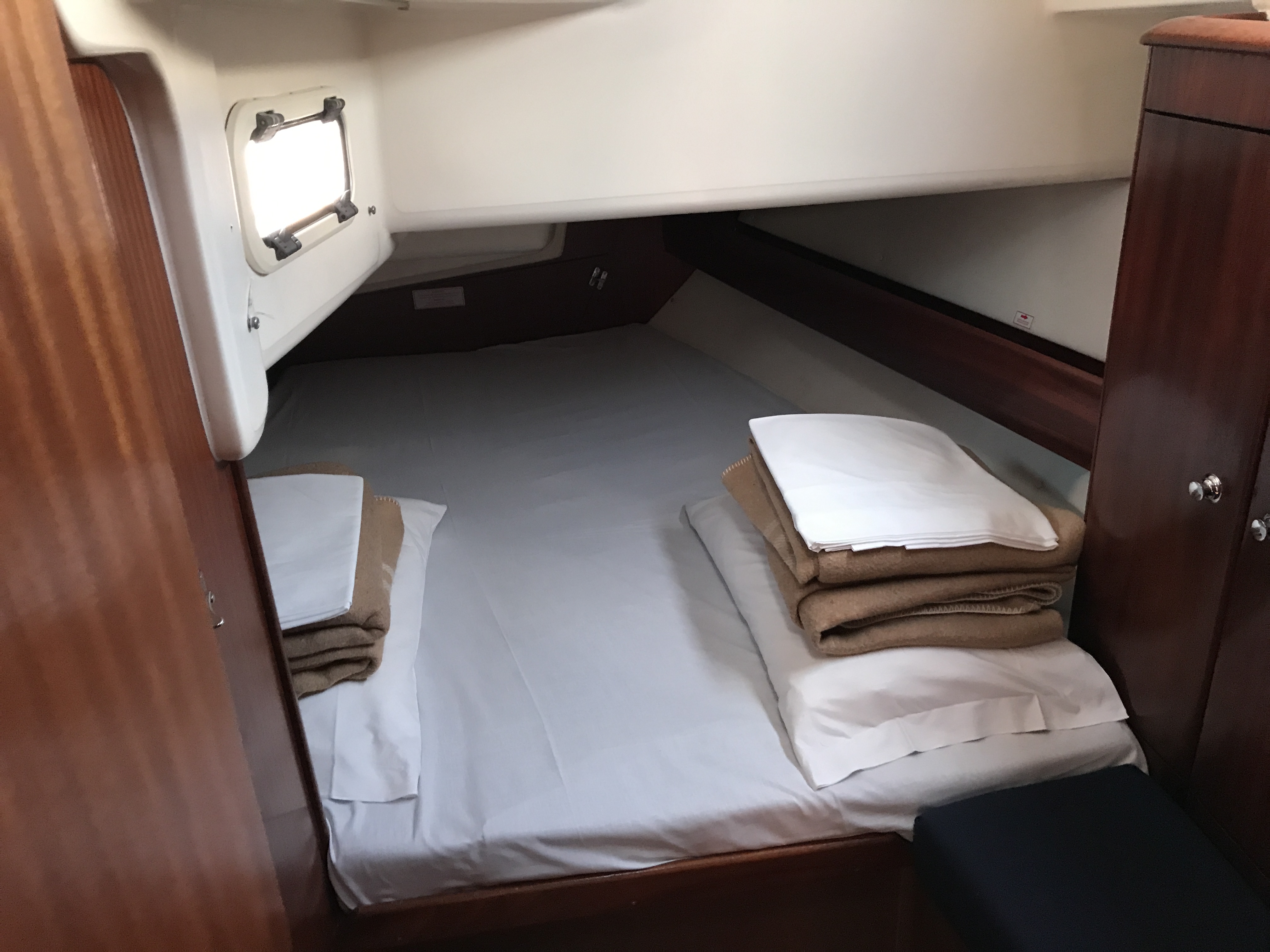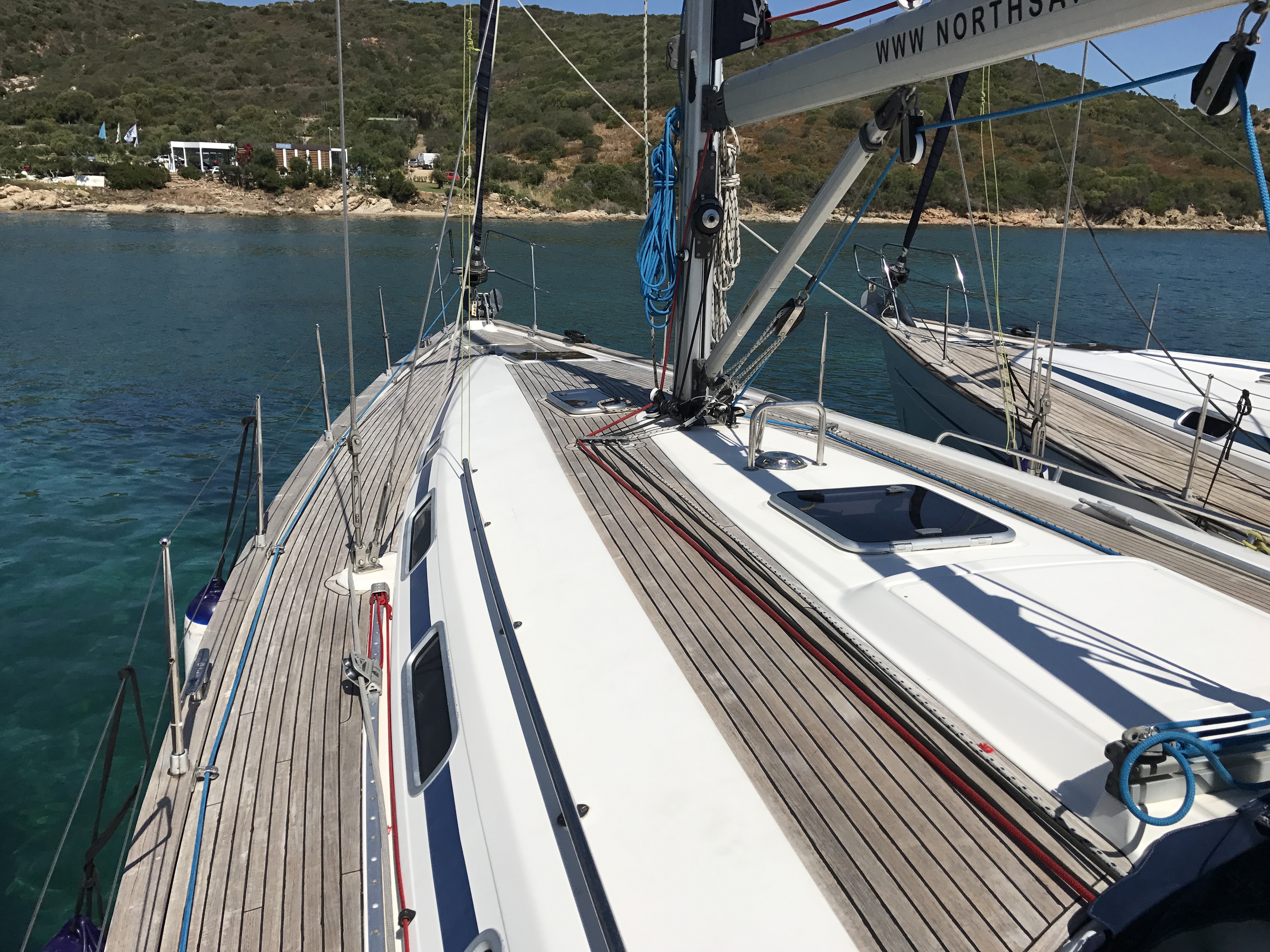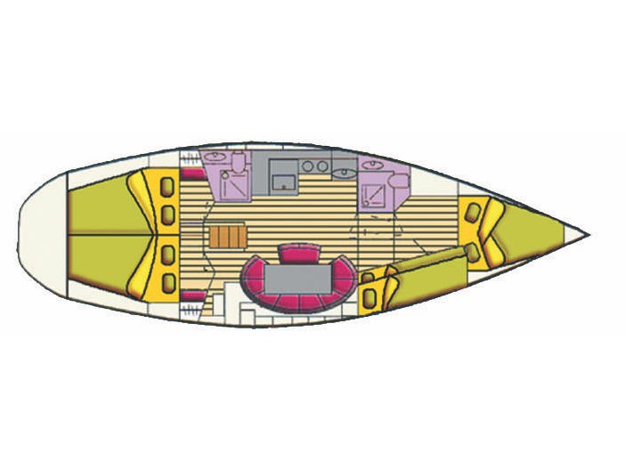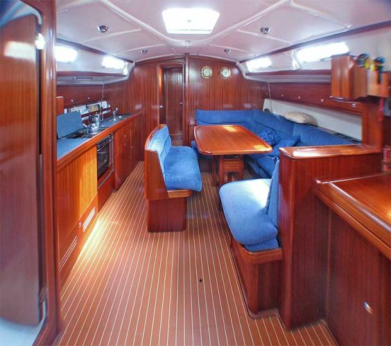 Furling mainsail, Teak deck, Autopilot, Auxiliary anchor, Auxiliary rudder, Biminitop, CD reader, Cutlery, Dinghy, Distress flaires, Engine, Fire extinguishers, First aid kit, GPS + chart plotter, Life jackets, Liferaft, Sail area (total), Shore power connection, Sprayhood, VHF, Warm water, Wind instruments, Cockpit cushions, Electric windlass, Inflatable life jackets, Cockpit Speakers, Teak cockpit