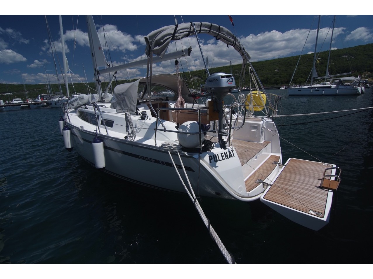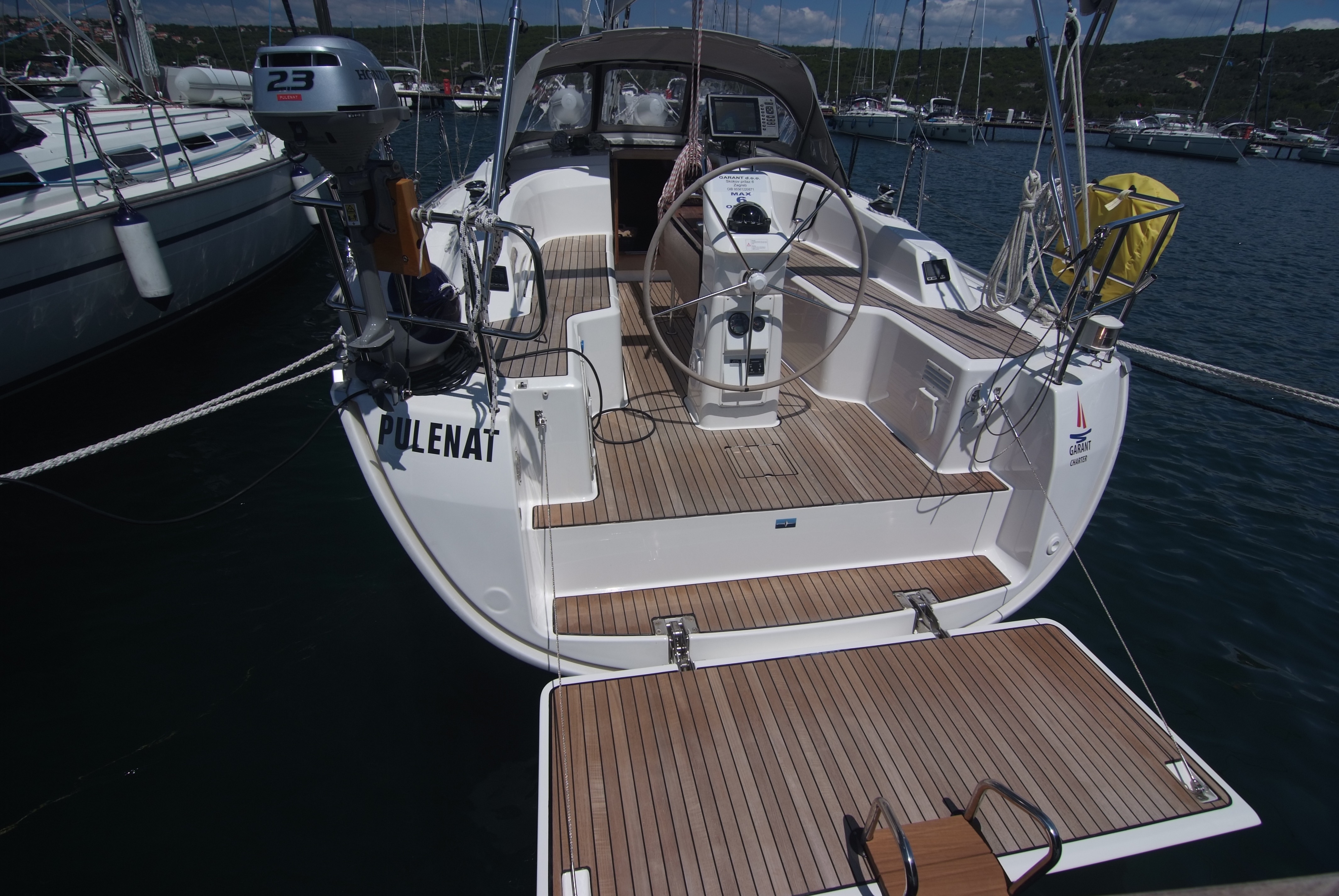 Bathing platform, Cockpit plotter, Coffee maker, Radio CD/Mp3, Cockpit loudspeakers, Wi-Fi Free (1GB/week), Dingy (tender), WI FI, Holding tank, Autopilot, Bilgepump handle, Bimini, Binocular, Boat hook, Bucket, Cockpit shower, Cockpit table, Depth Gauge, Electric Windlass, Emergency tiller, Fender, First aid kit, Flashlight, Fog horn, Furling main sail, Gas bottle, Genoa Furling, GPS Chartplotter, Hand compass, Harbour directory, Hose, Lifebuoy, Life jacket, List of lights, Mast stool, Mooringsline, Oil for engine, Radio telephone, Round fender, Sea charts, Shore Power Connection, Signal rockets, Speedometer, Spi-liftsystem, Spray hood, Stern anchor, Tangun, Tool box, Triangle,circle, Winch handle , Wind Speed Indicator/Network Wind, Yacht documents, Rodkick, Webasto, LCD TV