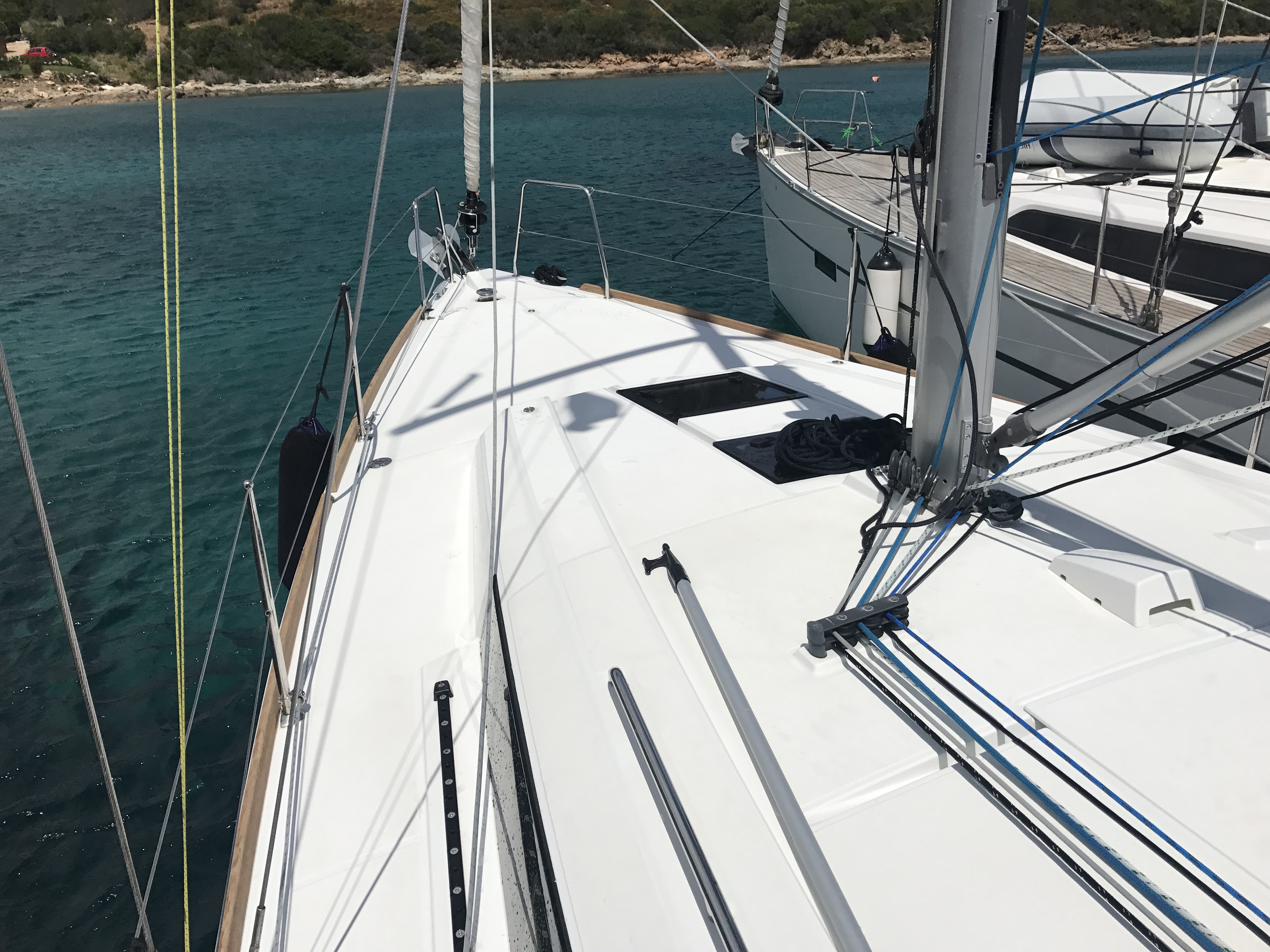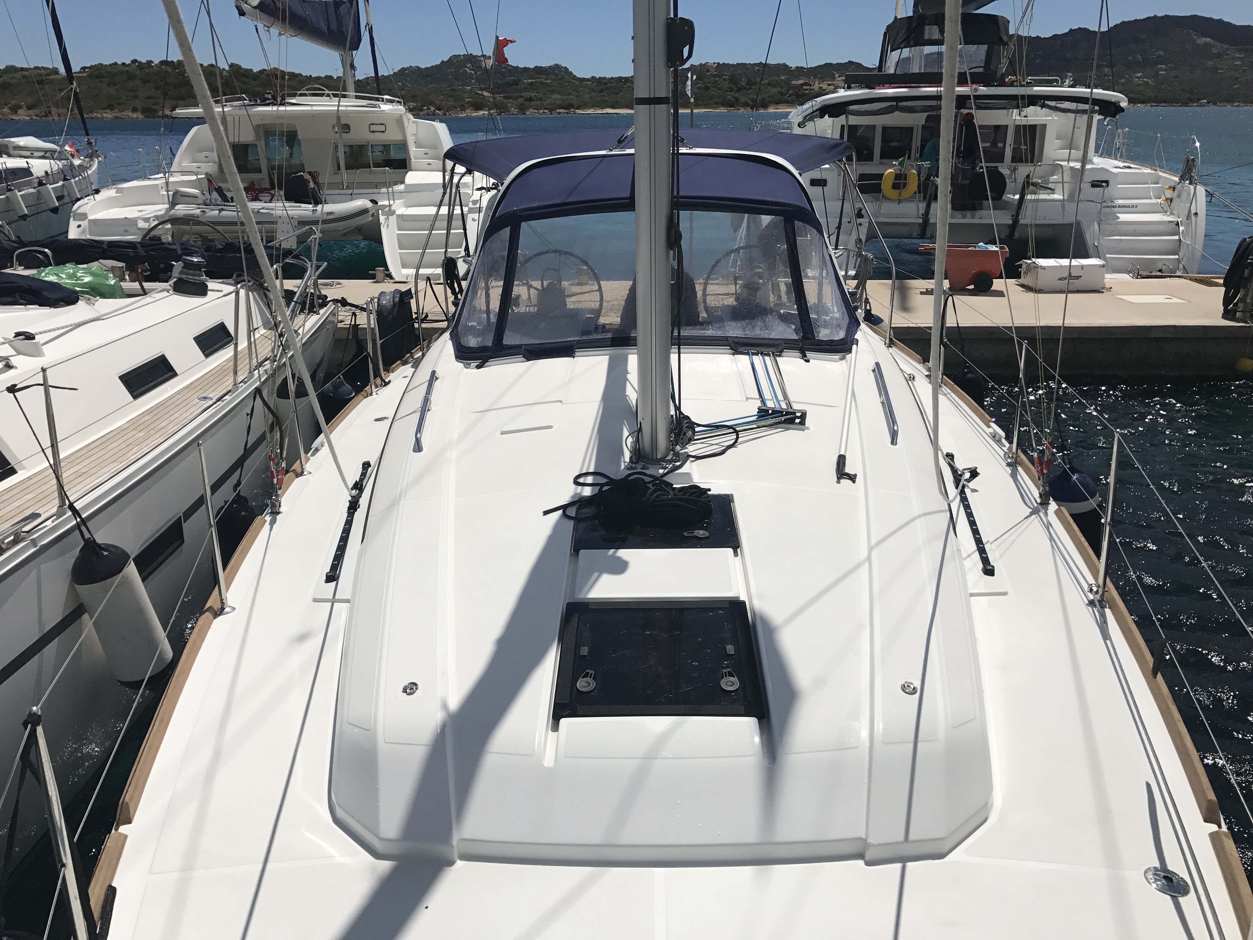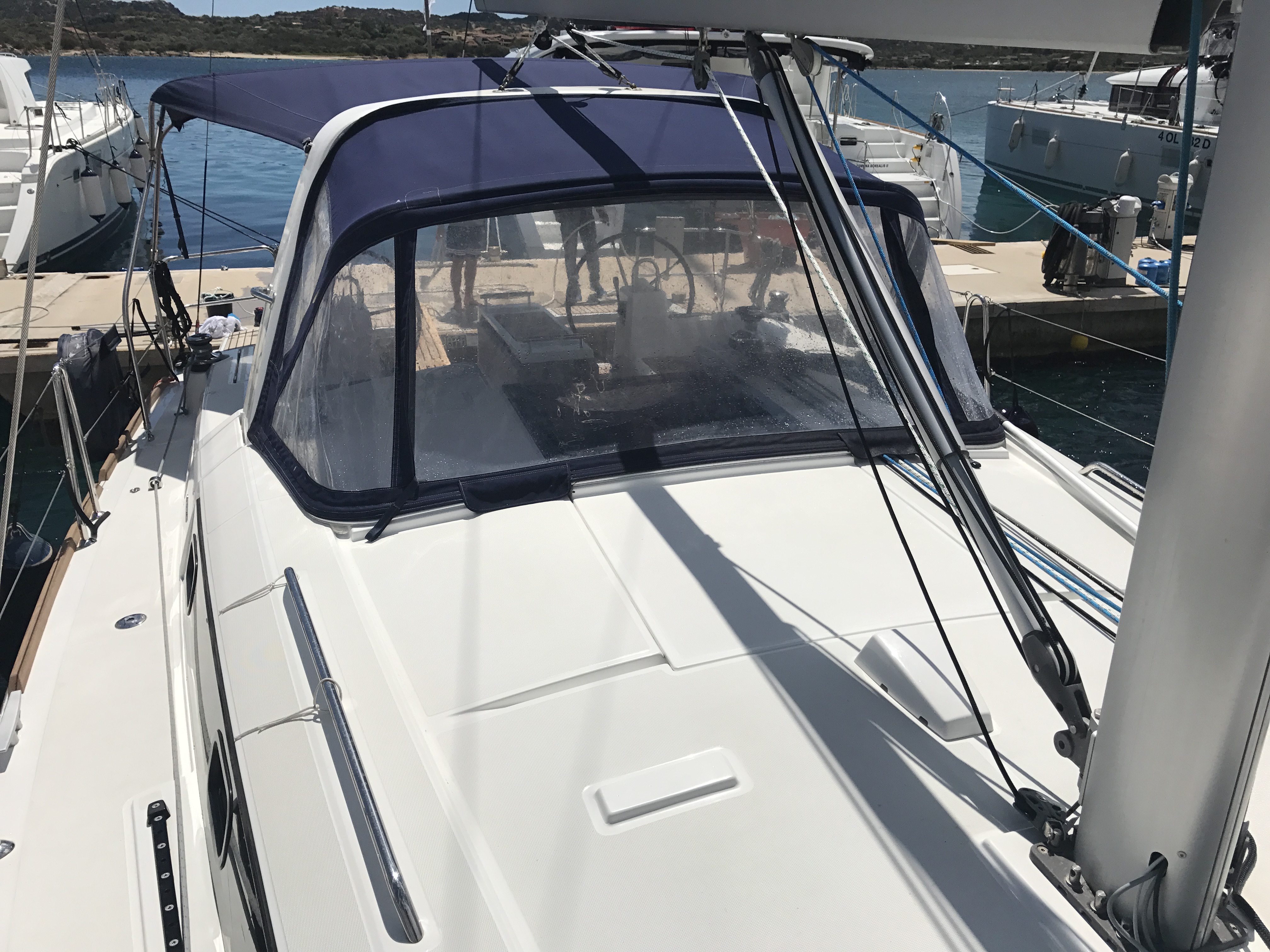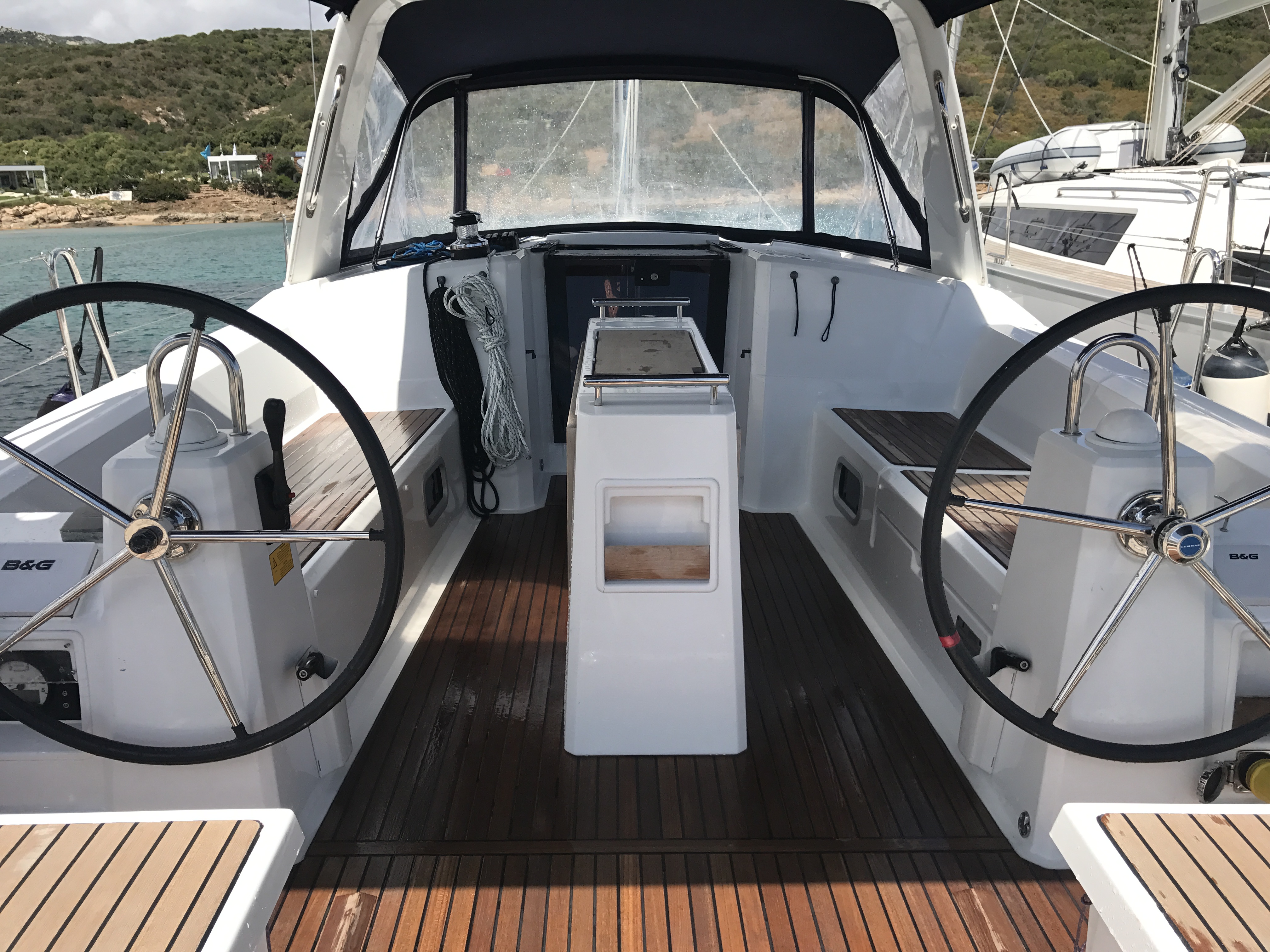 Autopilot, Auxiliary anchor, Auxiliary rudder, Biminitop, CD reader, Cockpit cushions, Cutlery, Dinghy, Distress flaires, Electric fridge, Electric toilets, Electric Winches, Electric windlass, Fire extinguishers, First aid kit, GPS + chart plotter, Life jackets, Liferaft, Shore power connection, Sprayhood, Steering wheel, Teak cockpit, VHF, Warm water, Wind instruments, Furling mainsail, Bow thruster, Cockpit Speakers