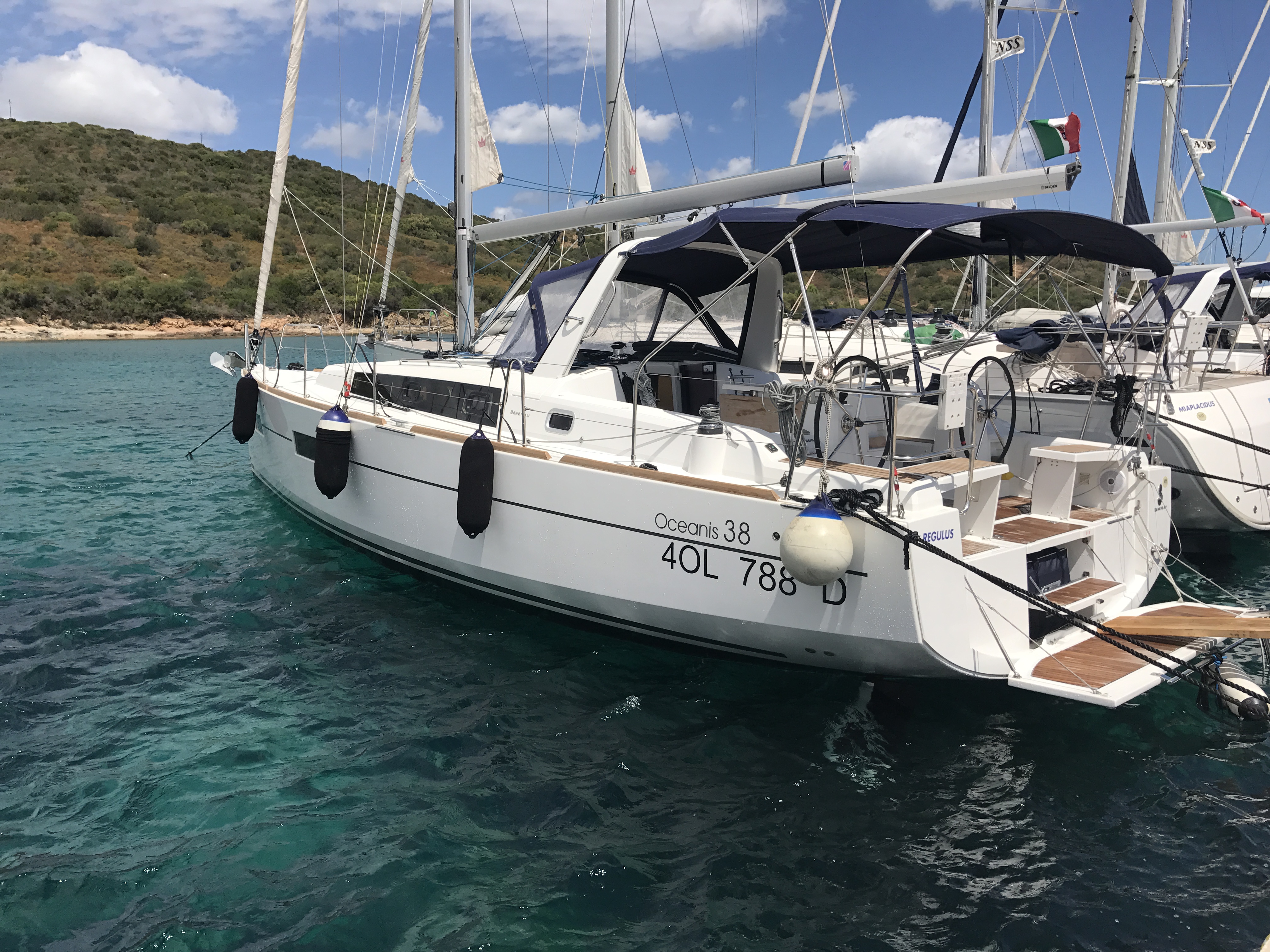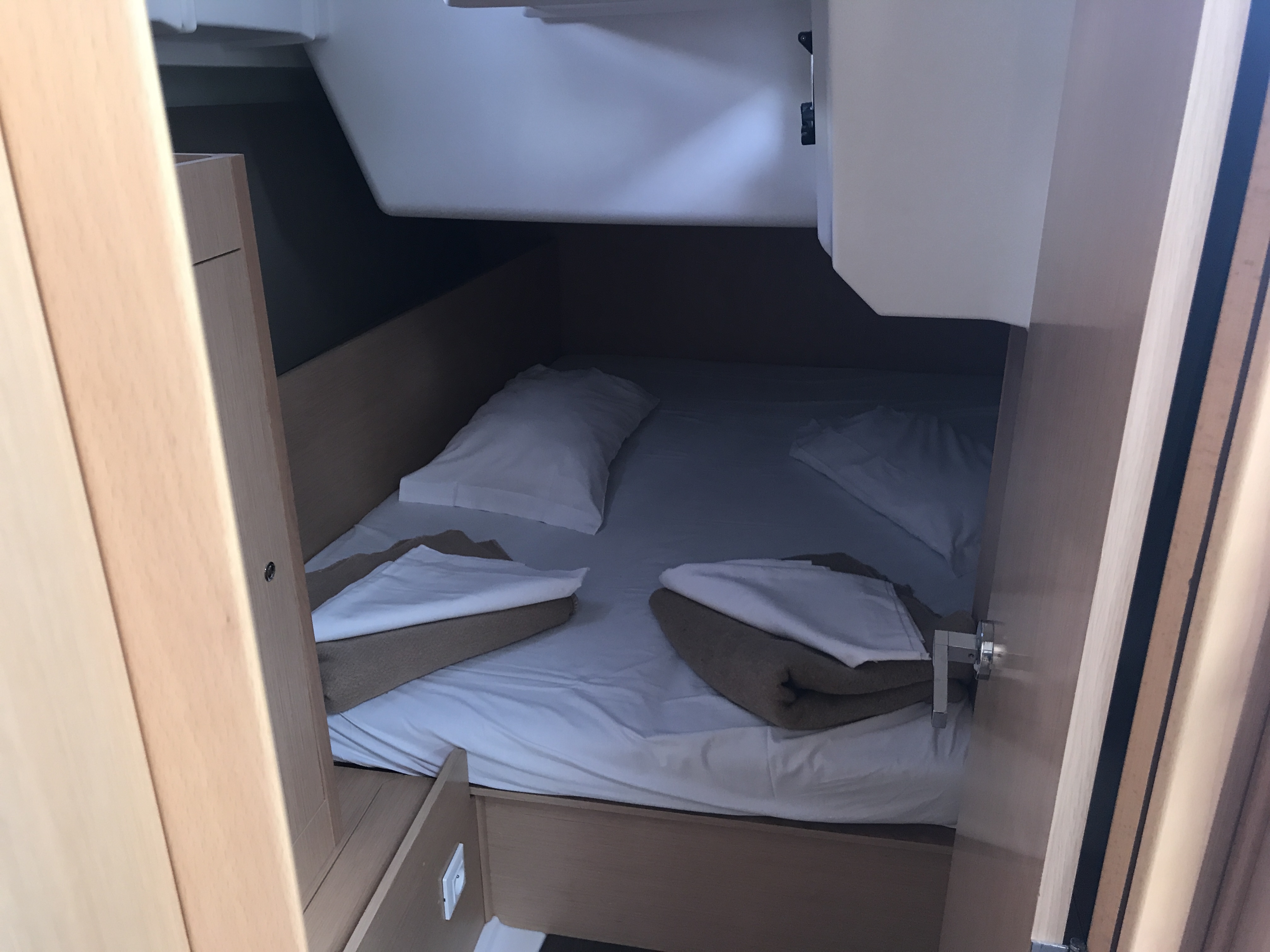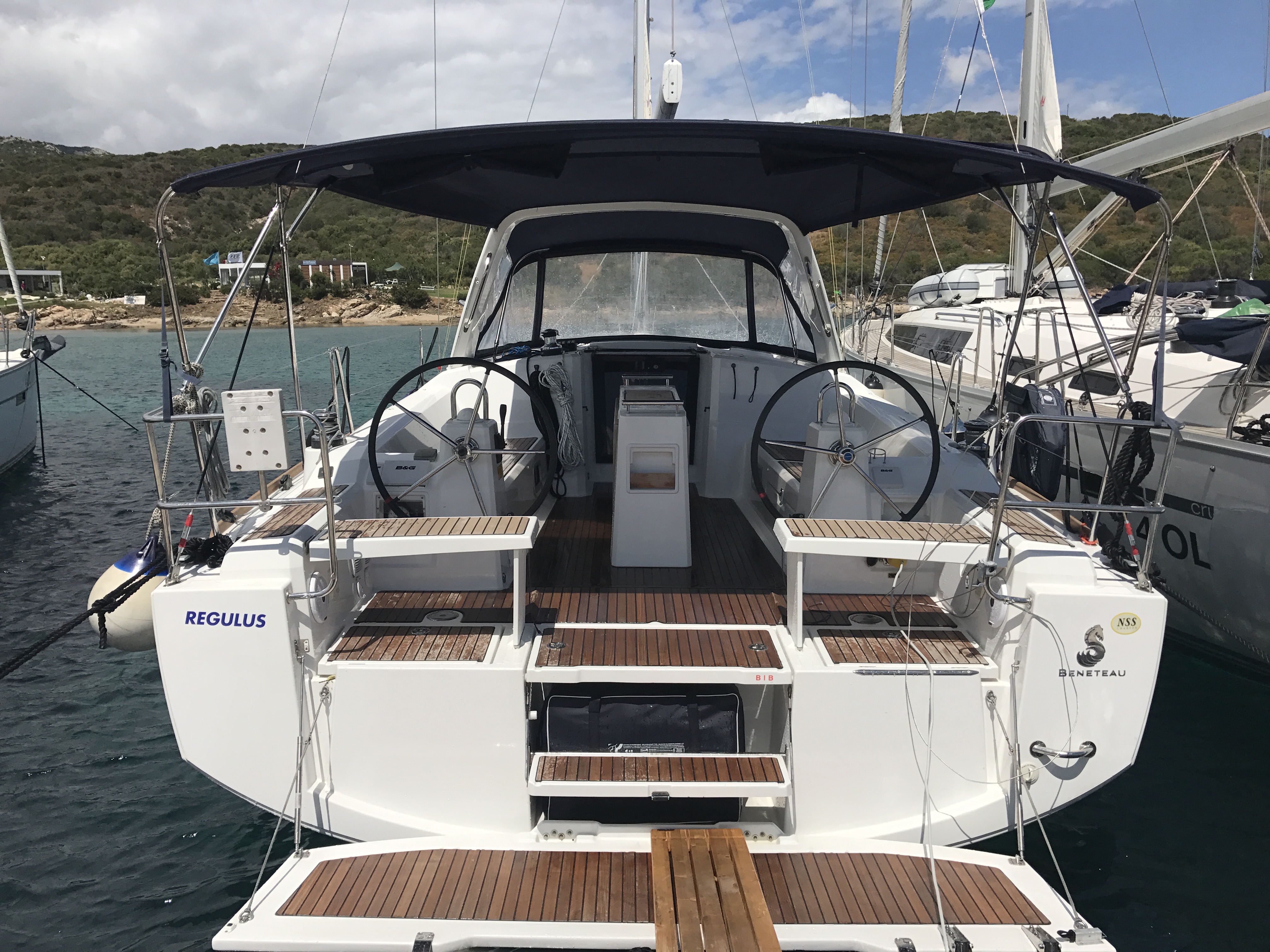 Autopilot, Auxiliary anchor, Auxiliary rudder, Biminitop, CD reader, Cockpit cushions, Cutlery, Dinghy, Distress flaires, Electric fridge, Electric toilets, Electric Winches, Electric windlass, Fire extinguishers, First aid kit, GPS + chart plotter, Life jackets, Liferaft, Shore power connection, Sprayhood, Steering wheel, Teak cockpit, VHF, Warm water, Wind instruments, Furling mainsail, Bow thruster, Cockpit Speakers