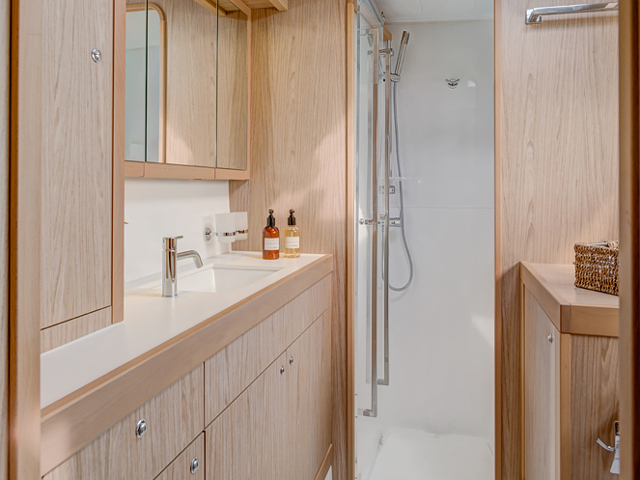 Life jackets, gas stove, battery charger, dinghy, 220 V shore connection, Service Battery (in Ah.), Cockpit Speakers, Radio/CD, Cooker with oven, Cutlery, dishes, Freezer, Refrigerator, Sinks, Autopilot, depth sounder, GPS Chartplotter, Log/Speedo, Main Deck Compass, Hot Water System, Lazy Bag, Rollgenua, Standard main sail, Bathing Platform, Bimini, cockpit shower, Electric Windlass, Gangway, sprayhood, hand towels, Linen, Nautical charts and nautical guide, Navigation kit, Pillows and blankets, Auxiliary anchor, Calibrated anchor chain, Distress flares, Fire extinguisher, First aid kit, Safety harness