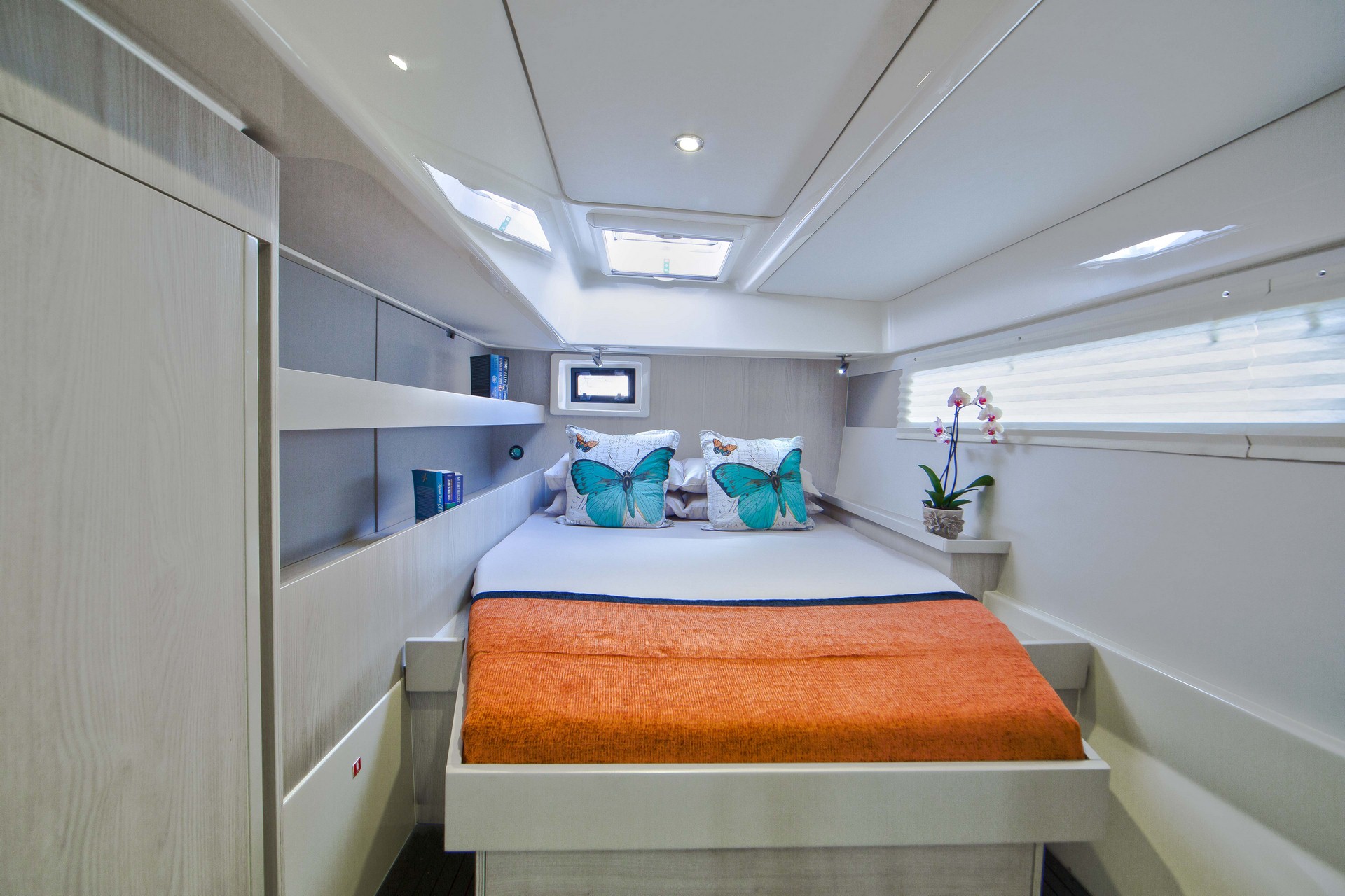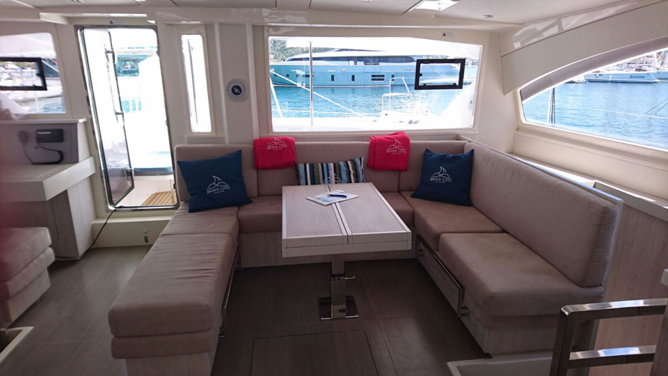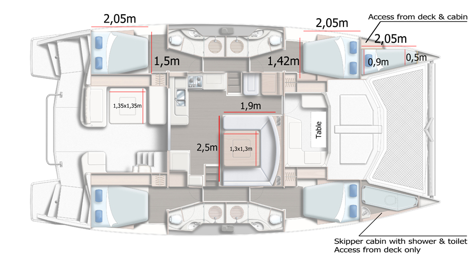 Bedlinen, Convertible saloon table double, Double bed (cabins+saloon), Double bed size, Double cabin, Forepeak cabin single, Showers (cabins+skipper cabin), Single bed, Single bed size, Single cabin, Toilets (cabins+skippers cabin), Air conditioning, Bimini Top, Cockpit Fridge, Electric toilet, Heating system, Hot water, Manual toilet, Speakers in salon and cockpit, Sprayhood, Steering Wheel, Watermaker with controller (on request), Boat type, Double berth (cabins+saloon), Double bunk, Front peak, Length, Number of double cabins, Number of heads (cabins+skipper cabins), Number of persons, Number of showers (cabins+skipper cabin), Number of single cabins, Salon, Number of holding tanks, Year built, Ballon fender - aft, Barometer, Boat hook, Brush for interior, Bucket, Chain for spare anchor, Deck brush with long handle, Diesel cannister, Dingy repair kit, Engine oil - spare, Fenders, Foot pump, Fuel mixture cannister, Funnel, Gangway, Gas bottle, Mooring ropes, Outboard mount, Padlock for outboarder, Tools and spares, Water hose, Winch handle - long, Winch handle - short, Windlass handle, Cockpit cushions, Cockpit shower, Cockpit speakers, Cockpit table, Cockpit table size, Outboard engine, Swimming ladder, Teak deck, VHF handset at helm station, Battery charger, Generator, Inverter, Solar Panel, Bathrooms with toilet, Bimini - top, Deck shower, Dinghy, Electricity: 230VAC with inverter, Furling genoa, GPS / chart plotter at helmstation, Outboard motor, Wheel steering, Aux/MP3 input jack, Bluetooth, Cabin fans, MP3, Double USB socket in cabins, Blender, Coffee maker, Double sink, Galley full equipped, Ice maker, Microwave, Oven, Beam, Displacement, Draft, Engines, Fuel tank, Length over all, Water tank, AIS, Autopilot, Auto pilot with joystick, Coloured chart plotter, Compass, Depth sounder, GPS, Radar, Speed Log, VHF, Wind direction, Wind instruments, Wind speed, Maximum, Recommended, Bell, Ditch bag, Drogue, Electric bilge pumps, Emergency tiller, EPIRB, Flares, Life raft, Life Vests, Manual bilge pumps, Medical kit, MOB Gear, Sea Anchor, Strobes, Tools and spares, Lazy Jacks with Lazy Bag, Roller genoa, Roller main sail, 12 V socket in helm station, 12 V socket in panel, 220 V socket, Davits for dinghy electric, Davits for dinghy electric, Fog Horn electric, Stove (3 burner gas hob), Bunk Beds, Skippers cabin single with toilet (access from deck only), Electric winches - sheets and halyard, Fridge/freezer (2-drawer, front opening, 212L), Towels, Dinghy
