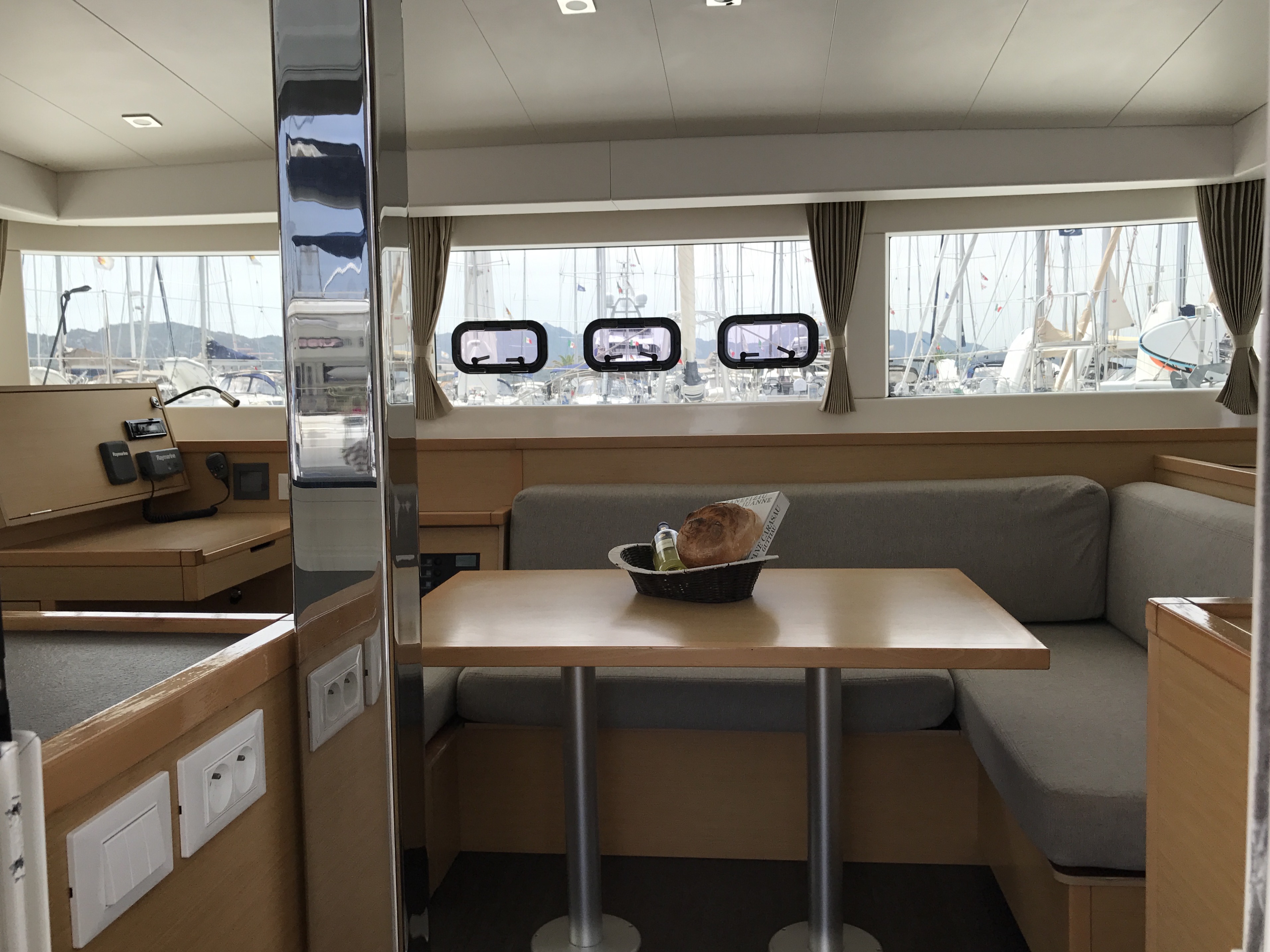 Gas stove with Oven, Microwave Oven, Pillows & Blankets, Radio + CD player, Refrigerator, Water heater, Autopilot, Barometer & Clock, Binoculars, Compass, Dividers, Triangle, pencils, Nautical charts for Sardinia & Corsica, Steering wheel, Bimini, Bucket, cleaning Brush, Sponge, Cockpit Shower, Sprayhood, Water Hose & Adaptors, Black Cone & Ball, Emergency Flares, Fire extinguisher, First Aid Kit, Life Harnesses, Lifejackets, Liferaft, Sound signal, Tool kit, Batten Mainsail with lazy-bag, Furling Genoa, Deep freezer, Double berth in salon, Anemometer, Wind indicator, GPS chartplotter, VHF Radio, Electrical Windlass, Cockpit table, Emergency tiller, Teak in cockpit, Flexible solar panels, Outside speakers, Dinghy, Fans in salon and cabins