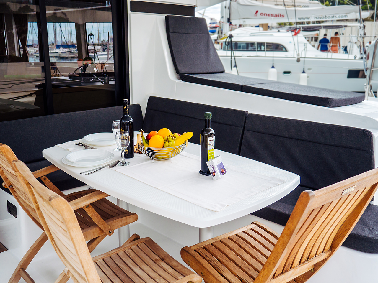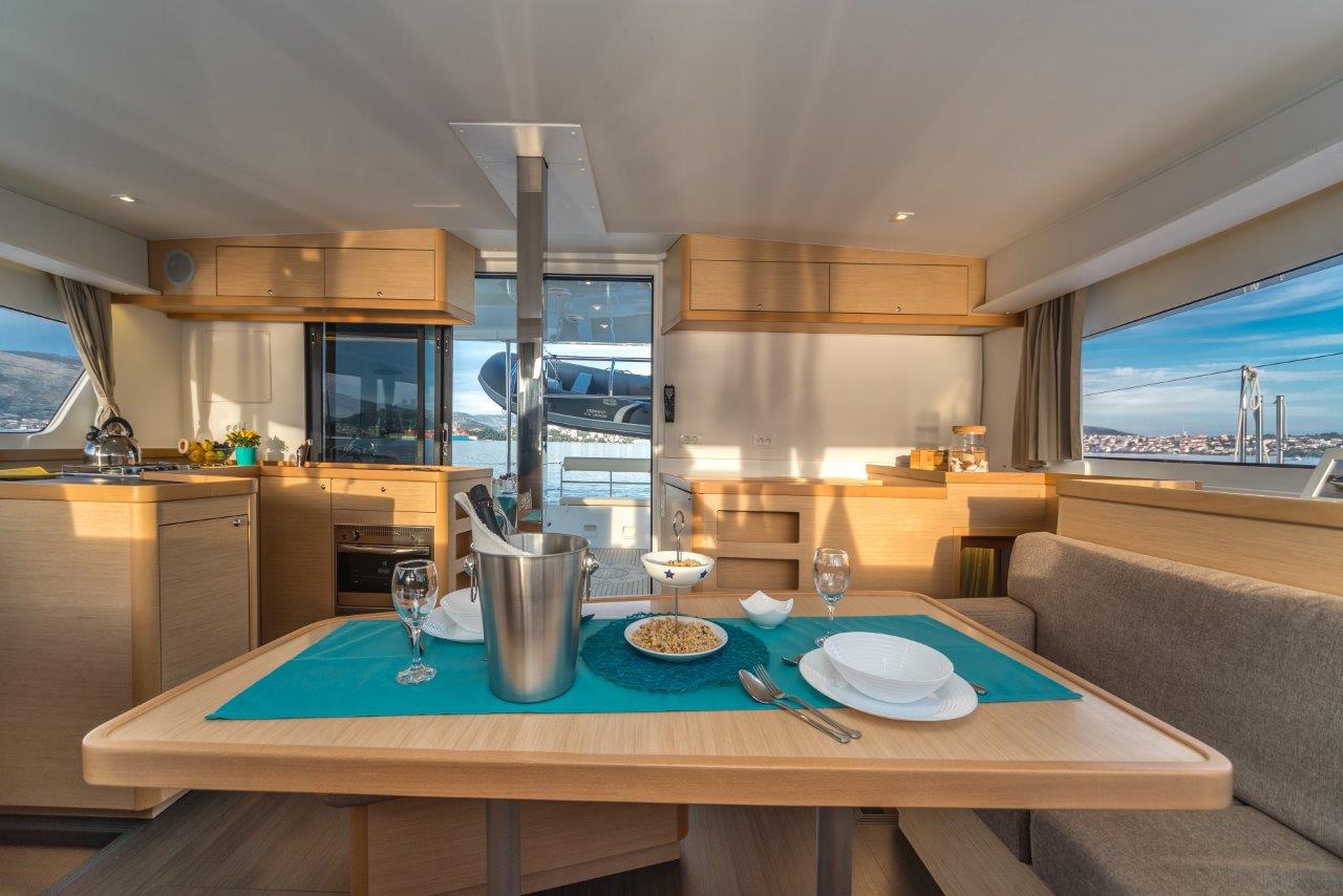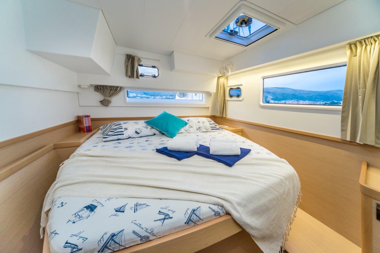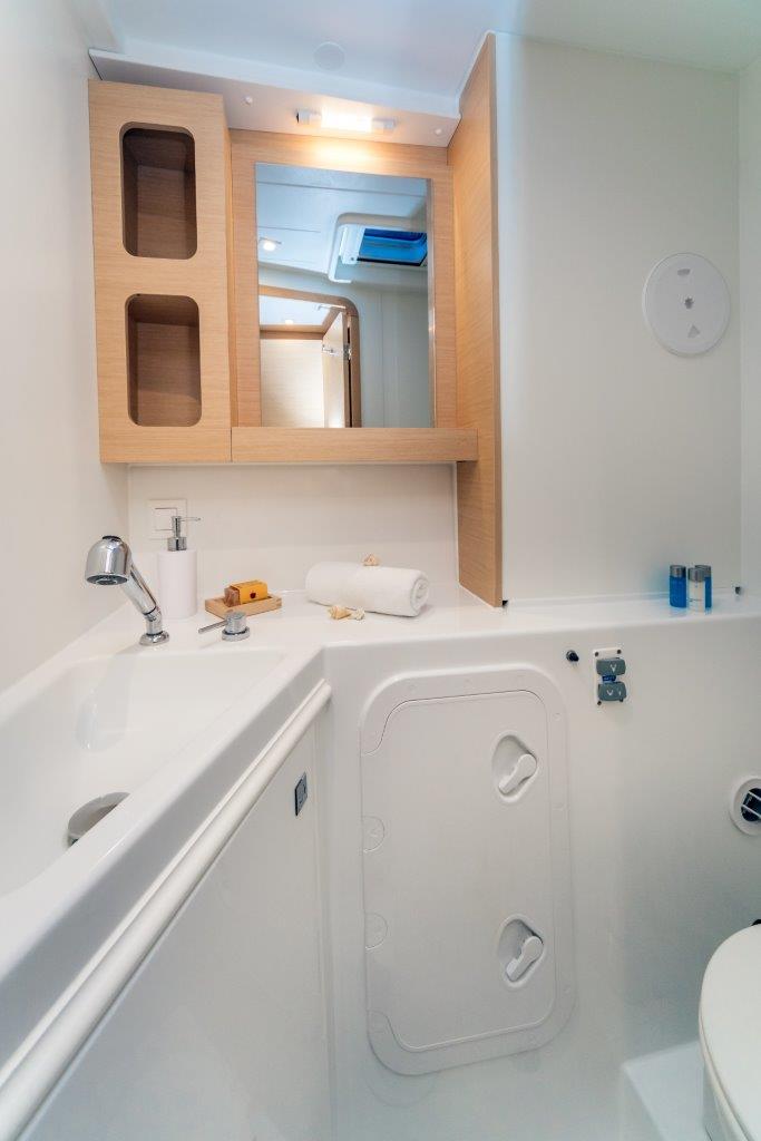 Dinghy Inflatable, 220 V shore connection, battery charger, Generator, Service Battery (in Ah.), Cockpit Speakers, Radio/CD, Freezer, additional refrigerator in saloon, Cooker with oven, Sinks, Cutlery, dishes, Autopilot, GPS Chartplotter, Log/Speedo, Main Deck Compass, Air Conditioning, fans in cabins, Heating, Hot Water System, Rollgenua, Standard main sail, cockpit shower, Cushions in cockpit, Electric Windlass, Auxiliary anchor, Calibrated anchor chain, Distress flares, Fire extinguisher, First aid kit, Lifebuoy, Life jackets, Liferaft, Main anchor, Safety harness