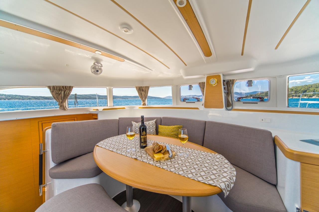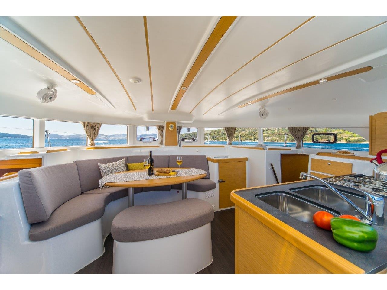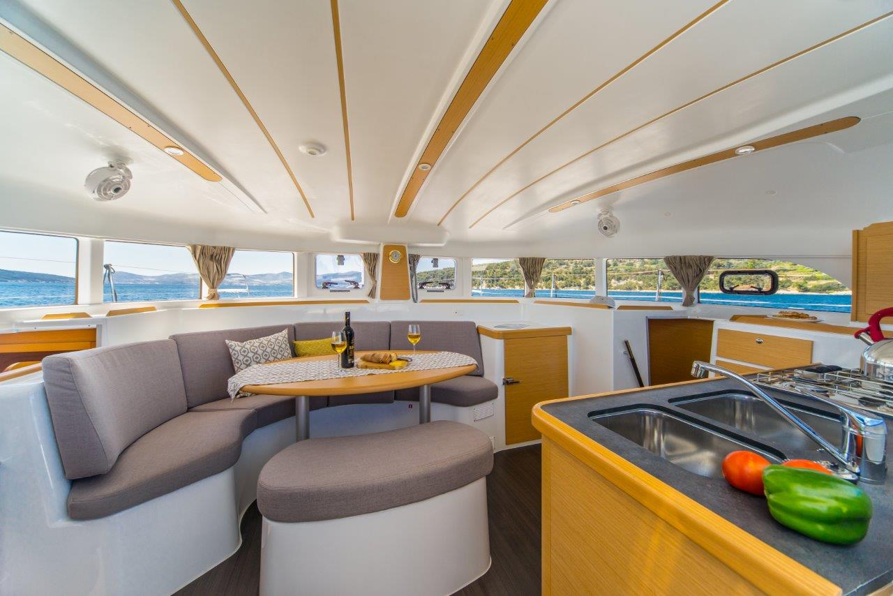 Dinghy Inflatable, 220 V shore connection, battery charger, Engine Battery (in Ah.), Service Battery (in Ah.), Cockpit Speakers, Radio/CD, Cooker (num.), gas stove, Refrigerator, Sinks, Autopilot, Chartplotter, GPS Chartplotter, Log/Speedo, Main Deck Compass, fans in cabins, Hot Water System, Rollgenua, cockpit shower, Cushions in cockpit, Electric Windlass, Auxiliary anchor, Calibrated anchor chain, Distress flares, Fire extinguisher, First aid kit, Lifebuoy, Life jackets, Main anchor, Safety harness, square top main sail, Solar Panel, teak cockpit, Heating, TV, Full batten Main Sail