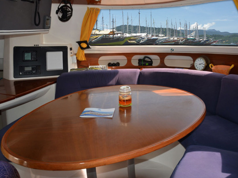 AIS, Autopilot, Barometer, Binoculars, Clock, Cockpit instruments, Color plotter, Compass, Echo sounder, Flags QNC, GPS, Hand bearing compass, Harbour guide, Log, Port plans on CD, Radar, Seacharts, Windmeter, 12 V socket, Bathing ladder, Battery charger + Land cable, Bilge pump, Bimini top, Coffee machine, Dinghy, Diving goggles, Electric bow, Electric refrigerator, Electric windlass, Fans, Gas bottle, Holding tank, Hot water, Ice box, Ice maker, Inverter (converter), Lazy jacks, Linen, Outboard, Outlet 220 V, Outside speakers, Oven, Pantry, Radio CD - MP3, Sail repair kit, Solar cells, Stern shower, Tool kit, Towels, Water maker, Wifi - WLAN, Emergency tiller, EPIRB, Life jackets, Lightning bouy, Navigation lights, Rescue boat, VHF
