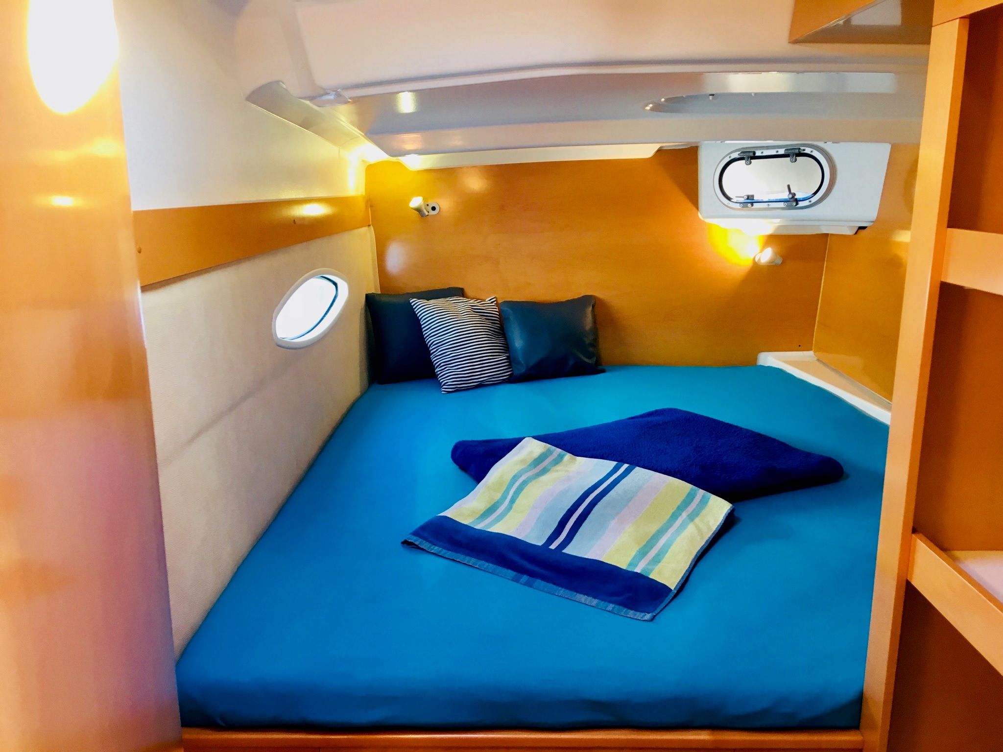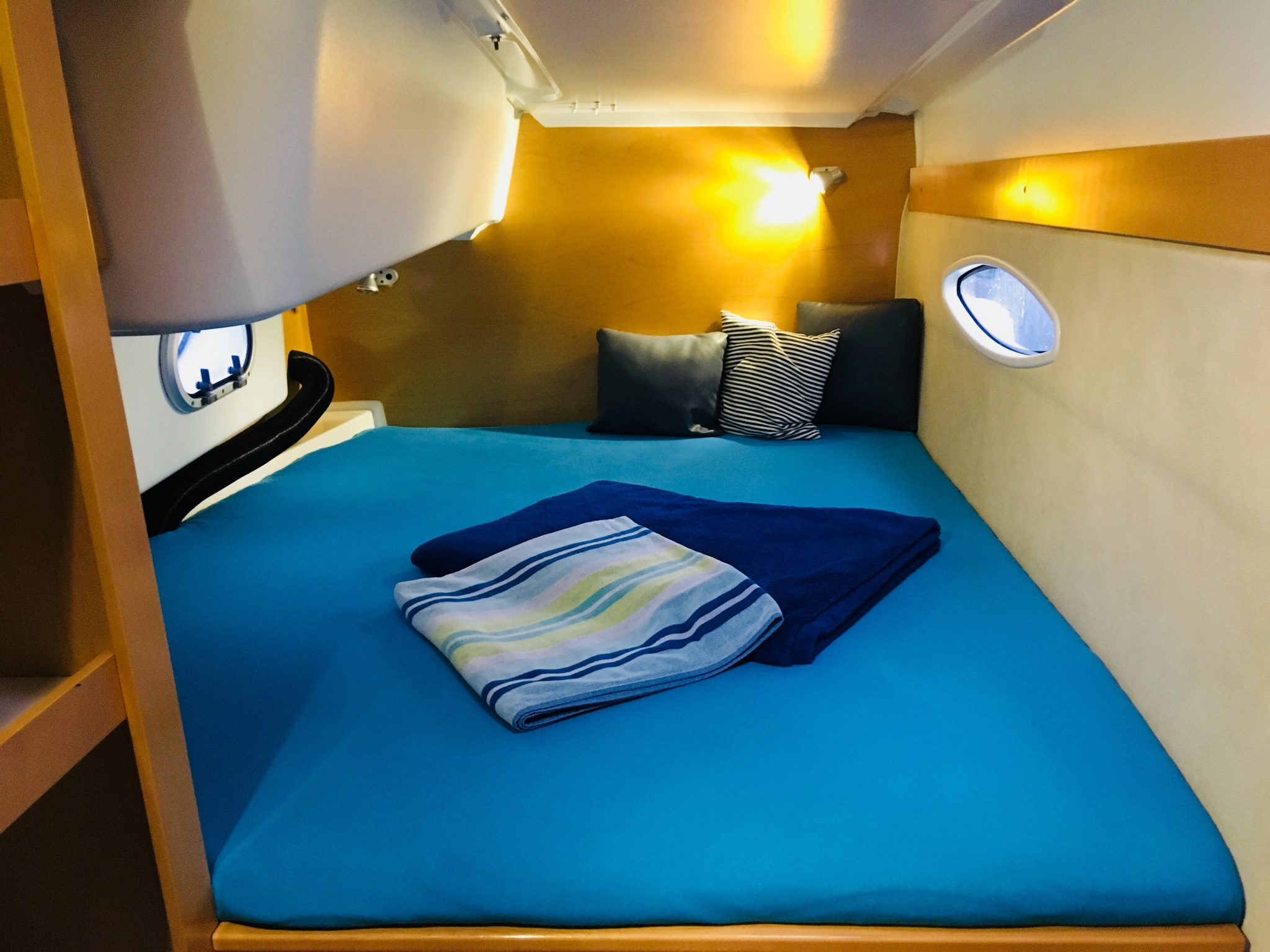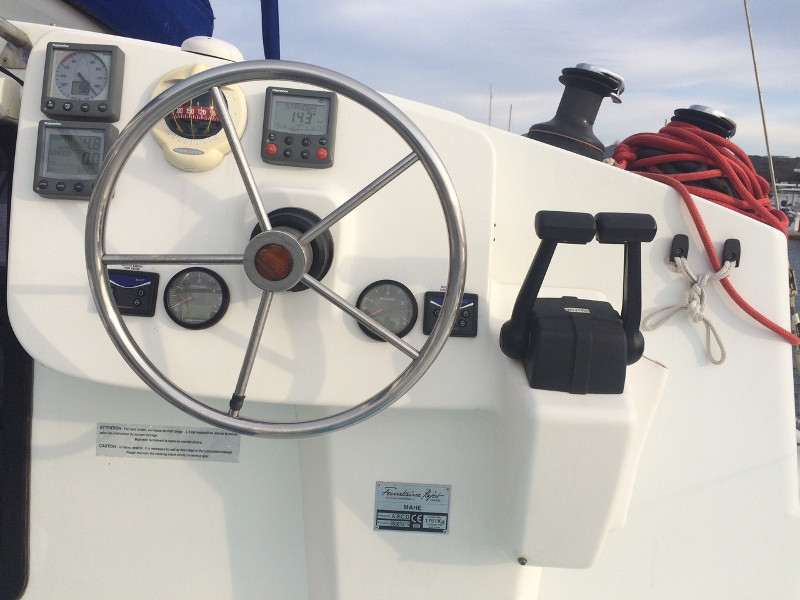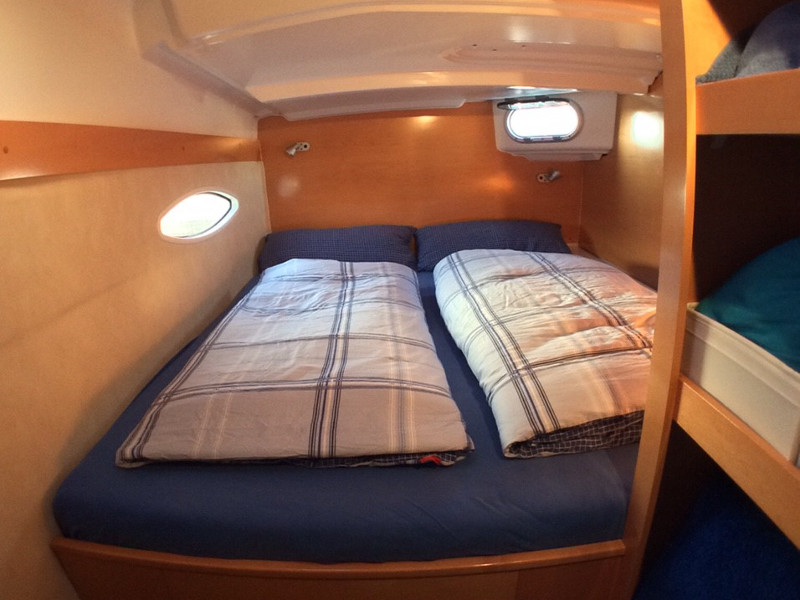 Convertible dinette, Full batten main sail, Solar Panel 100W, Full batten Main Sail, Autopilot, Bimini, Dinghy Inflatable, Echo Sounder, Electric Windlass, Genoa Furling, GPS Chartplotter, Hot Water System, Radio/CD, Bosuns chair, Box of flares, Emergency tiller, First aid kit, Flashlight, Floating light, Life belts, Life jackets, Life preserver, Liferaft, Navigation lights, Sea anchor, VHF, Barometer, Binoculars, Clock, Flag QNC, Hand bearing compass, List of lights, Main compass, Pilot book, Sea charts, Shortwave radio, Windex, Deck Shower, Refrigerator, 12 volt socket, 220 volt socket, Battery charger, Cockpit table, Electric bildge pump, Gangway, Onboard tools, Ships licence, Galley equipment, Gas bottle, Gas cooker, Depth sounder, Wind Speed, Holding tank