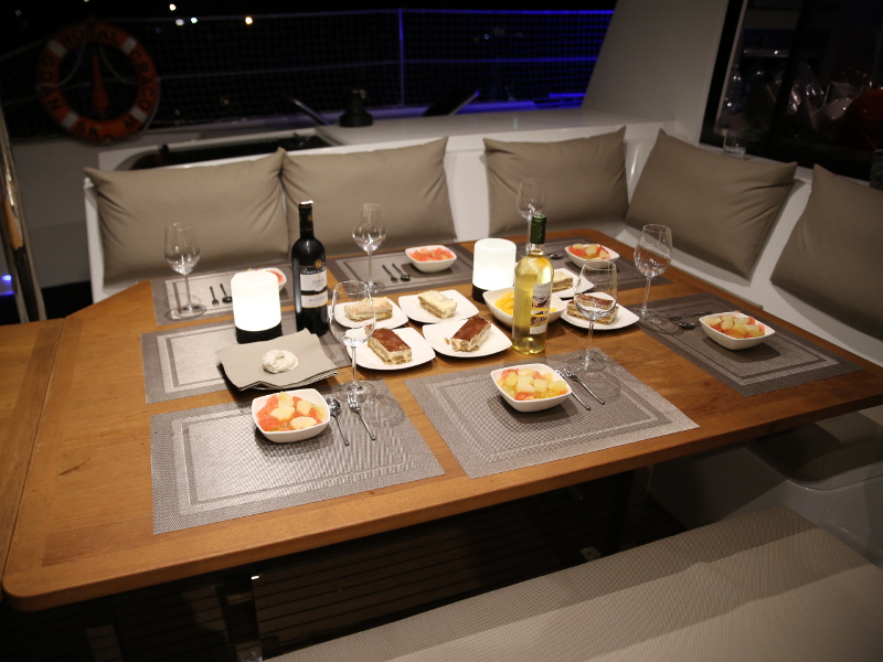 12 V Socket, Air condition, Cockpit cushions, Dinghy, Electric Anchor Windlass, Electric Winch, Fans, Fridge, Full batten main sail, Furling genoa, Lazy bag, Lazy jack, Microwave, Radio, Water maker, Bimini, Freezer, Gas Stove Oven, Sea bike, Snorkeling equipment, Tender, Wake board, Generator