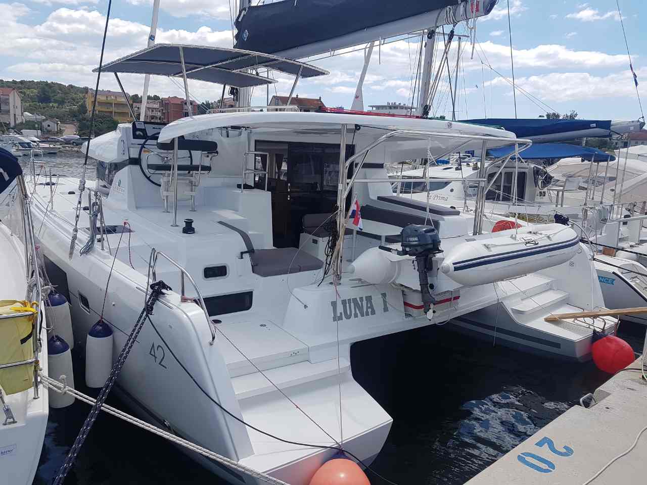 Autopilot, Battery charger, Cockpit shower, Depth speed, LCD TV with DVD or USB, Electrical bilge pump, Electrical water pump, Electric windlass, GPS chartplotter in cockpit, Hot water, Motor battery, Outside speakers, Radio with CD or MP3 player, Refrigerator 12V, Roll genoa, Service battery, VHF, Wind, Anchor + chain, Black ball, Black cone, Boat hook, Bucket, Deckbrush, Dinghy, Emergency helm, Funnel, Gangway, Gas bottles, Jerrycan for fuel, Jerrycan for water, Lifebuoy with light, Oars for dinghy, Outboard engine holder, Pump for dinghy, Radar reflector, Round fenders, Second anchor + chain, Shore power line, Sponge, Water hose, Barometer, Binocular, Clock, Divider, Handbearing compass, Navigation charts set, Navigation ruler, Pen and pencil set, Pilot book, Triangle, Bosun chair, Distress flares box, Fire extinguishers, First aid kit, Flash lamp, Foghorn, Tool set, Windlass handle, Windlass remote control, Life jackets, Flat fenders, Life raft, Aircondition, Heating, Radar, Generator, Bimini, Electric Deck Winch, Full Battened Mainsail, Lazy bag, Flybridge, Solar Charger, WiFi