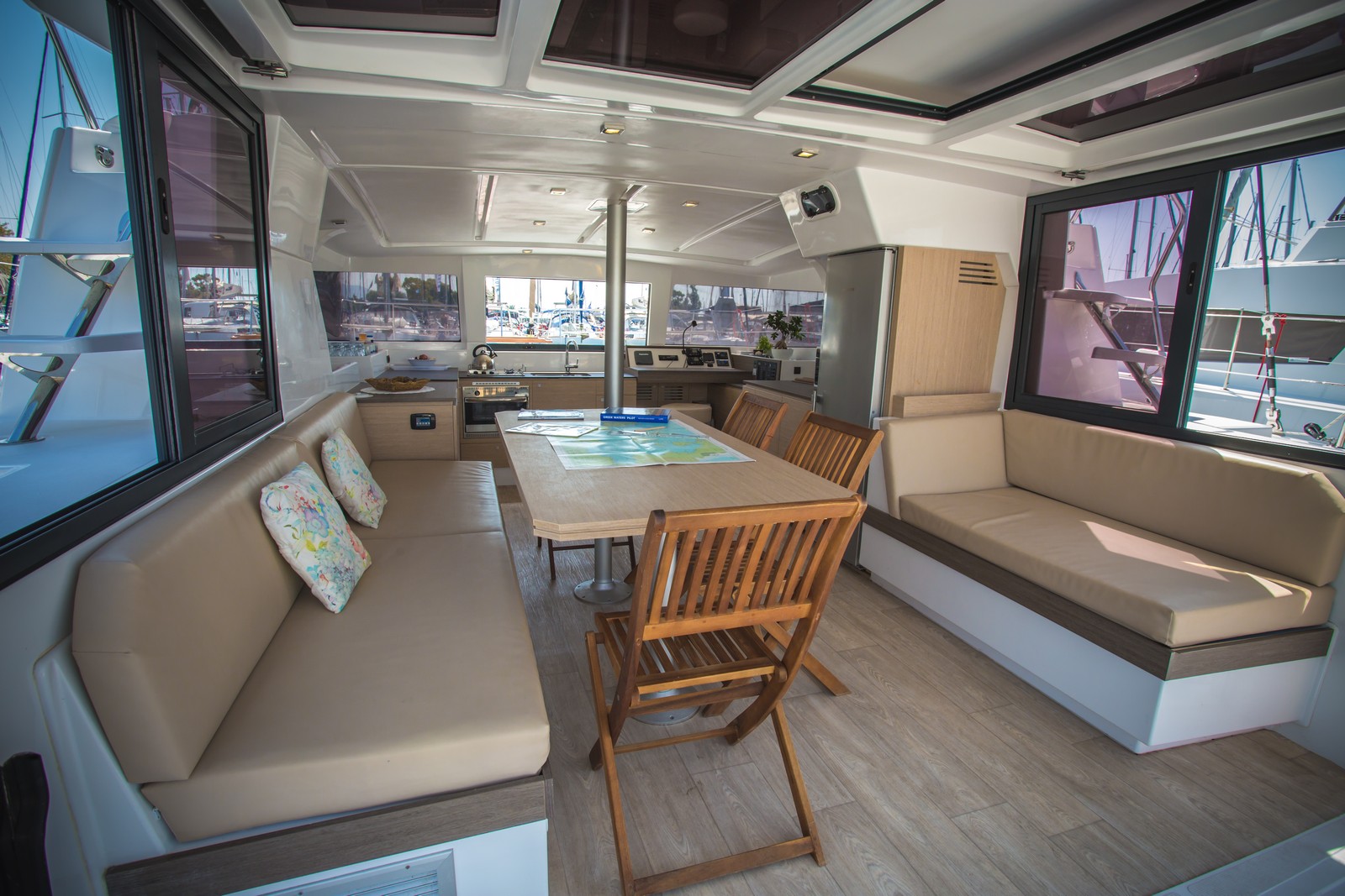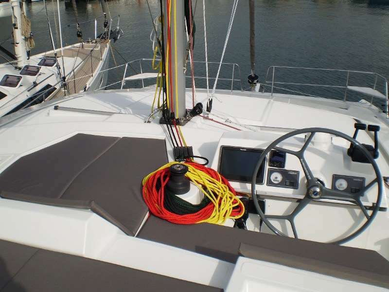 Battened mainsail, Bimini top, Electronic instruments, GPS plotter on cokcpit, Outboard motor (extra charge), Radio CD player, Solar panel, Sprayhood, Autopilot 7000, Refrigerator, Deck Shower, Solar Panel, Life jacket, Main Sail Full Batten/Lazy Jack, Nautical charts and nautical guide, Spray hood, Main Deck Compass, Depth Gauge, Lazy Bag, Lazy Jack, First aid kit, Fire extinguisher, Auxiliary anchor, Distress flares, Liferaft, Main anchor, Safety harness, Air conditioning (extra charge), Generator, Log/Speedo, Anchor, Full batten Main Sail, Bimini, Electric Windlass, Hot Water System, Heating, Cooker with oven, Cockpit Speakers, Wind Speed Indicator/Network Wind, Speedometer, Radio/CD, Echo Sounder, Autopilot, GPS Chartplotter, Dinghy Inflatable, Steering wheel, Genoa Furling
