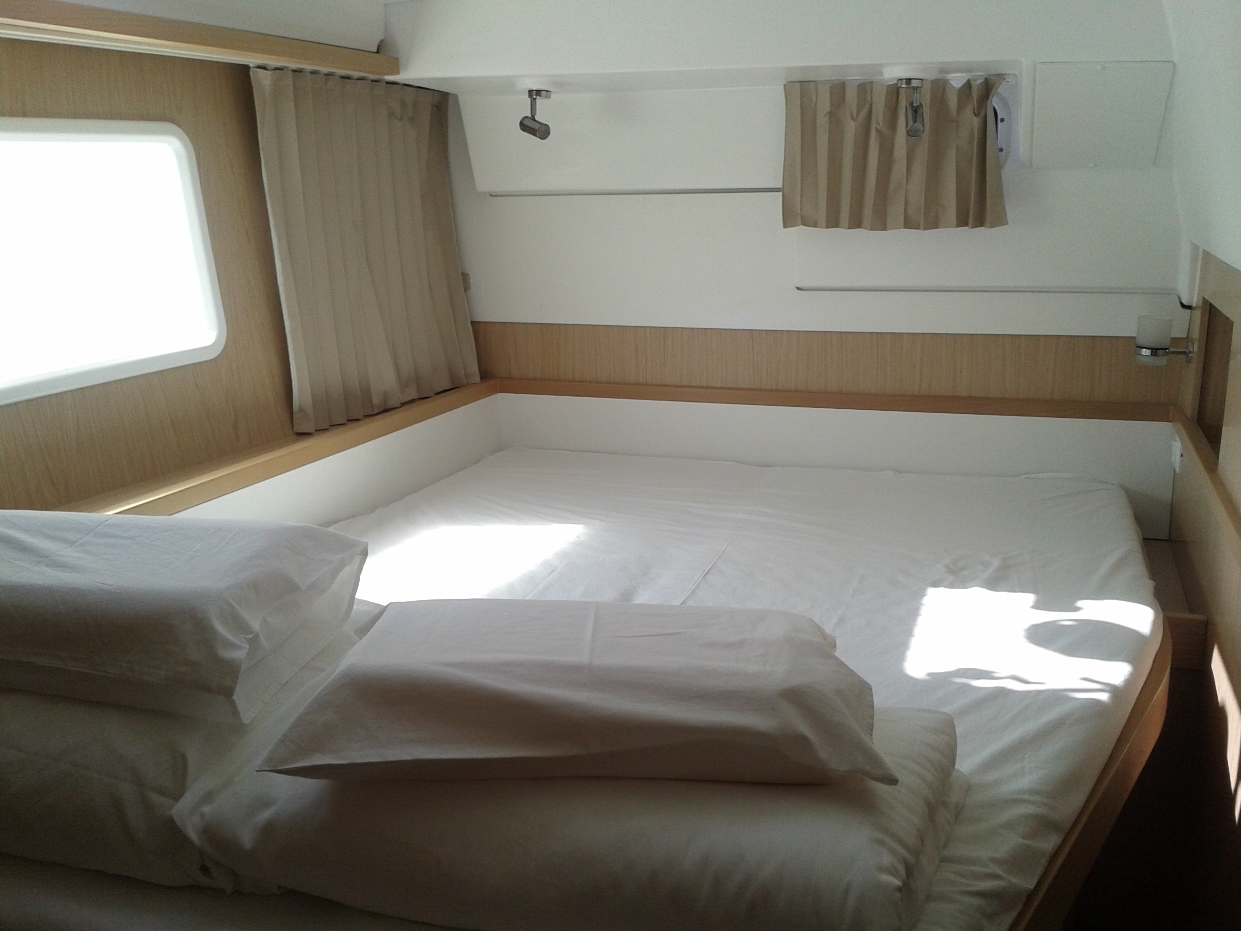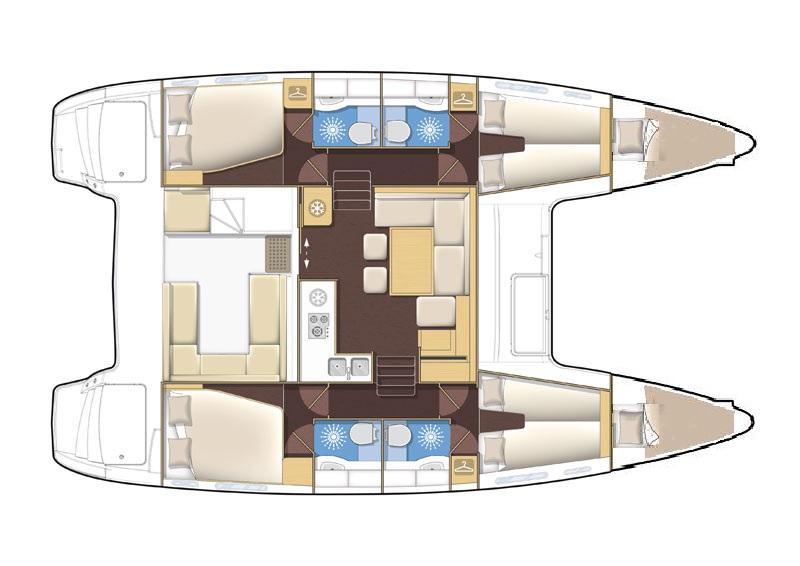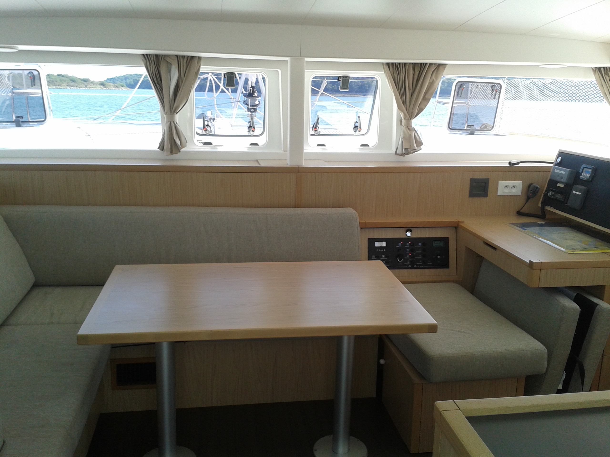 Autopilot, Battery charger, Cockpit shower, Depth speed, LCD TV with DVD or USB, Electrical bilge pump, Electrical water pump, Electric windlass, GPS chartplotter in cockpit, Hot water, Motor battery, Outside speakers, Radio with CD or MP3 player, Refrigerator 12V, Roll genoa, Service battery, VHF, Wind, Anchor + chain, Black ball, Black cone, Boat hook, Bucket, Deckbrush, Dinghy, Emergency helm, Funnel, Gangway, Gas bottles, Jerrycan for fuel, Jerrycan for water, Lifebuoy with light, Oars for dinghy, Outboard engine holder, Pump for dinghy, Radar reflector, Round fenders, Second anchor + chain, Shore power line, Sponge, Water hose, Barometer, Binocular, Clock, Divider, Handbearing compass, Navigation charts set, Navigation ruler, Pen and pencil set, Pilot book, Triangle, Bosun chair, Distress flares box, Fire extinguishers, First aid kit, Flash lamp, Foghorn, Tool set, Windlass handle, Windlass remote control, Life jackets, Flat fenders, Aircondition, Heating, Bimini, Electric Deck Winch, Full Battened Mainsail, Radar, Lazy bag, Flybridge, Solar Charger, WiFi