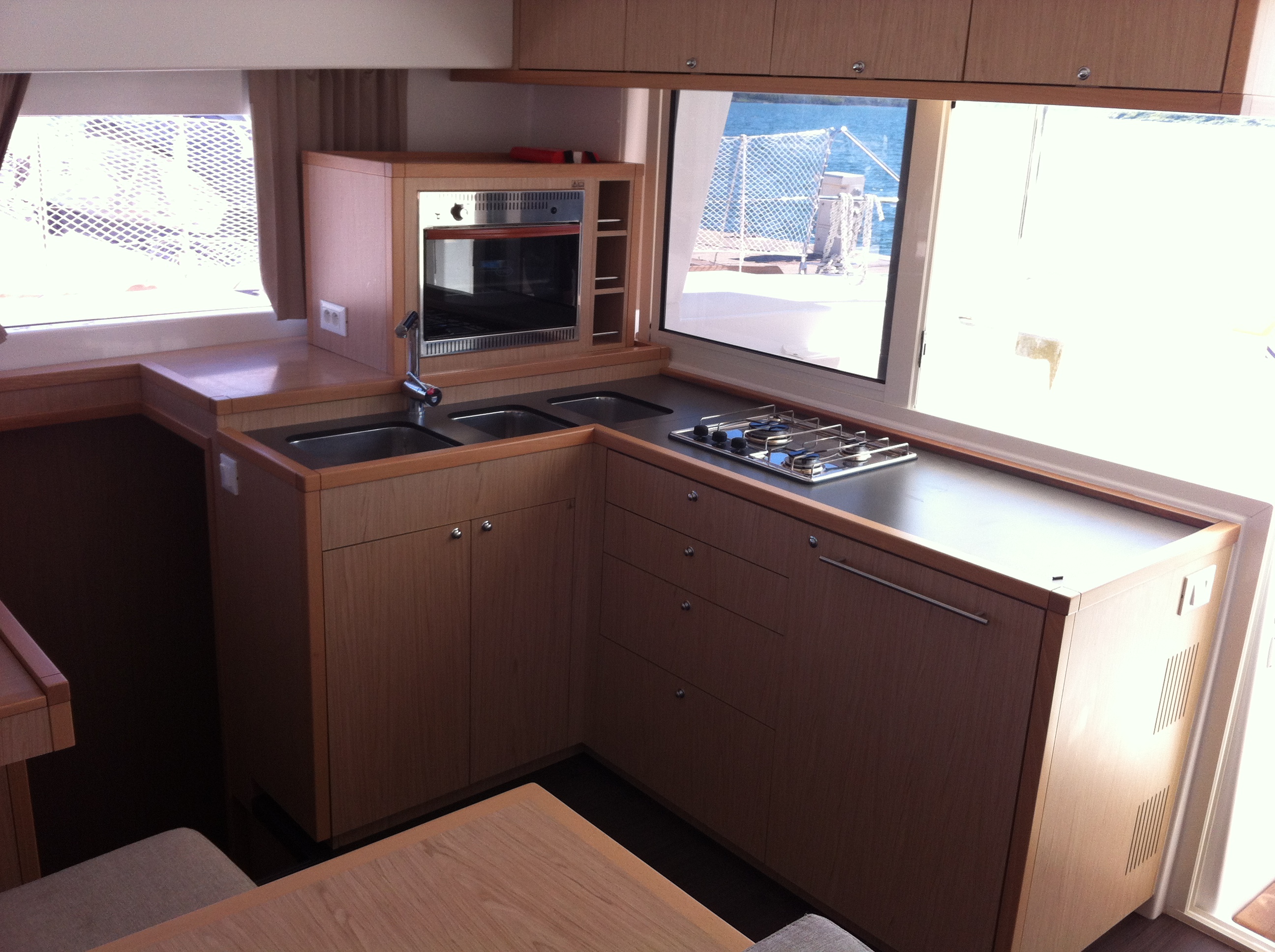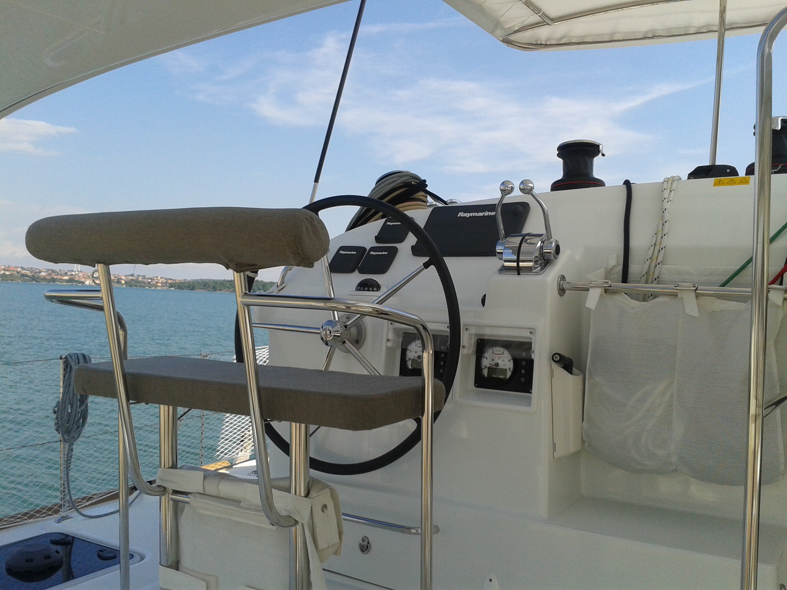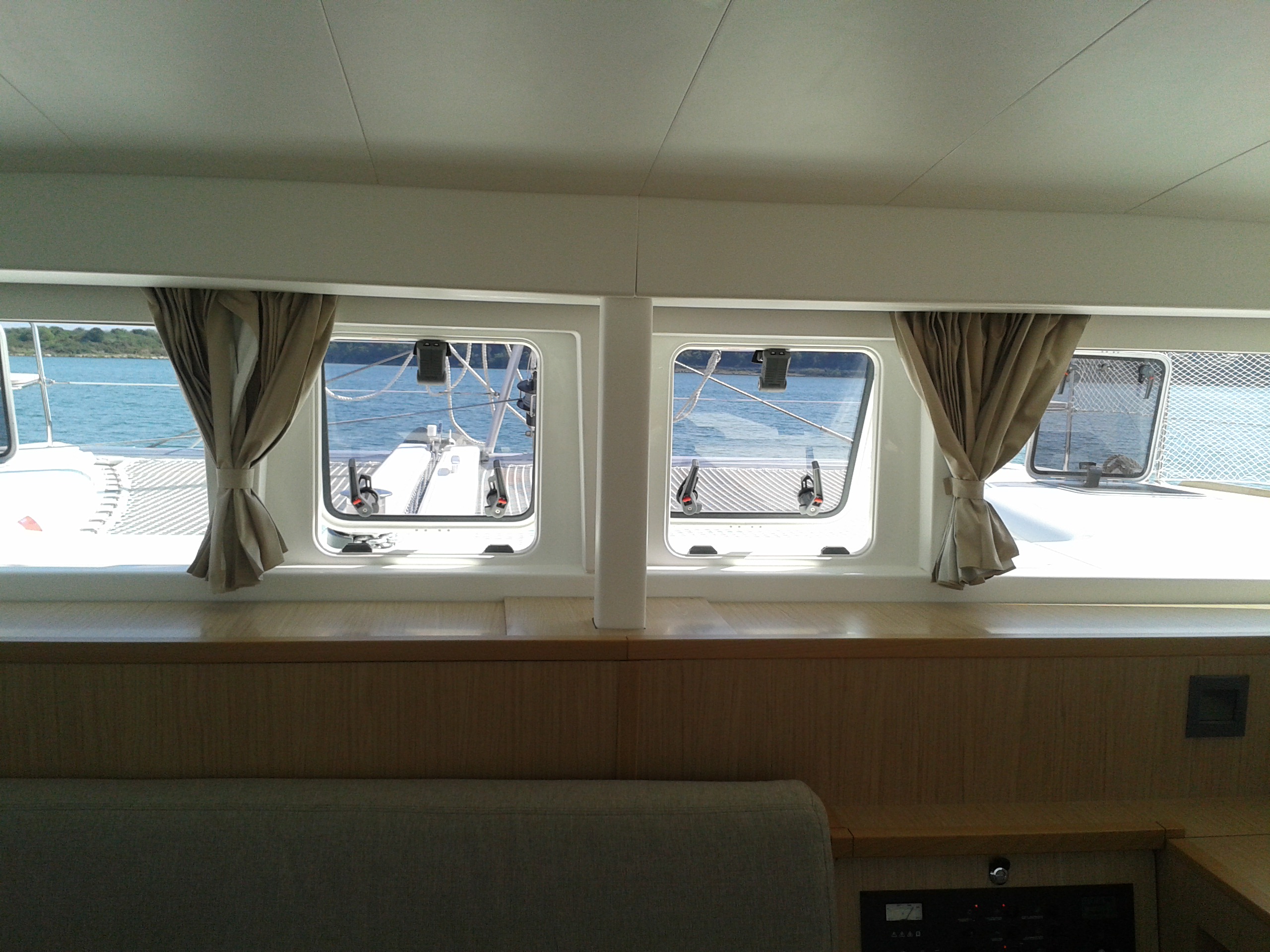 Autopilot, Battery charger, Cockpit shower, Depth speed, LCD TV with DVD or USB, Electrical bilge pump, Electrical water pump, Electric windlass, GPS chartplotter in cockpit, Hot water, Motor battery, Outside speakers, Radio with CD or MP3 player, Refrigerator 12V, Roll genoa, Service battery, VHF, Wind, Anchor + chain, Black ball, Black cone, Boat hook, Bucket, Deckbrush, Dinghy, Emergency helm, Funnel, Gangway, Gas bottles, Jerrycan for fuel, Jerrycan for water, Lifebuoy with light, Oars for dinghy, Outboard engine holder, Pump for dinghy, Radar reflector, Round fenders, Second anchor + chain, Shore power line, Sponge, Water hose, Barometer, Binocular, Clock, Divider, Handbearing compass, Navigation charts set, Navigation ruler, Pen and pencil set, Pilot book, Triangle, Bosun chair, Distress flares box, Fire extinguishers, First aid kit, Flash lamp, Foghorn, Tool set, Windlass handle, Windlass remote control, Life jackets, Flat fenders, Aircondition, Heating, Bimini, Electric Deck Winch, Full Battened Mainsail, Radar, Lazy bag, Flybridge, Solar Charger, WiFi