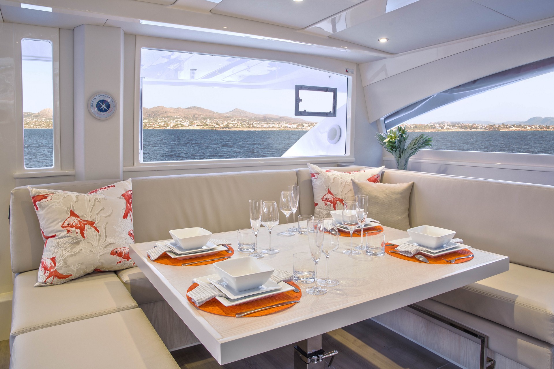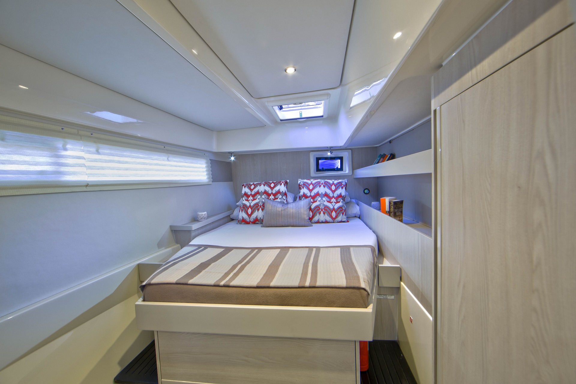 Bedlinen, Bunk Beds, Convertible saloon table double, Double bed size, Double cabin, Forepeak cabin single, Showers (cabins+skipper cabin), Single bed, Single bed size, Single cabin, Toilets (cabins+skippers cabin), Air conditioning, Bimini Top, Cockpit Fridge, Electric toilet, Heating system, Hot water, Manual toilet, Speakers in salon and cockpit, Sprayhood, Steering Wheel, Watermaker with controller (on request), Boat type, Double bunk, Front peak, Length, Number of double cabins, Number of heads (cabins+skipper cabins), Number of persons, Number of showers (cabins+skipper cabin), Number of single cabins, Salon, Number of holding tanks, Year built, Ballon fender - aft, Barometer, Boat hook, Brush for interior, Bucket, Chain for spare anchor, Deck brush with long handle, Diesel cannister, Dingy repair kit, Engine oil - spare, Fenders, Foot pump, Fuel mixture cannister, Funnel, Gangway, Gas bottle, Mooring ropes, Outboard mount, Padlock for outboarder, Tools and spares, Water hose, Winch handle - long, Winch handle - short, Windlass handle, Cockpit cushions, Cockpit shower, Cockpit speakers, Cockpit table, Cockpit table size, Outboard engine, Swimming ladder, Teak deck, VHF handset at helm station, Battery charger, Generator, Inverter, Solar Panel, Bathrooms with toilet, Bimini - top, Deck shower, Dinghy, Electricity: 230VAC with inverter, Furling genoa, GPS / chart plotter at helmstation, Outboard motor, Wheel steering, Aux/MP3 input jack, Bluetooth, Cabin fans, MP3, Blender, Coffee maker, Double sink, Galley full equipped, Ice maker, Microwave, Oven, Beam, Displacement, Draft, Engines, Fuel tank, Length over all, Water tank, AIS, Autopilot, Auto pilot with joystick, Coloured chart plotter, Compass, Depth sounder, GPS, Radar, Speed Log, VHF, Wind direction, Wind instruments, Wind speed, Maximum, Recommended, Bell, Ditch bag, Drogue, Electric bilge pumps, Emergency tiller, EPIRB, Flares, Life raft, Life Vests, Manual bilge pumps, Medical kit, MOB Gear, Sea Anchor, Strobes, Tools and spares, Lazy Jacks with Lazy Bag, Roller genoa, Roller main sail, 12 V socket in helm station, 12 V socket in panel, 220 V socket, Davits for dinghy electric, Davits for dinghy electric, Double bed (cabins+saloon), Double berth (cabins+saloon), Fog Horn electric, Double USB socket in cabins, Stove (3 burner gas hob), Skippers cabin single with toilet (access from deck only), Electric winches - sheets and halyard, Fridge/freezer (2-drawer, front opening, 212L), Towels, Dinghy